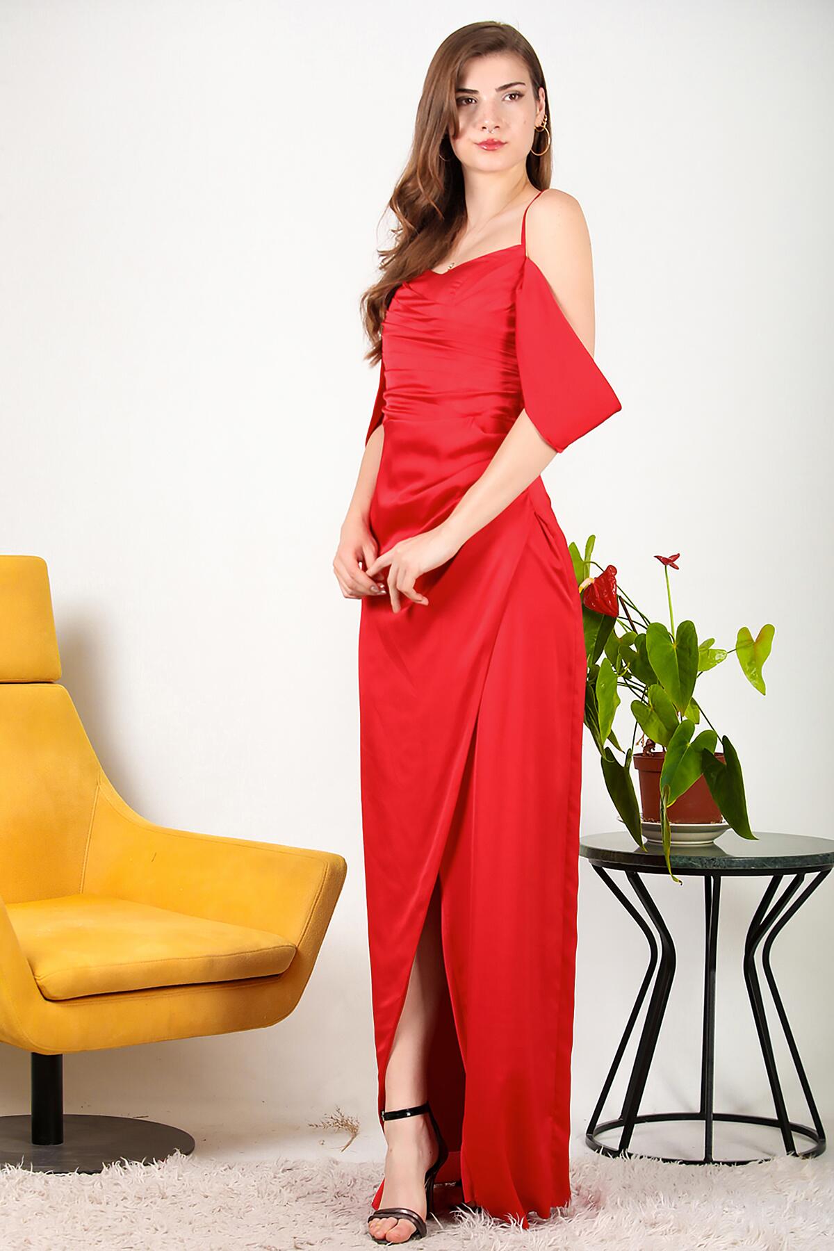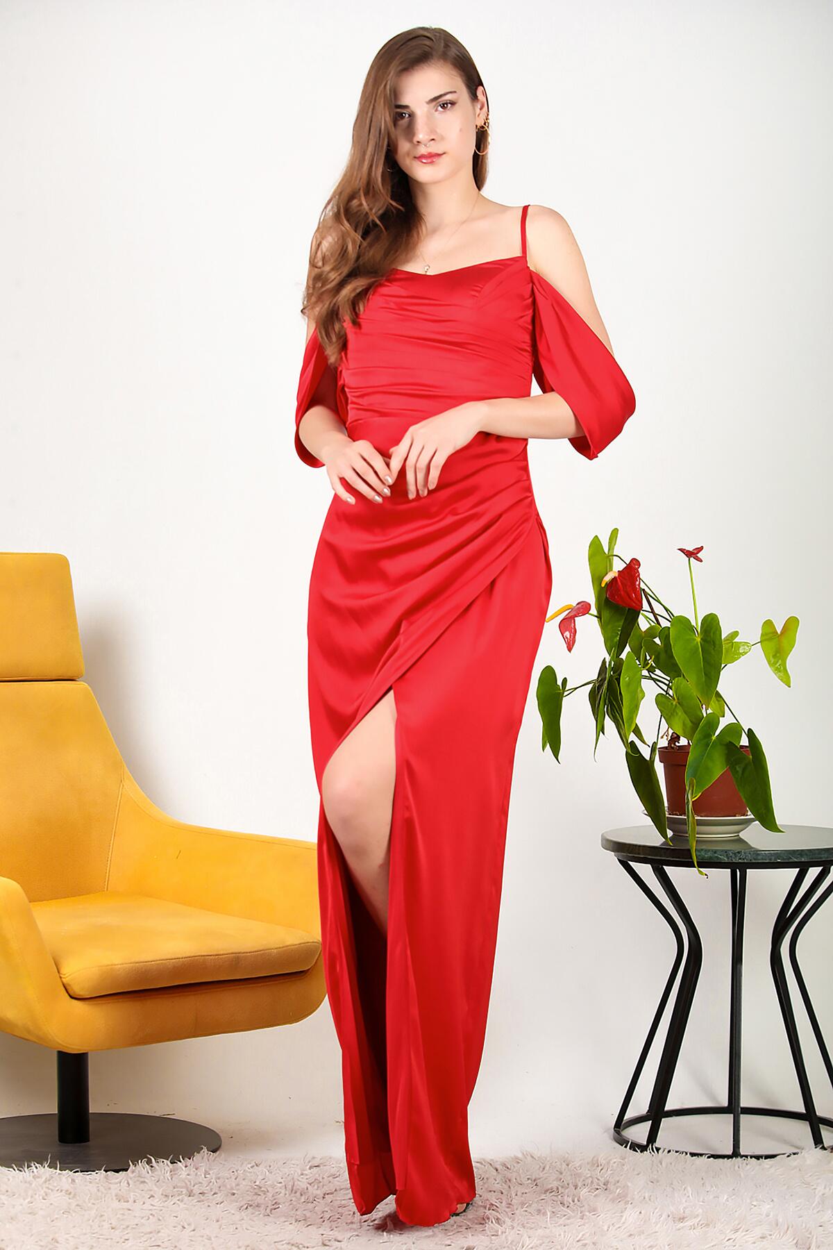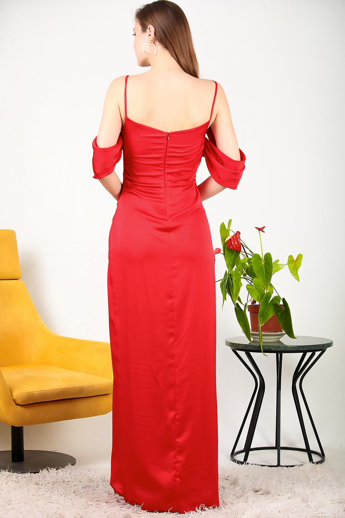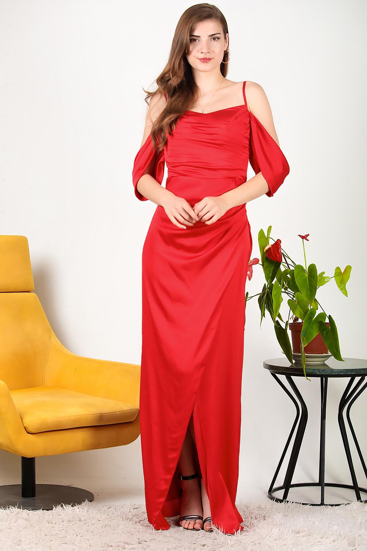 Kadın Askılı Saten Uzun Abiye Kırmızı