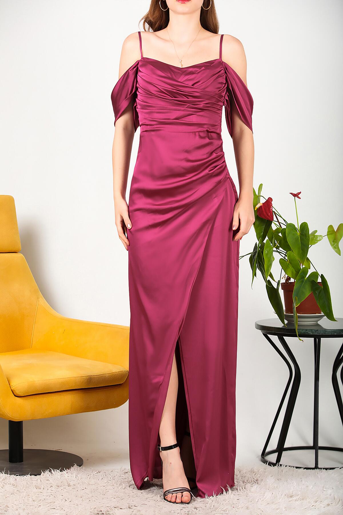 Kadın Askılı Saten Uzun Abiye Mürdüm