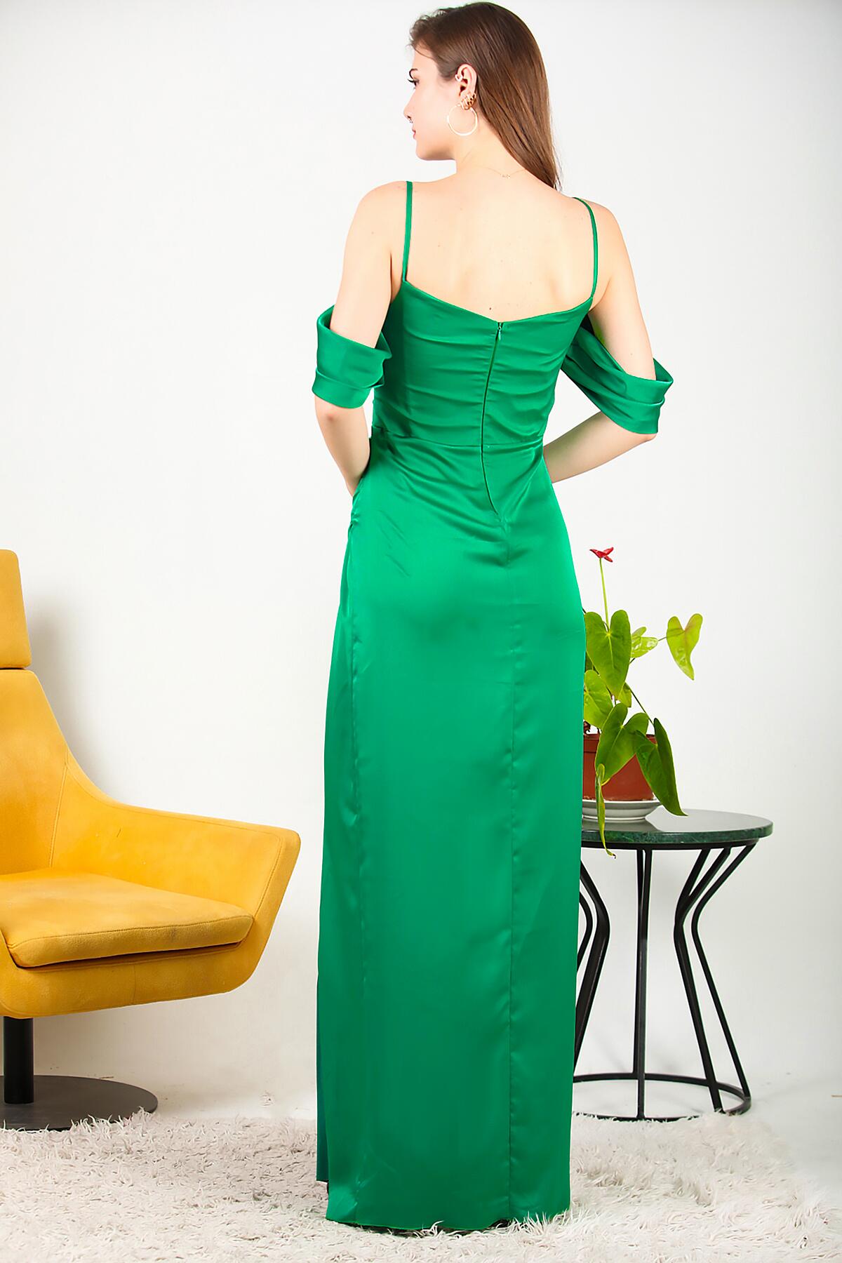 Kadın Askılı Saten Uzun Abiye Yeşil