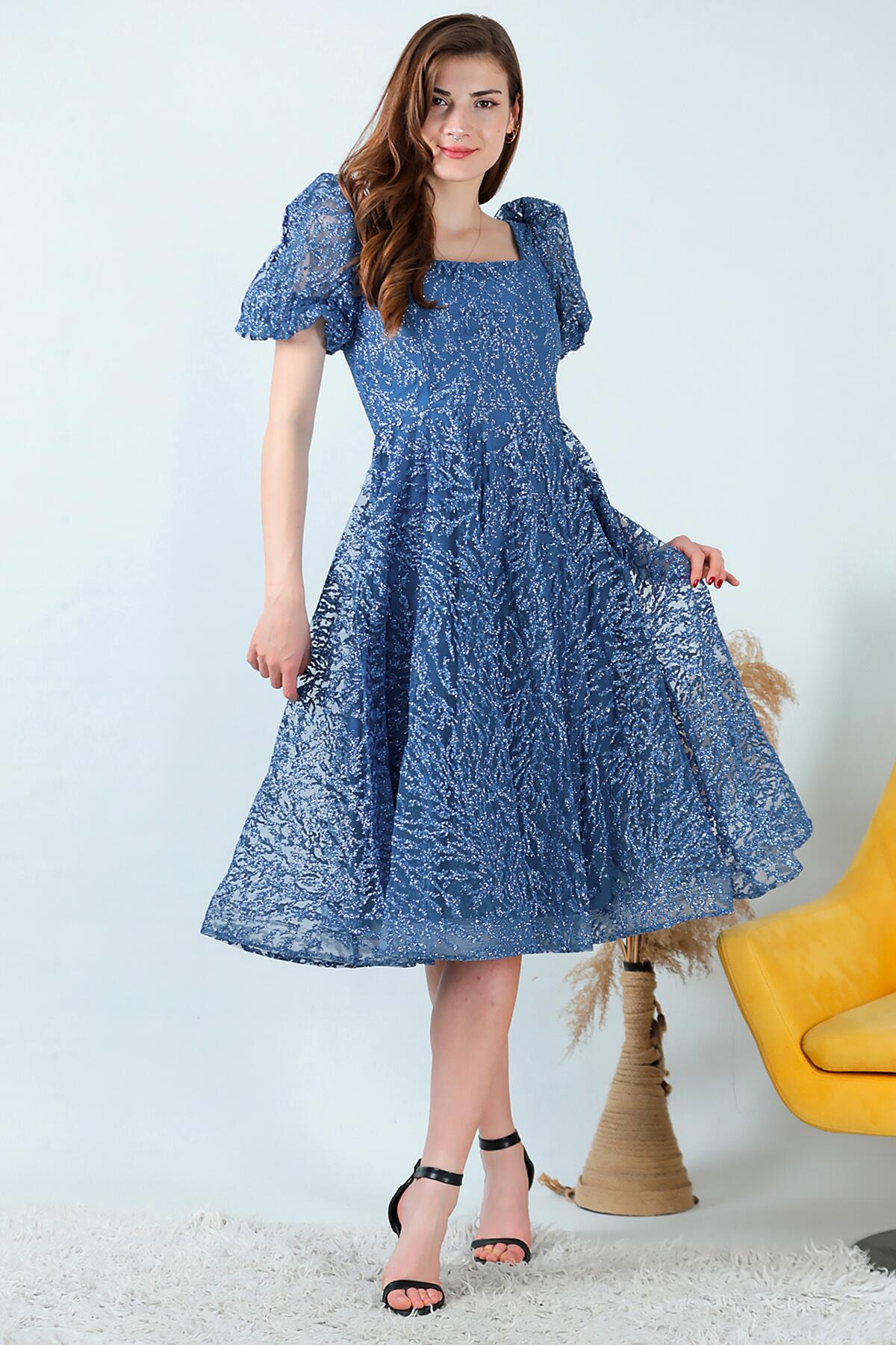 Kadın Balon Kol Simli Midi Boy Abiye Elbise İndigo