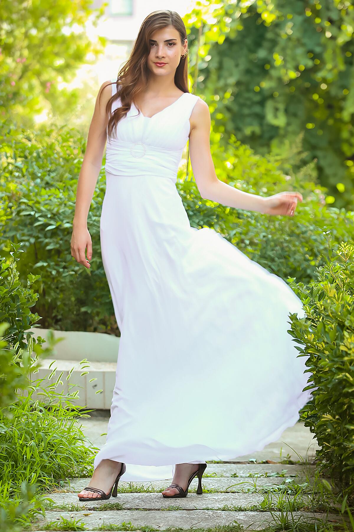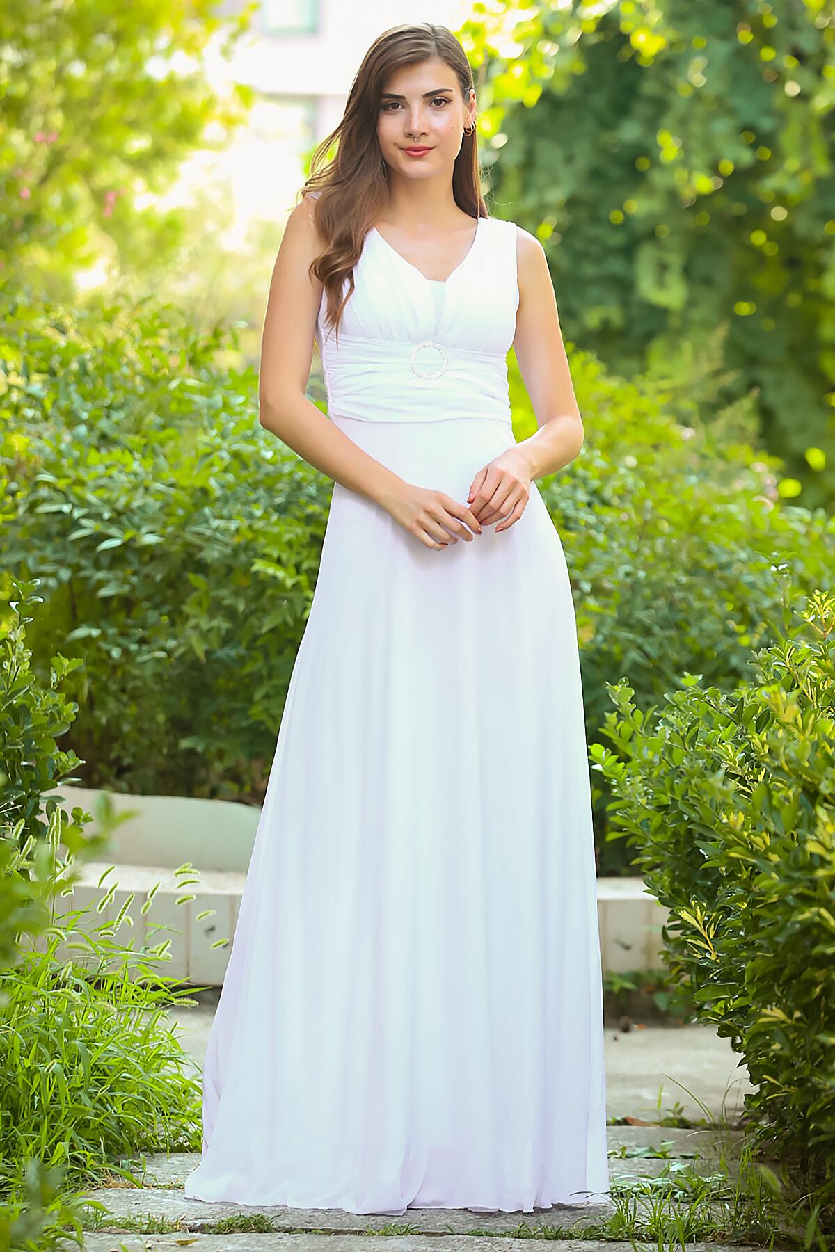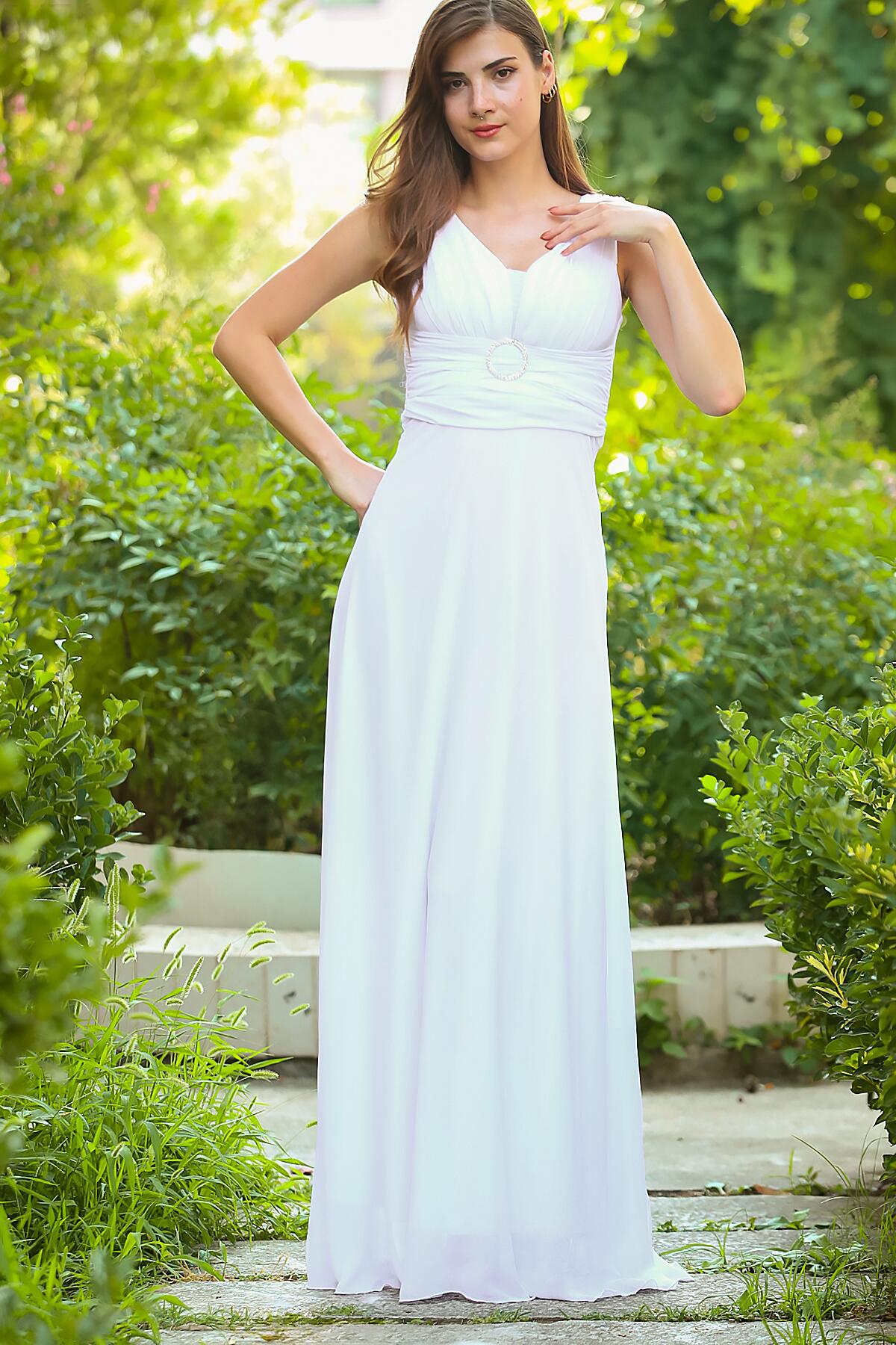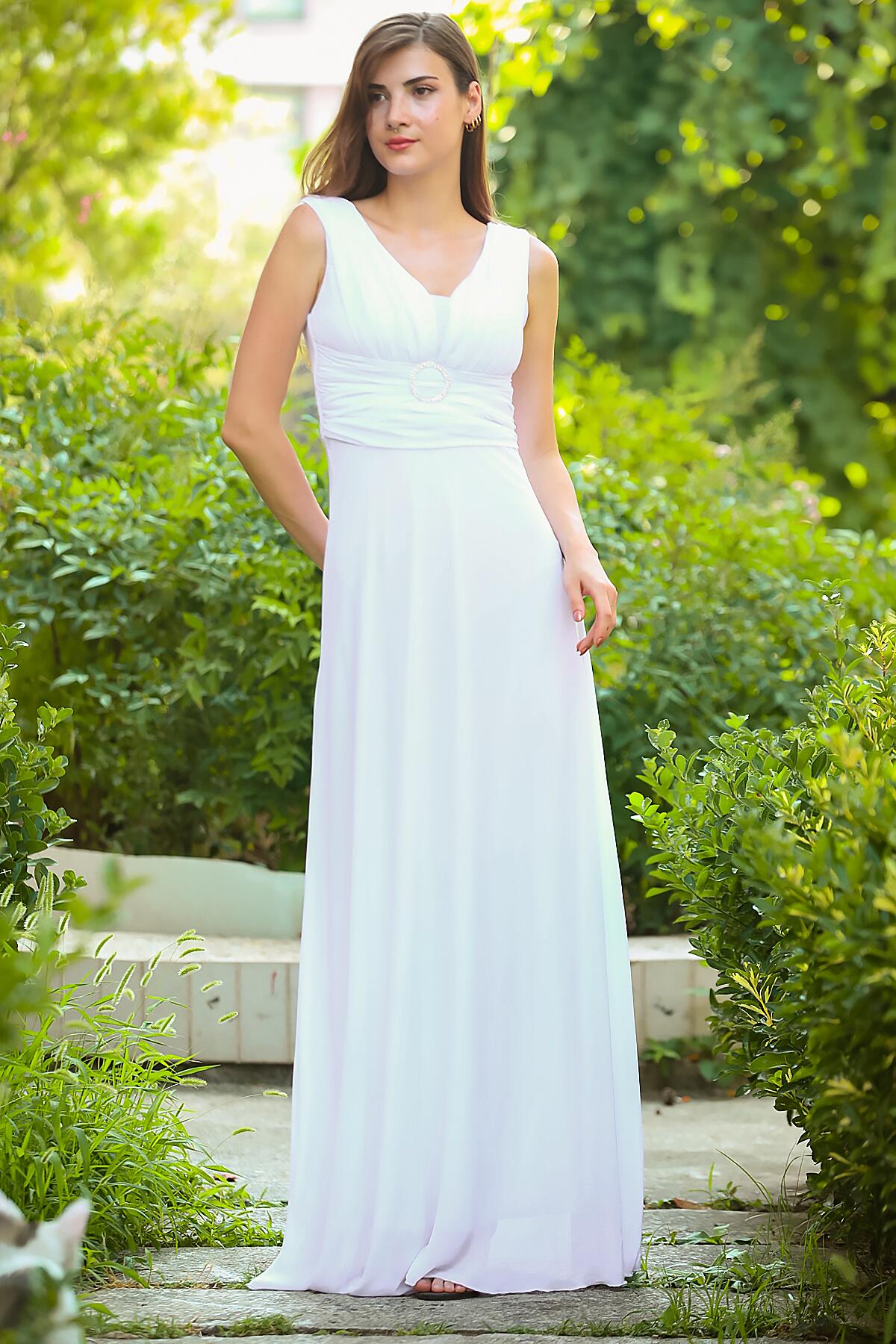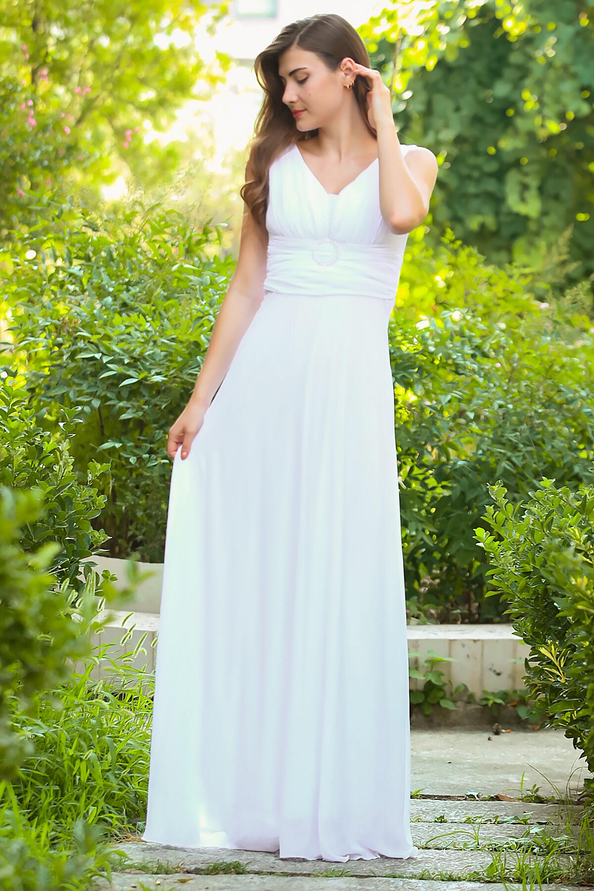 Kadın Bel Tokalı Uzun Şifon Abiye Elbise Ekru