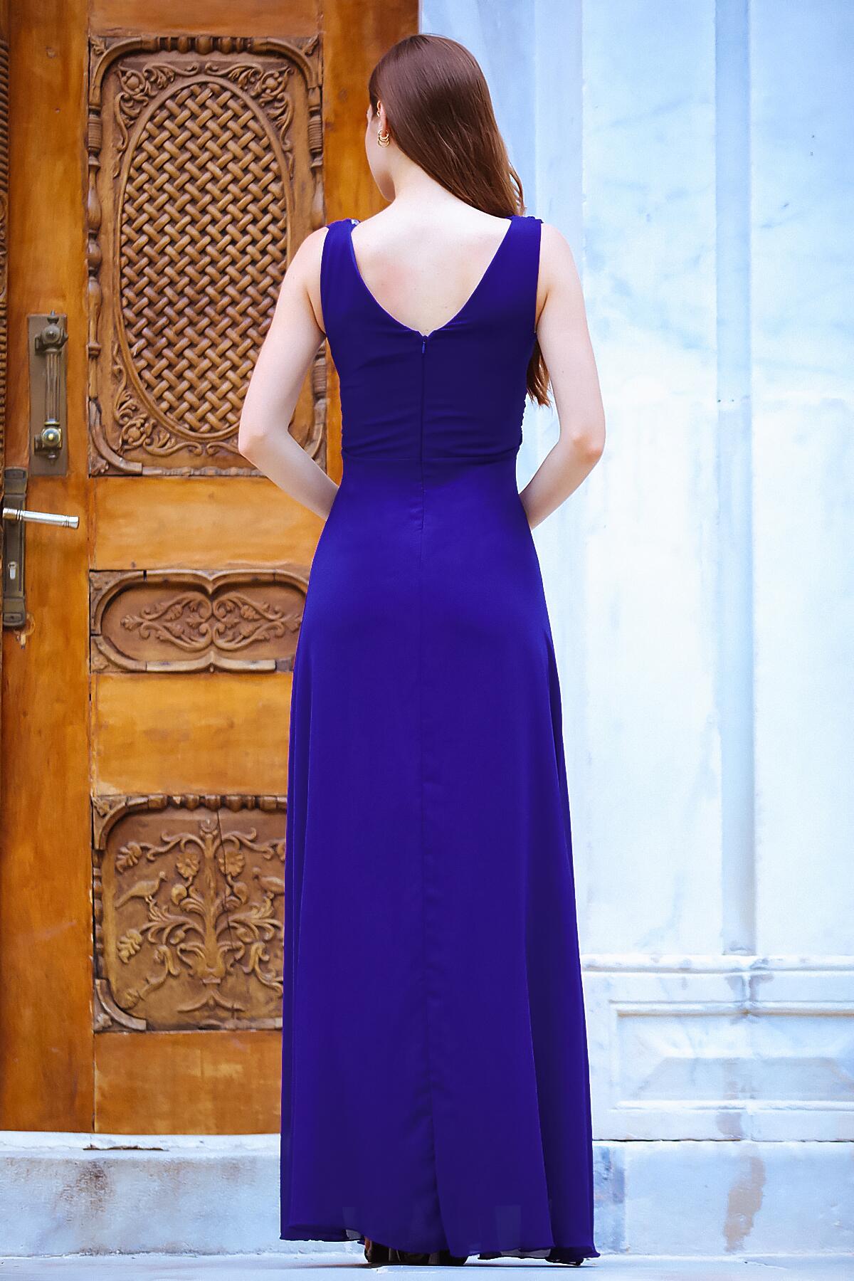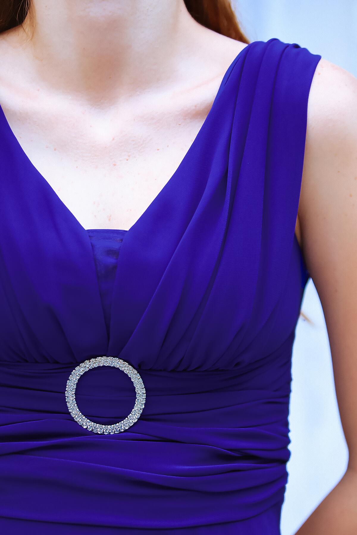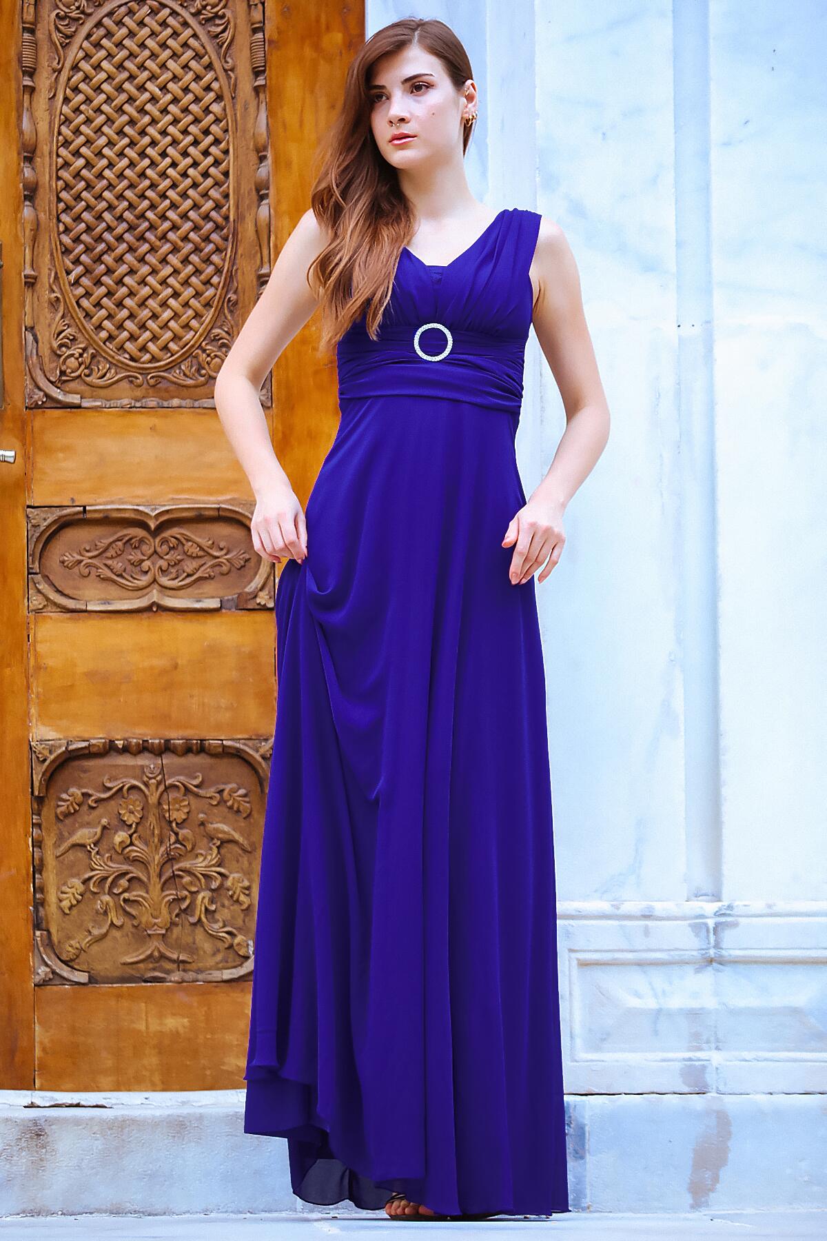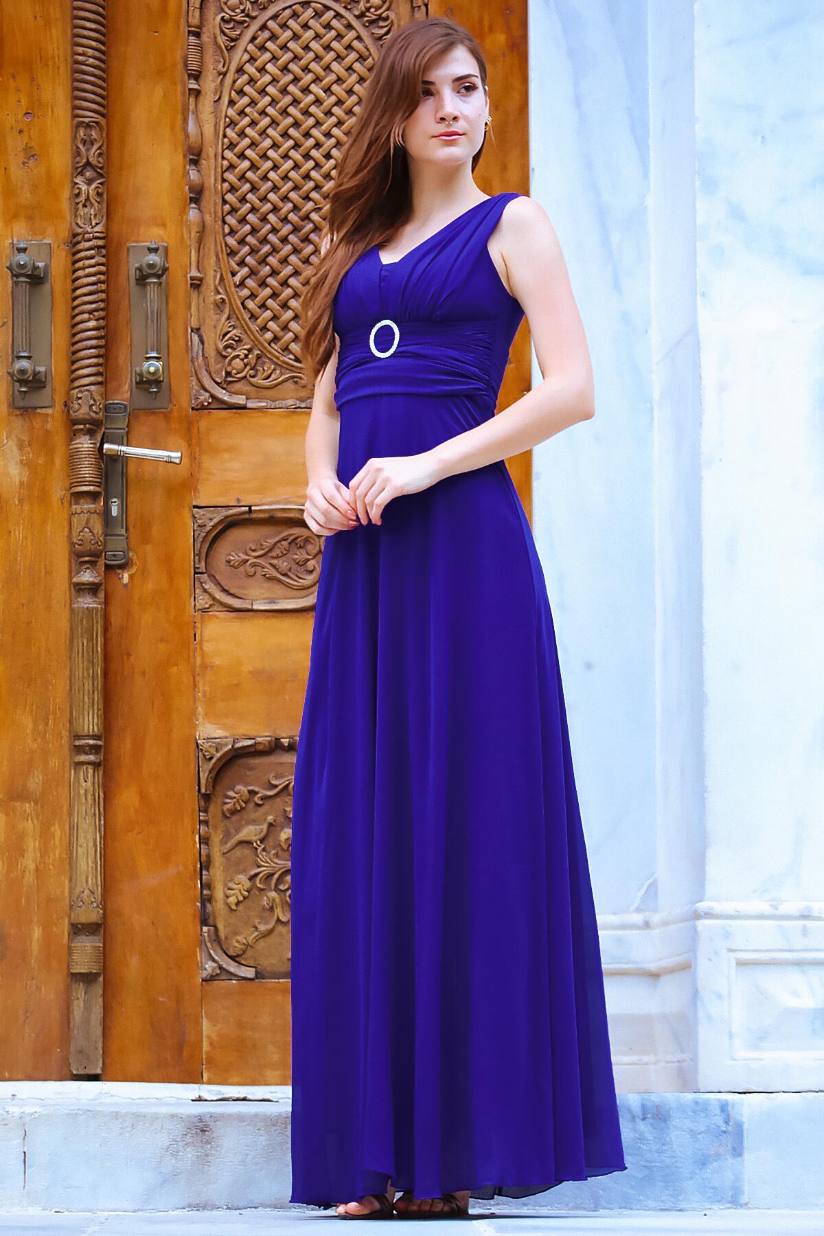 Kadın Bel Tokalı Uzun Şifon Abiye Elbise Saks