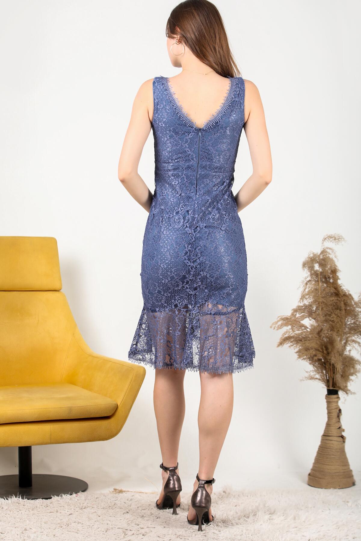 Kadın Dantelli Midi Boy Elbise İndigo