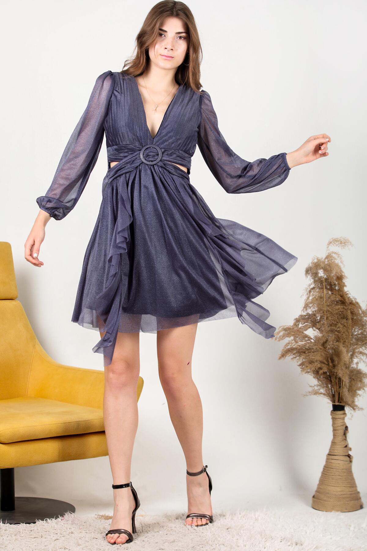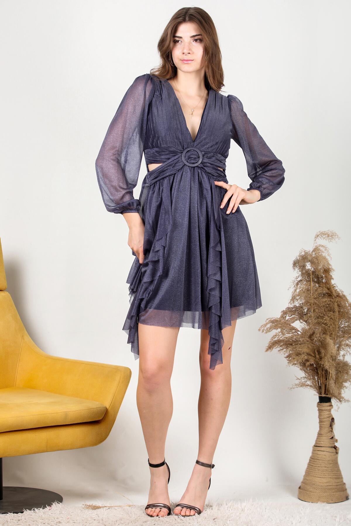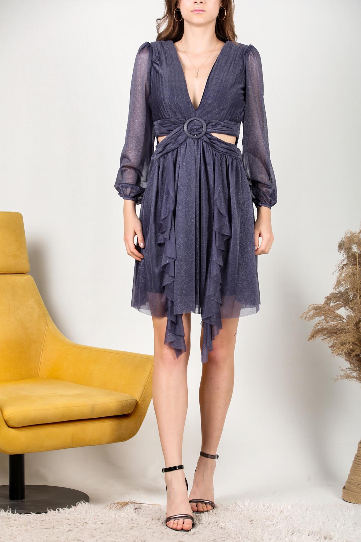 Kadın Eteği Fırfır abiye Elbise Lacivert