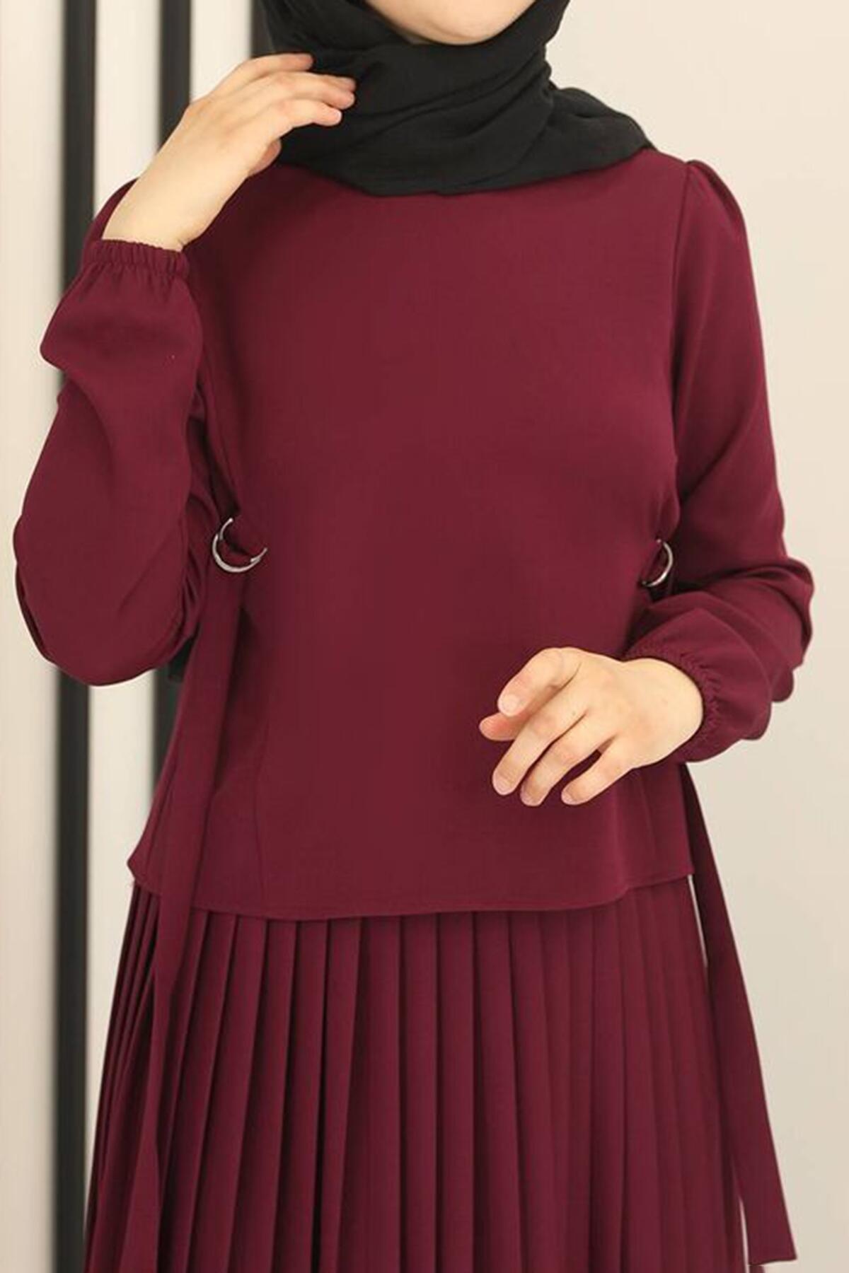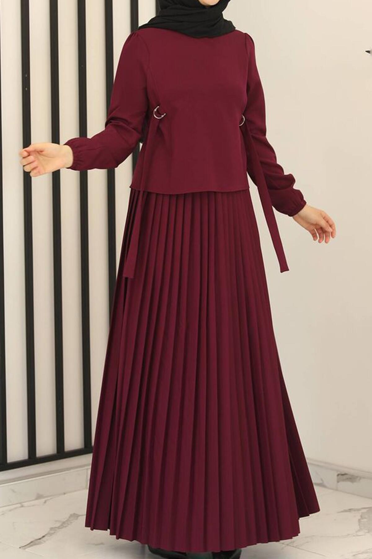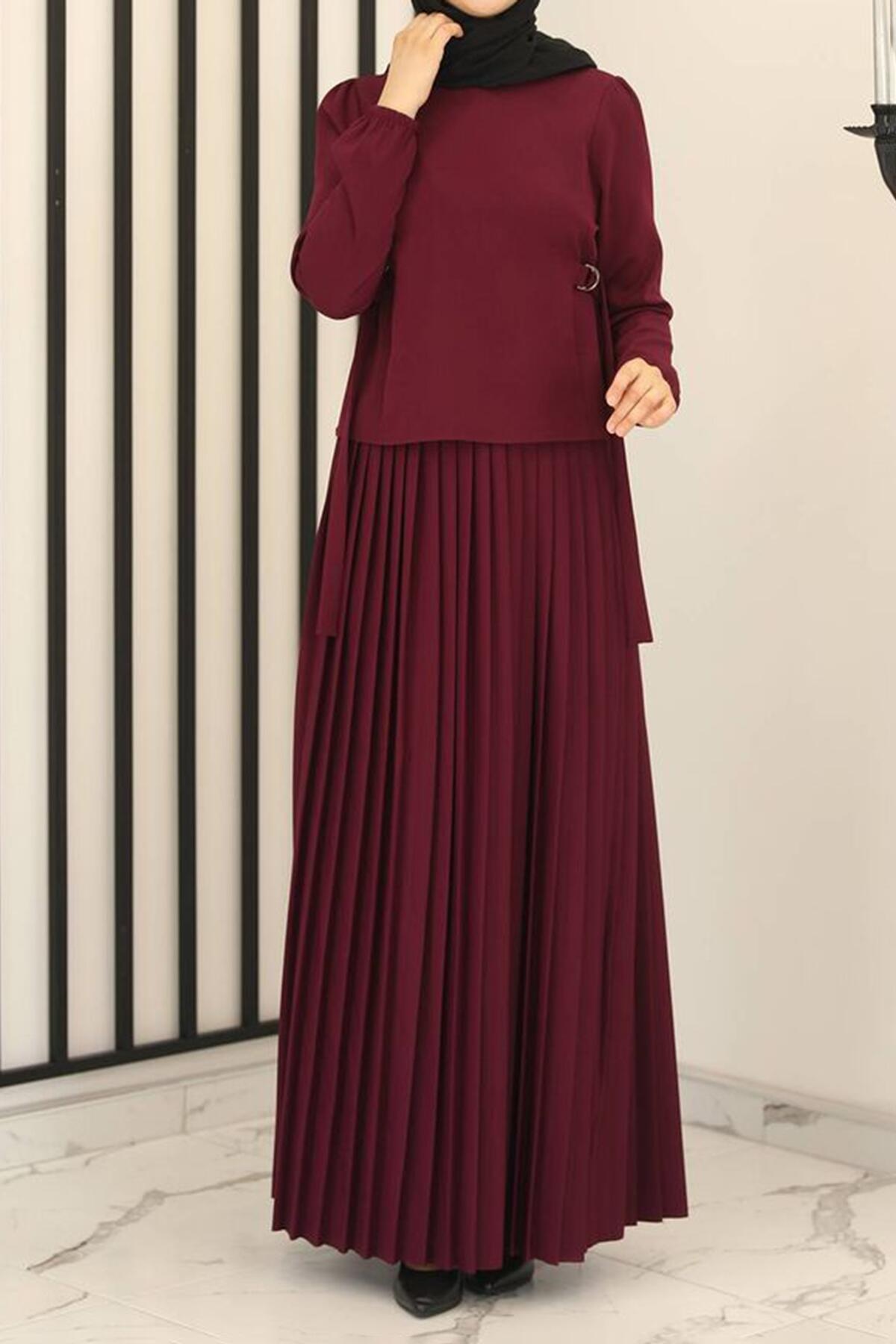 Kadın Eteği Pileli İkili Takım Mürdüm