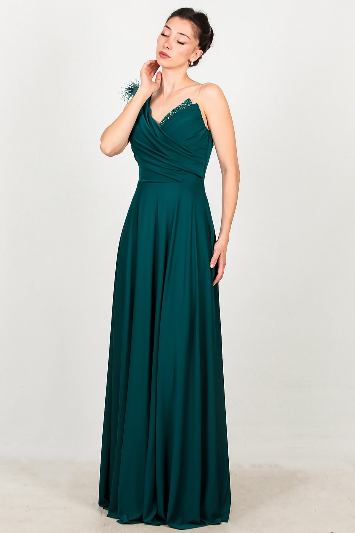 Kadın Göğsü Taşlı Omuz Broşlu Uzun Abiye Zümrüt