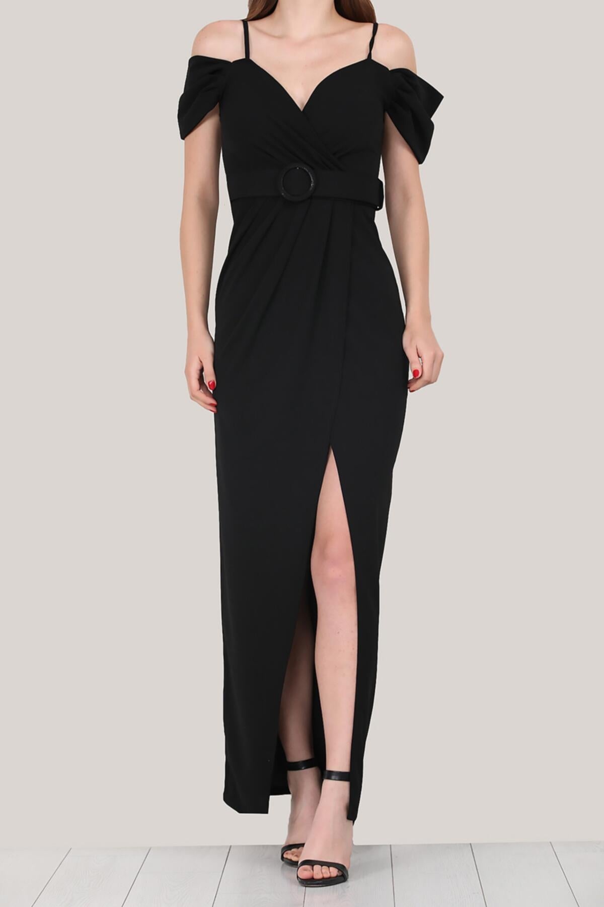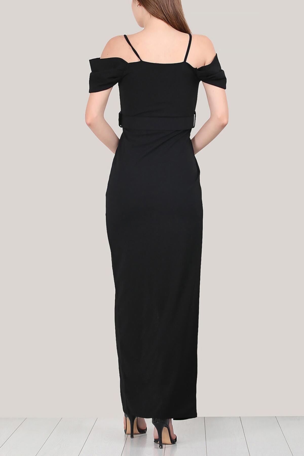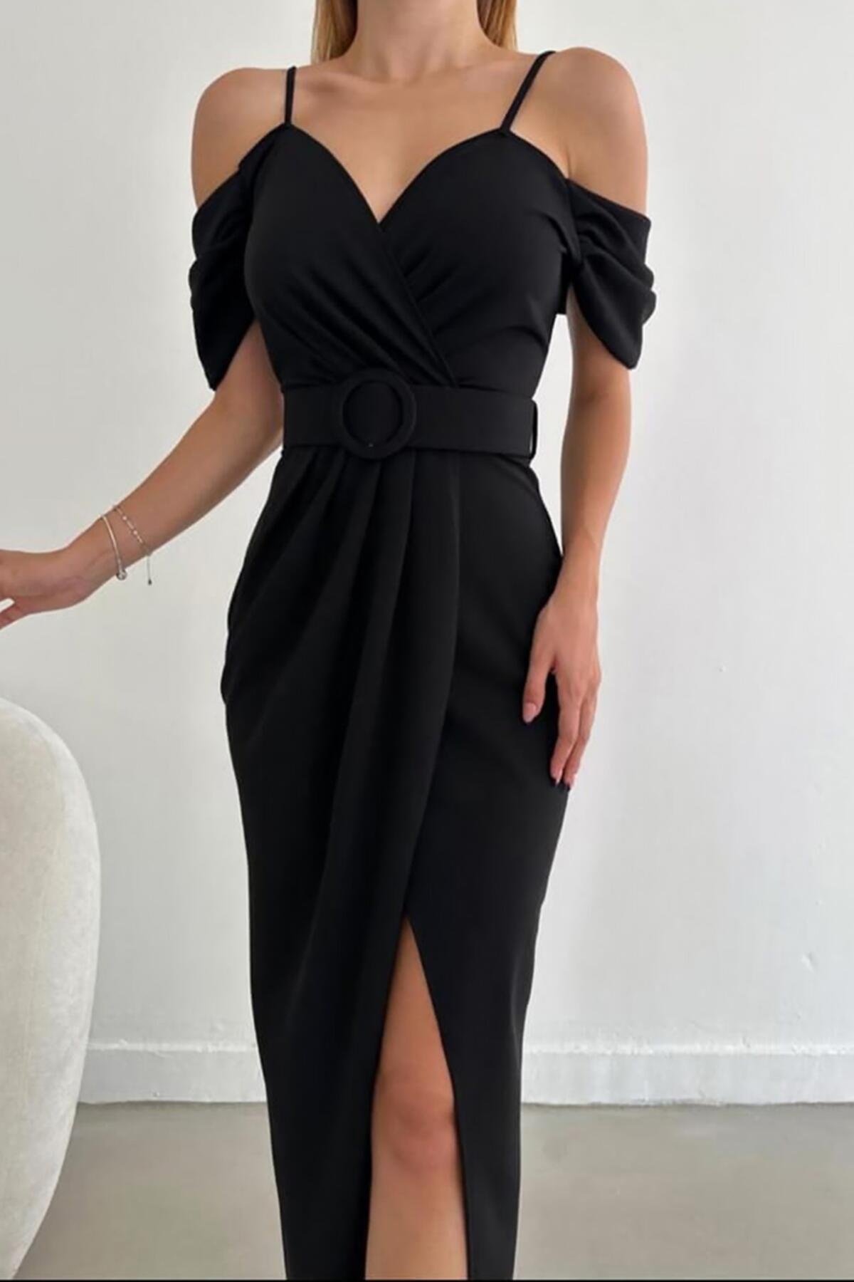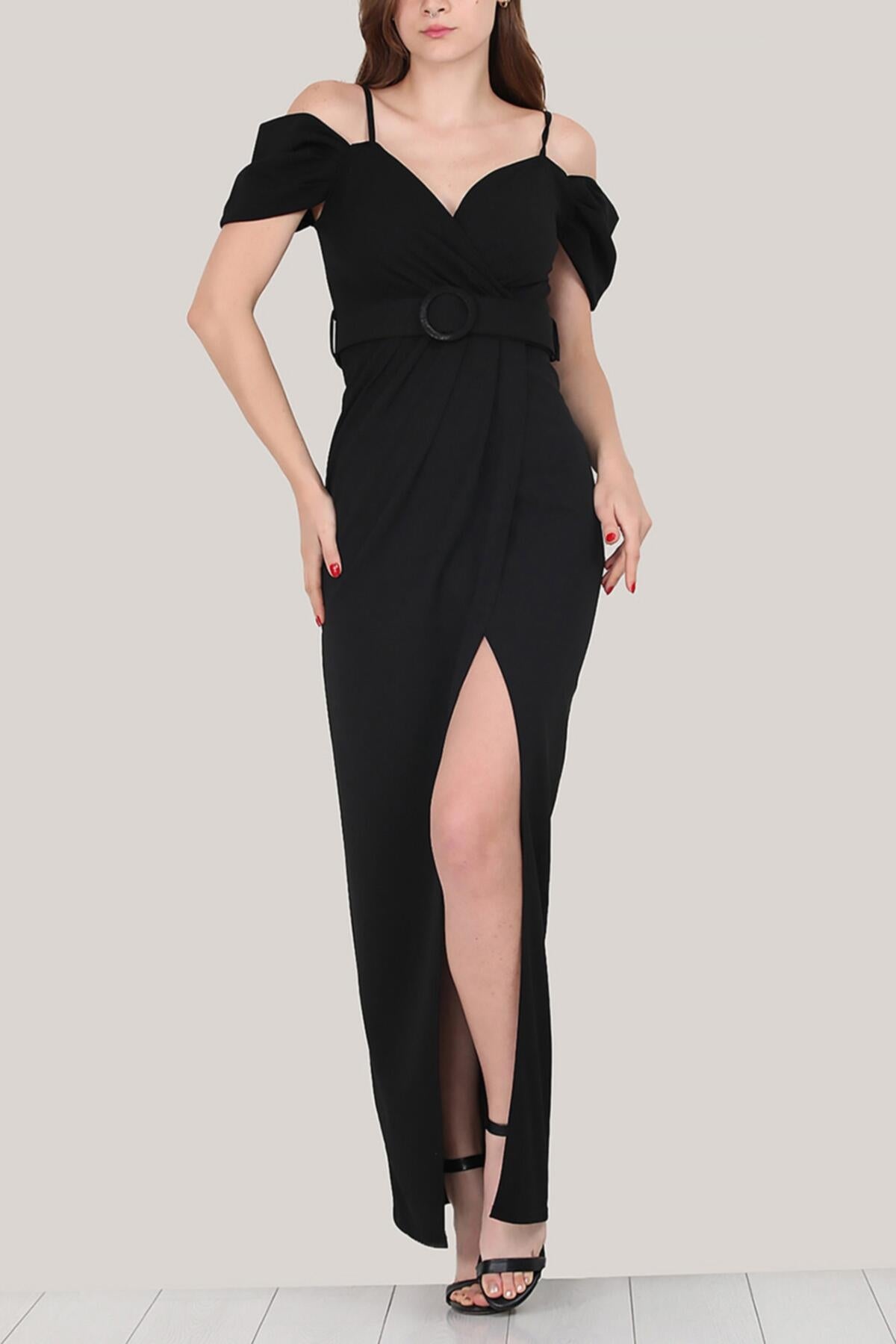Kadın İp Askılı Bel Kemerli Yırtmaç Detay Uzun Abiye Siyah