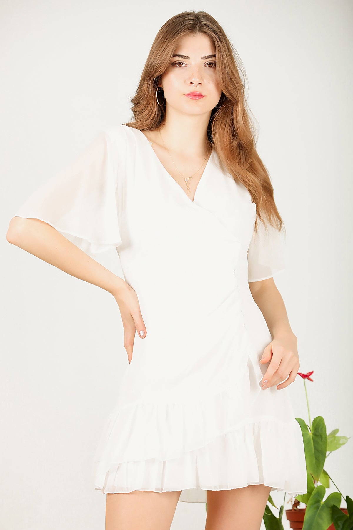 Kadın Kısa Şifon Abiye Elbise Ekru