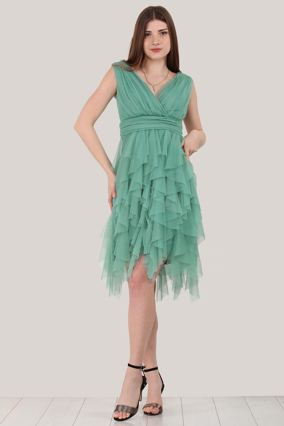 Kadın Kısa Tül Abiye Elbise Çağla Yeşili