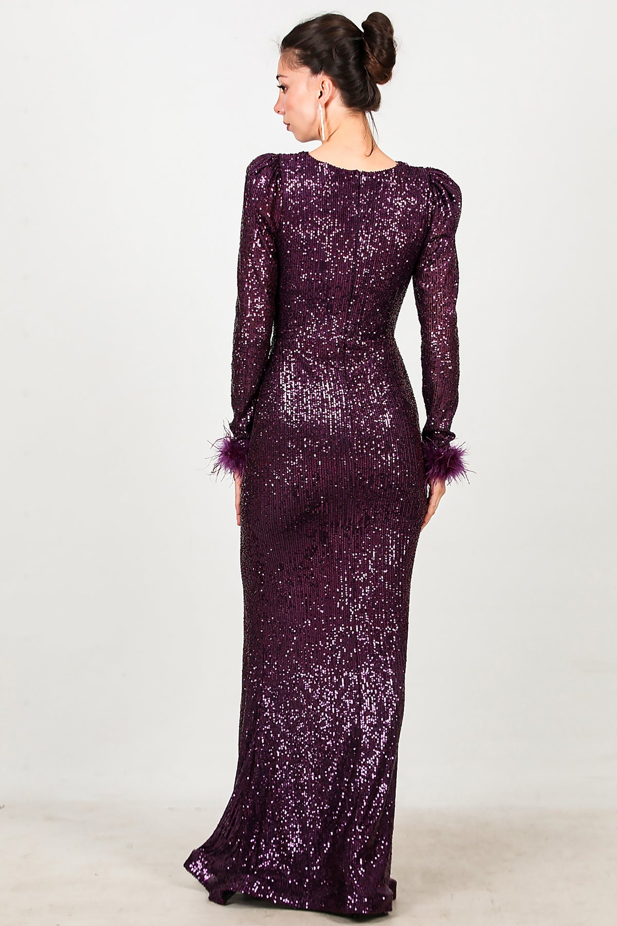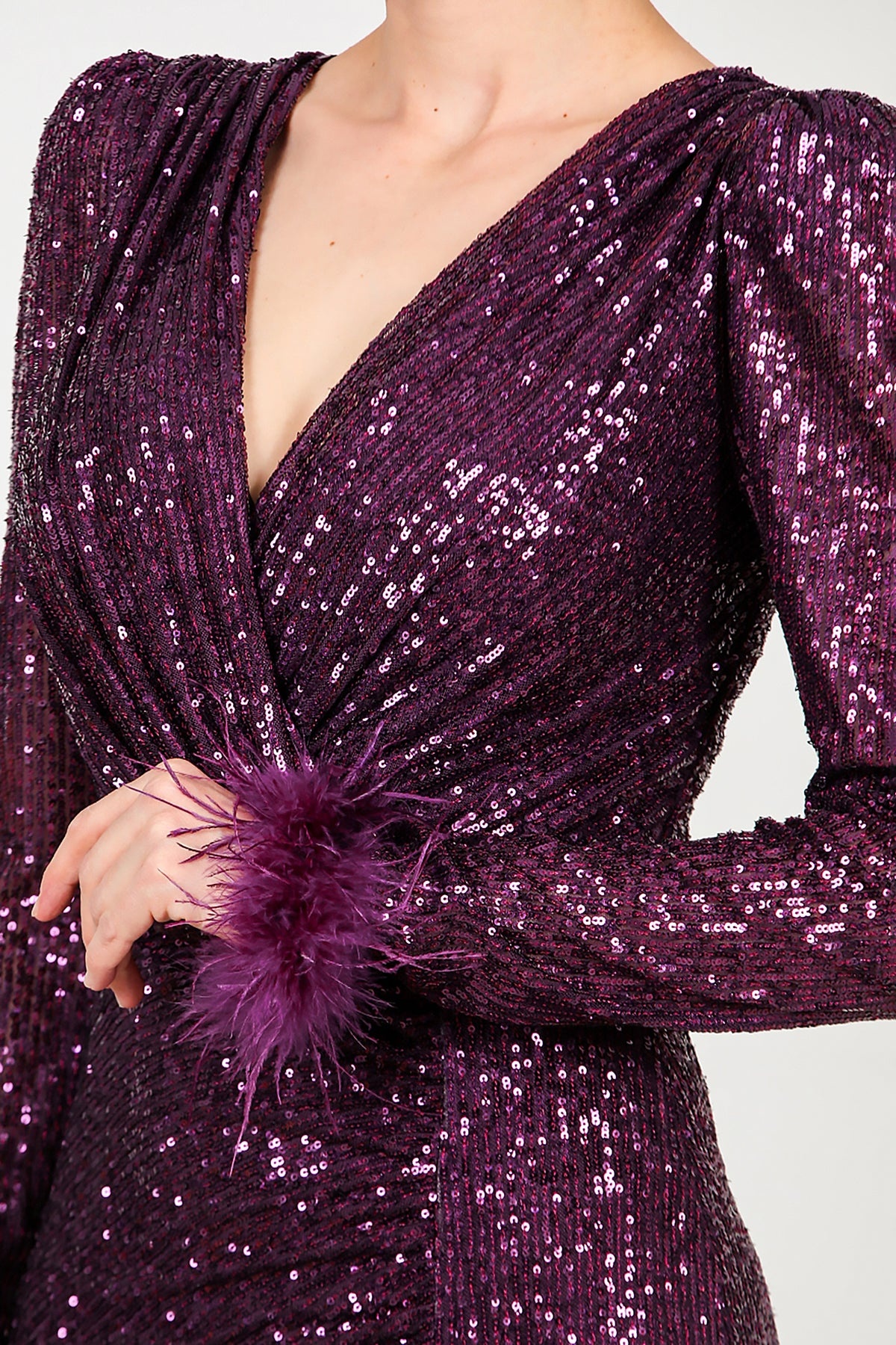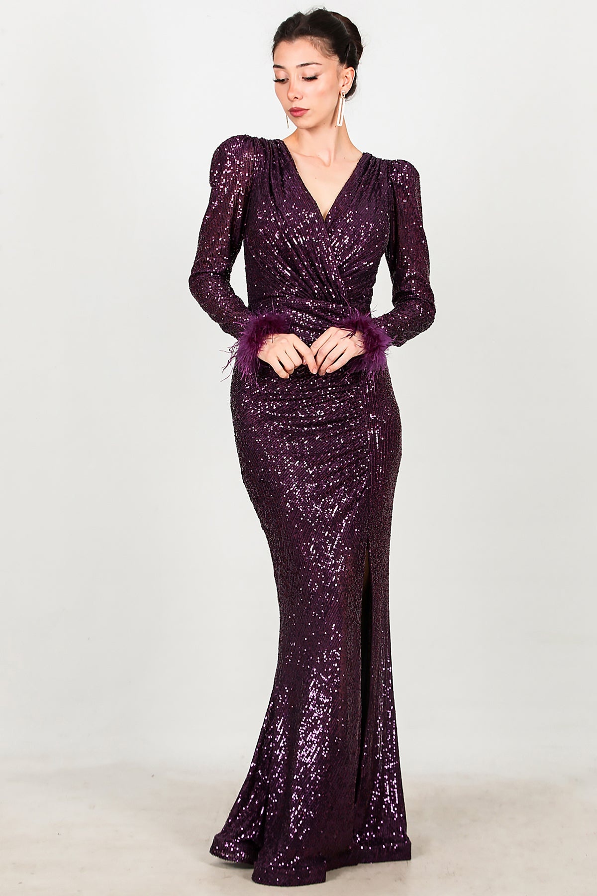 Kadın Kol Ucu Tüylü Uzun Pullu Abiye Mor