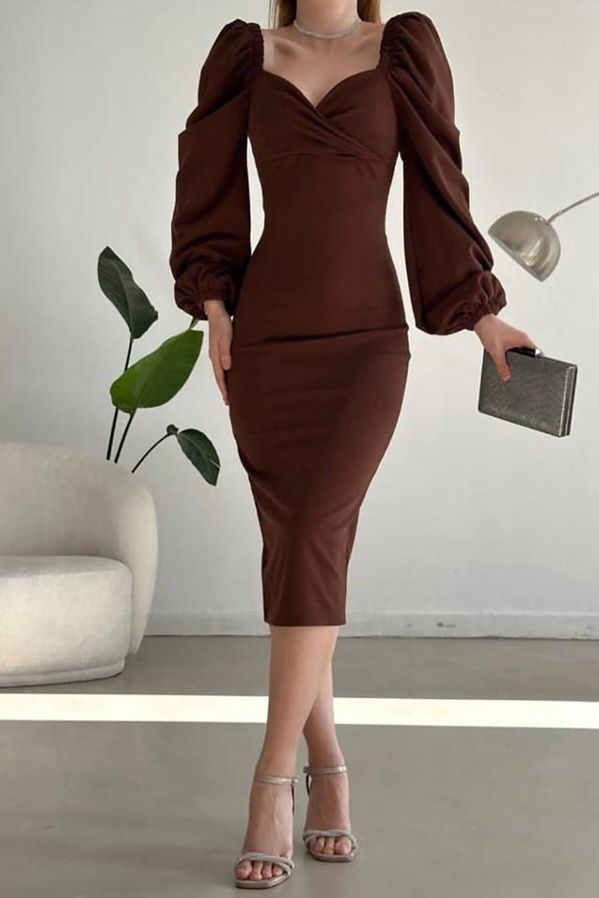 Kadın Midi Boy Elbise Kahverengi