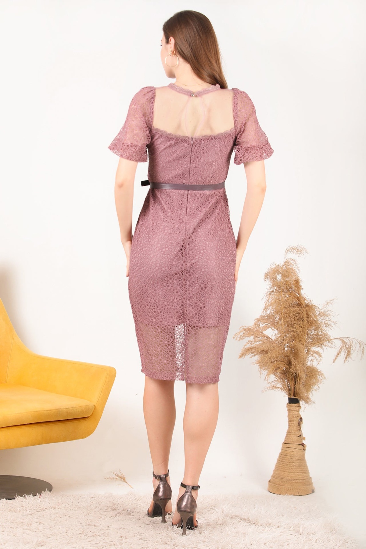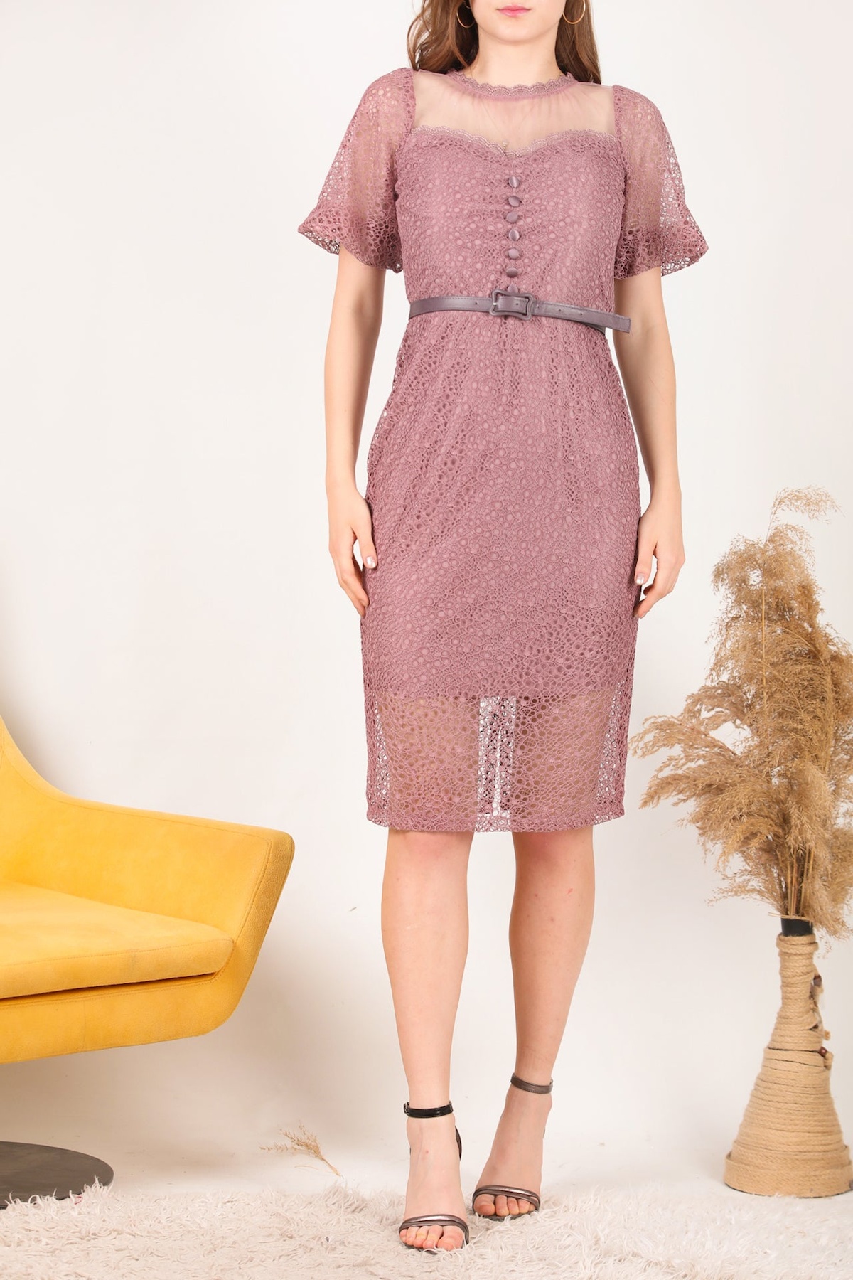 Kadın Midi Boy Kemerli Abiye Elbise Gül Kurusu