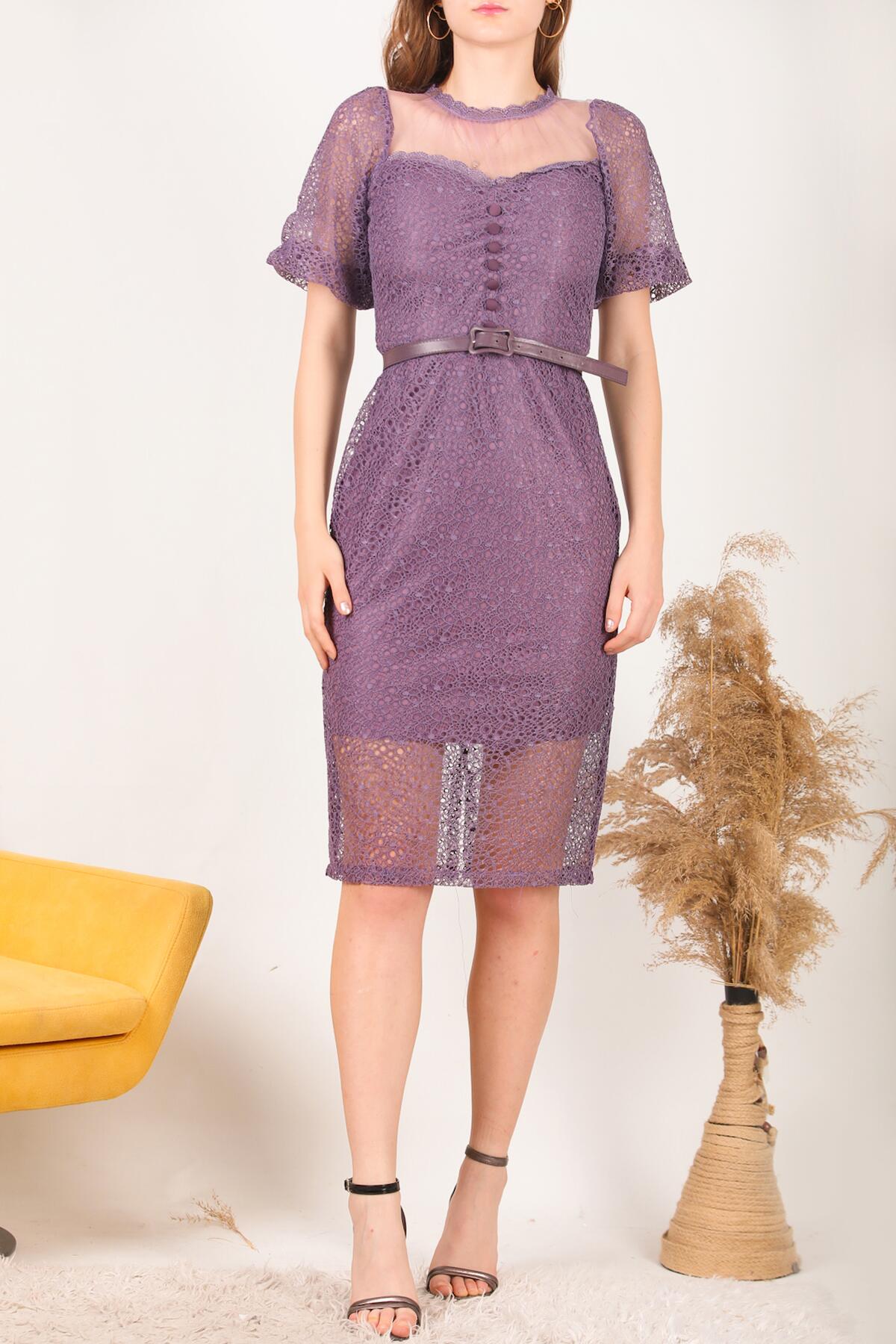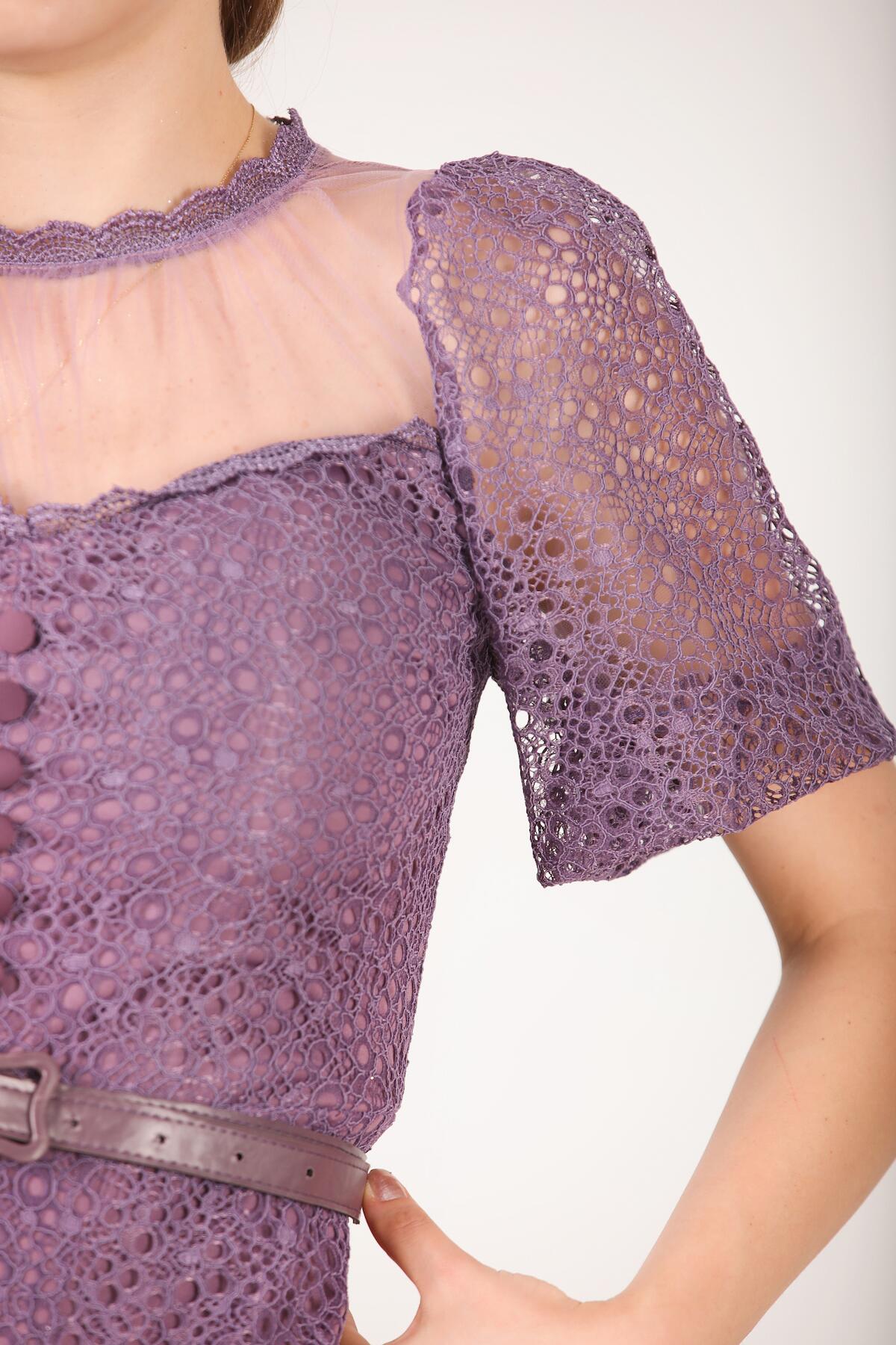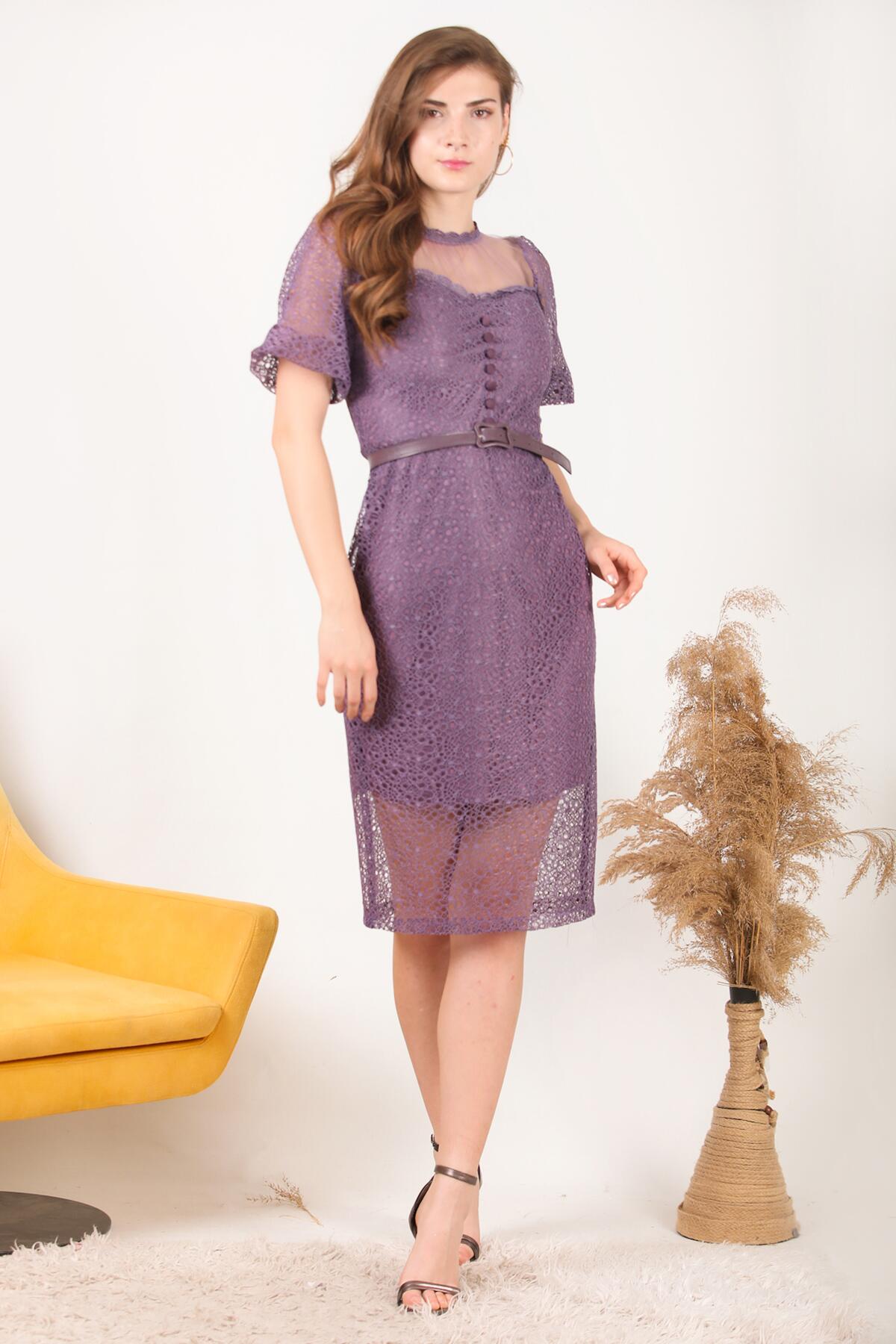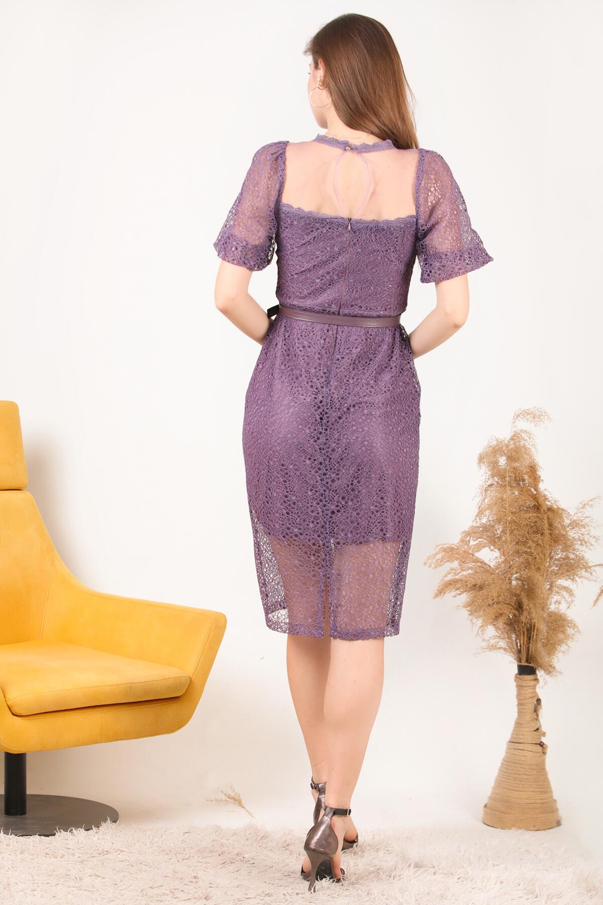 Kadın Midi Boy Kemerli Abiye Elbise Mor
