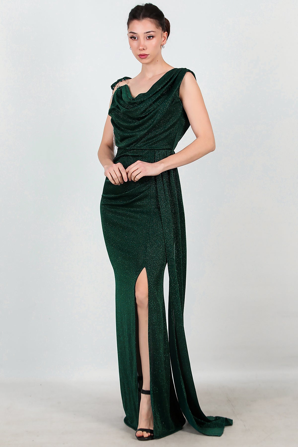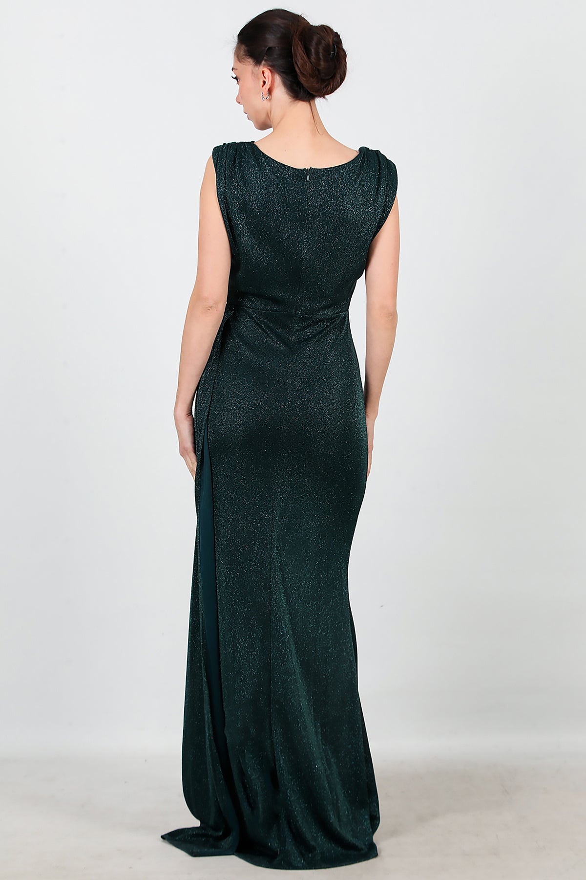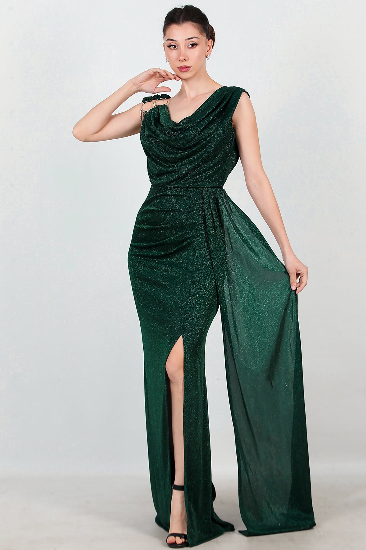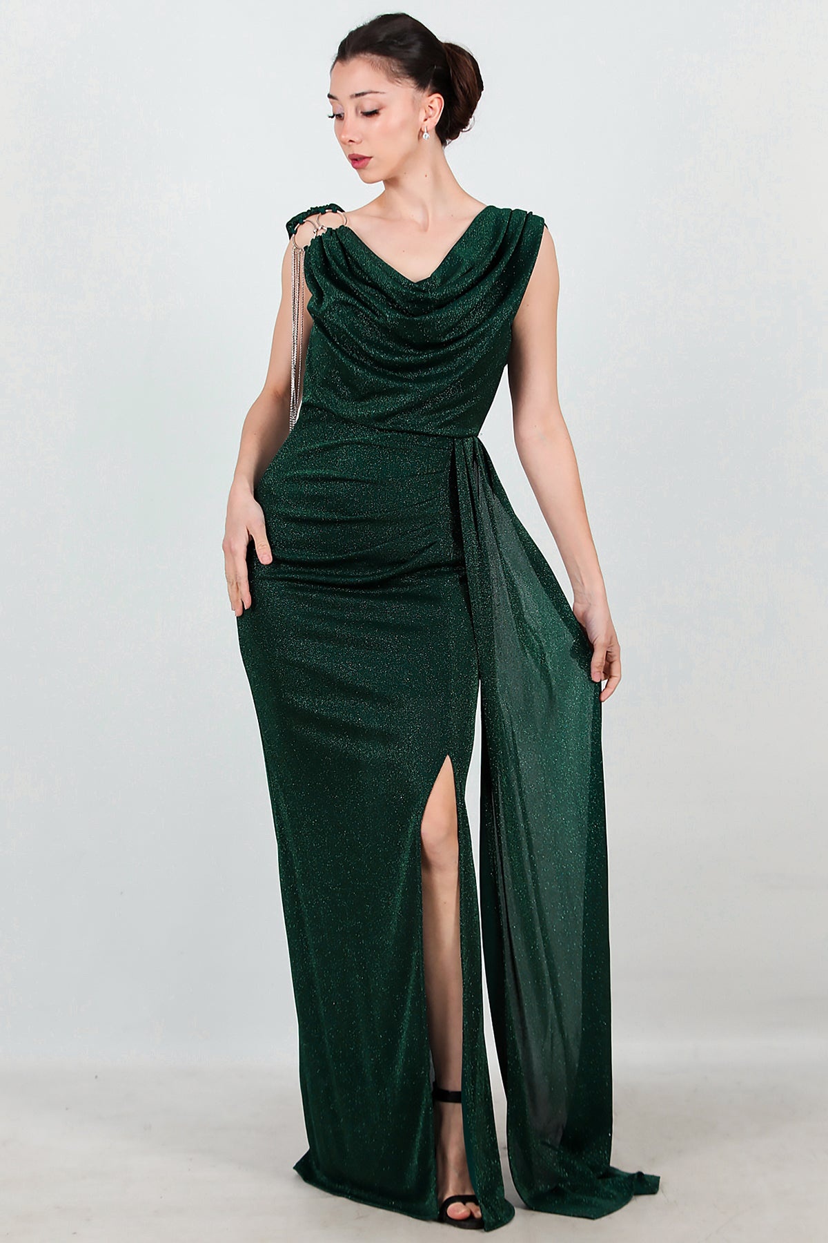 Kadın Omuz Aksesuar Detay Kolsuz Uzun Abiye Zümrüt