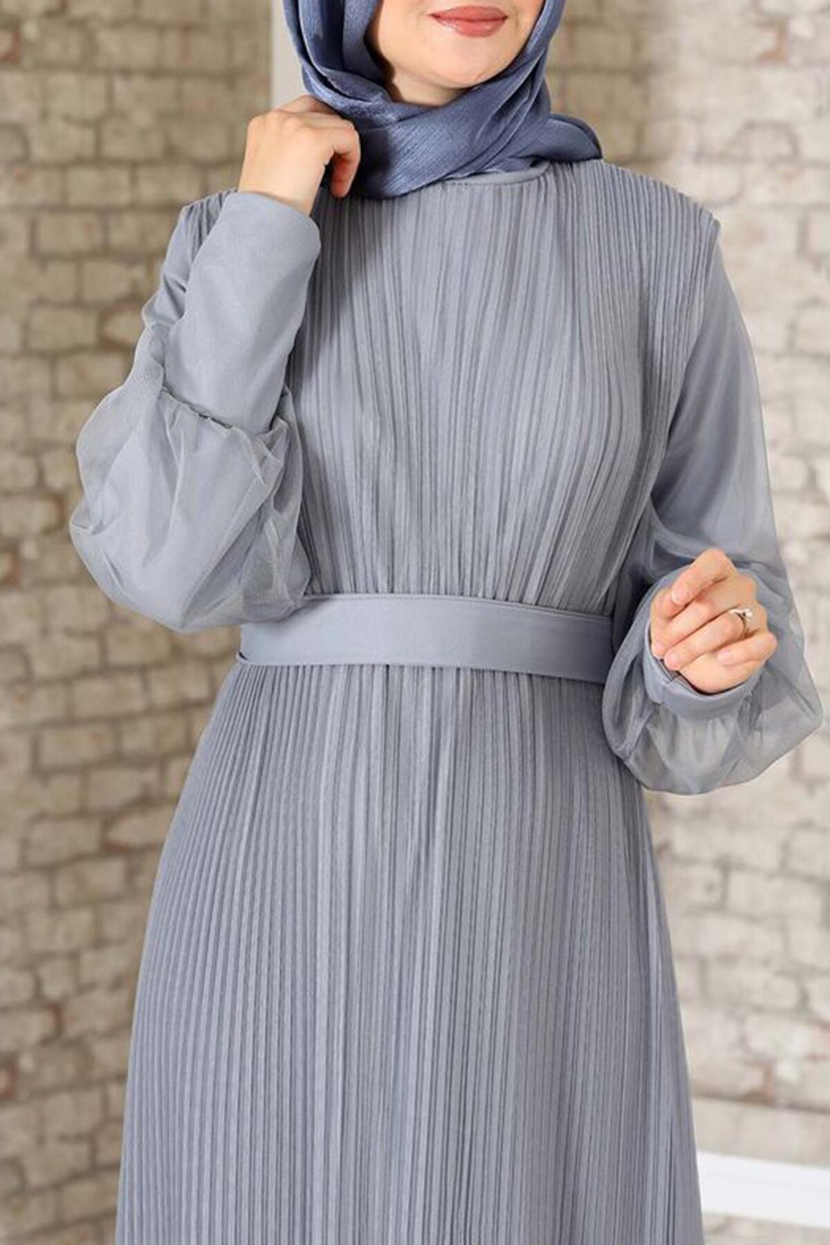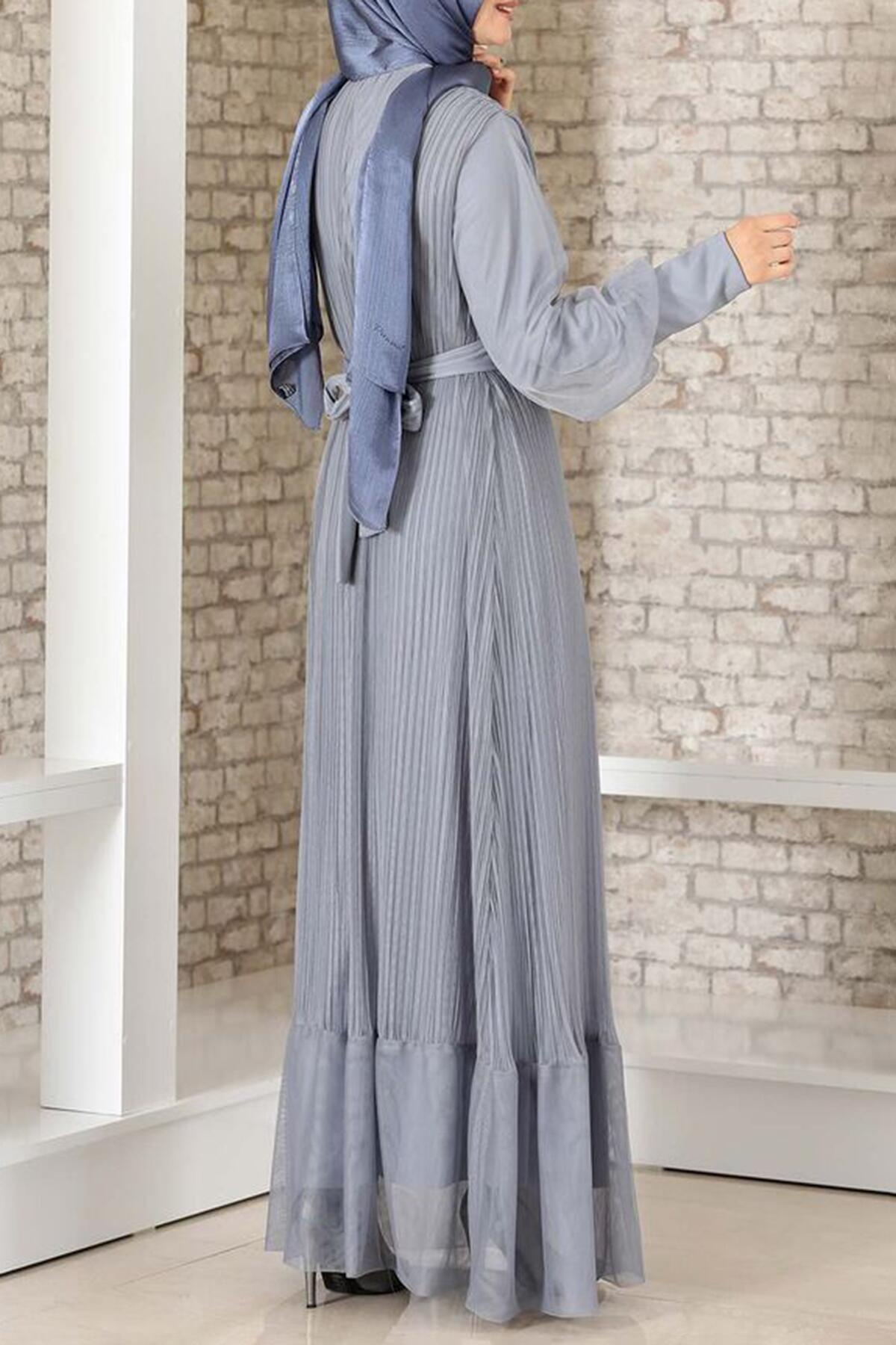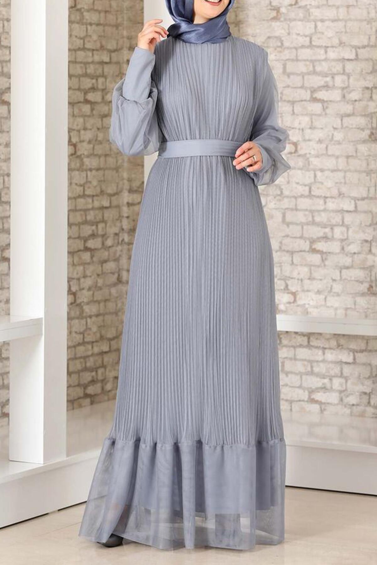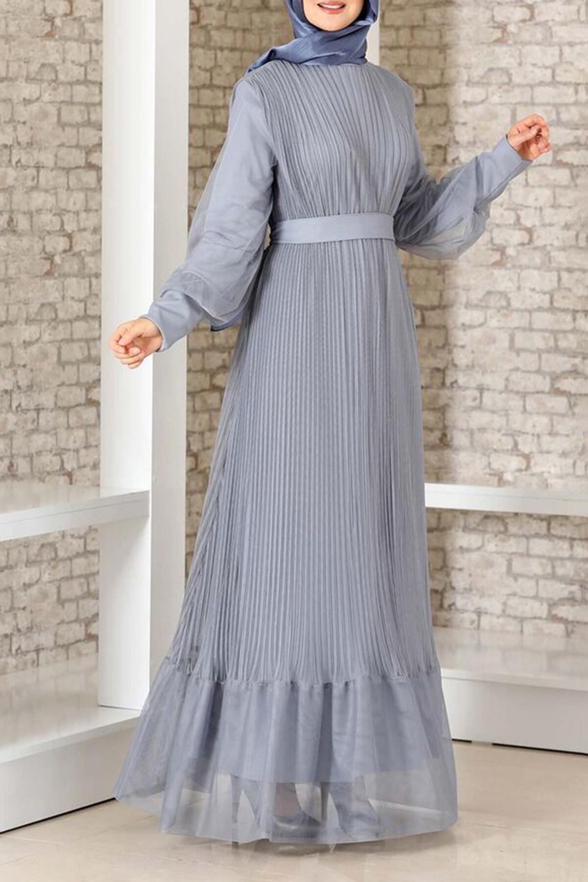Kadın Pilise Detaylı Tül Abiye Gri