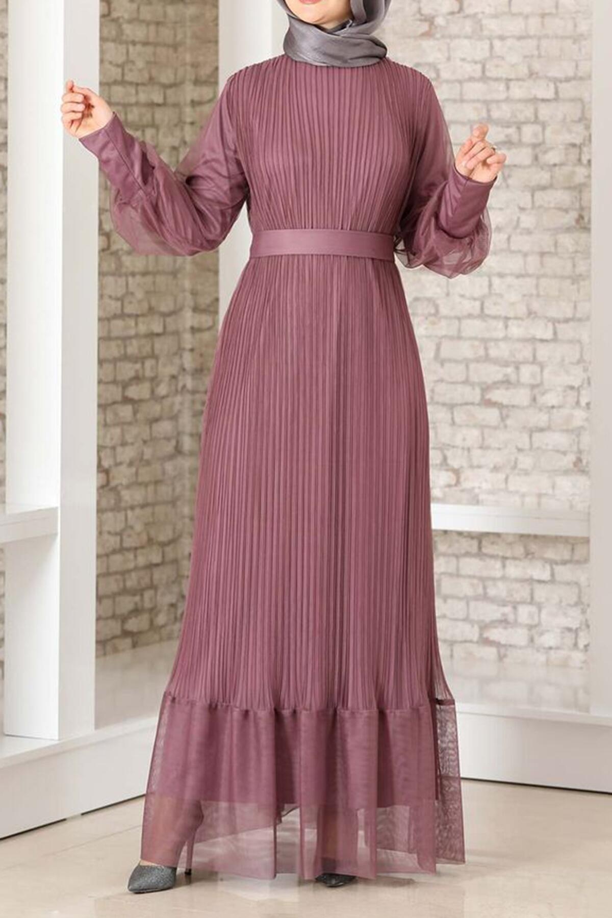 Kadın Pilise Detaylı Tül Abiye Mürdüm