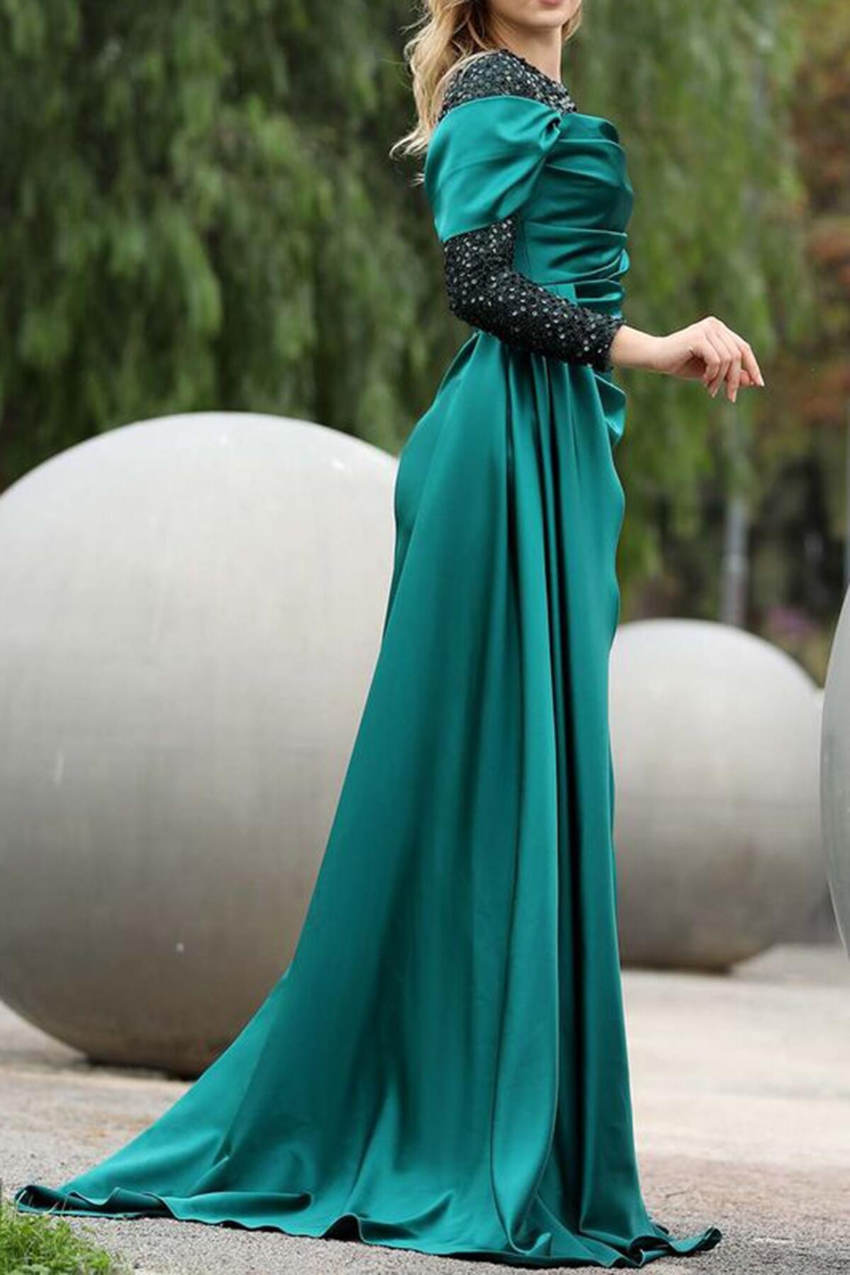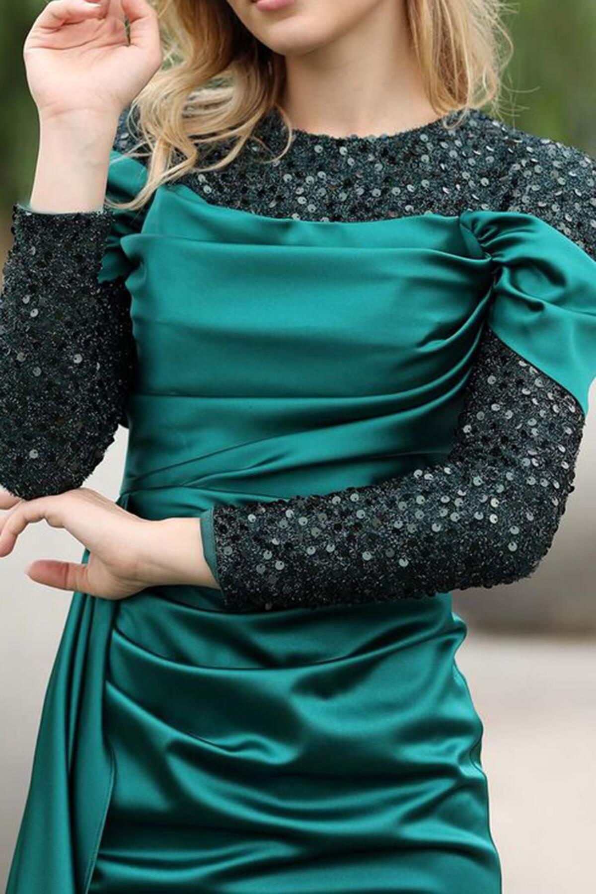 Kadın Pul Detaylı Saten Uzun Abiye Zümrüt