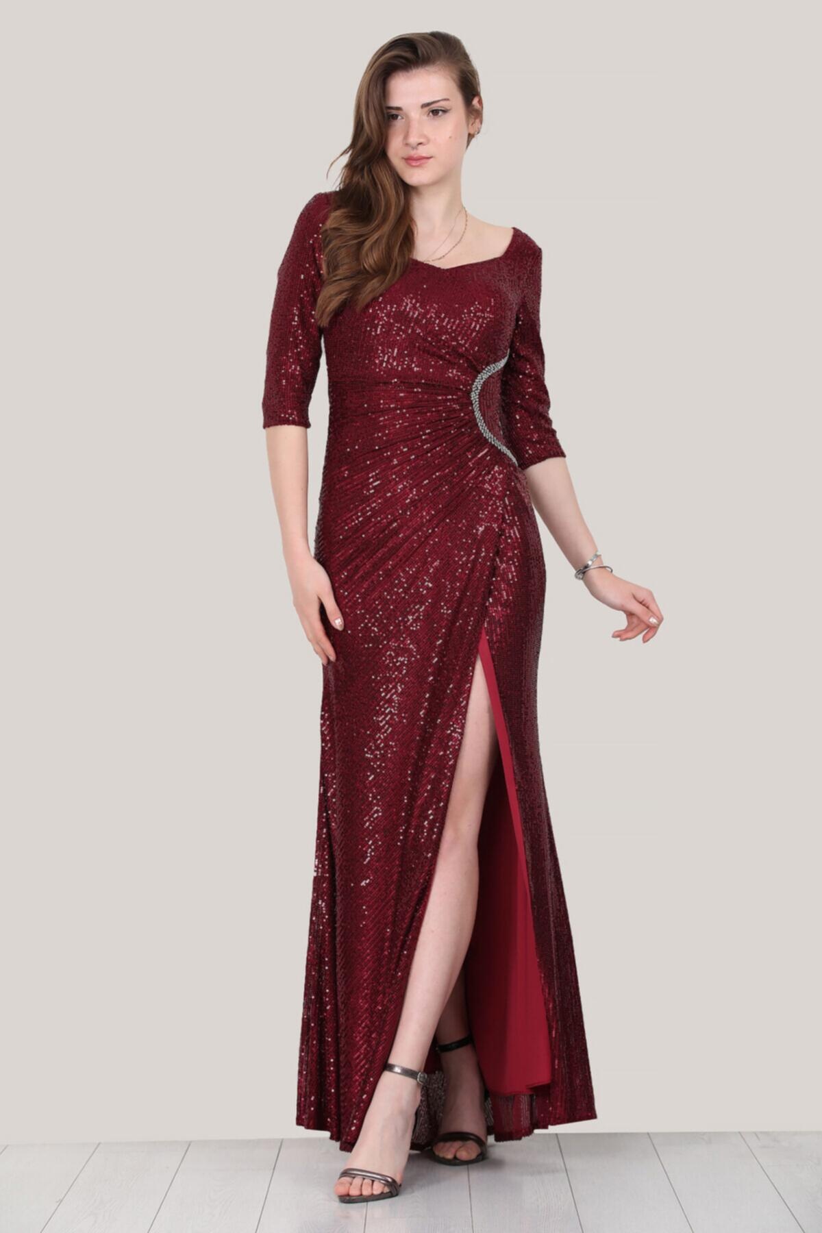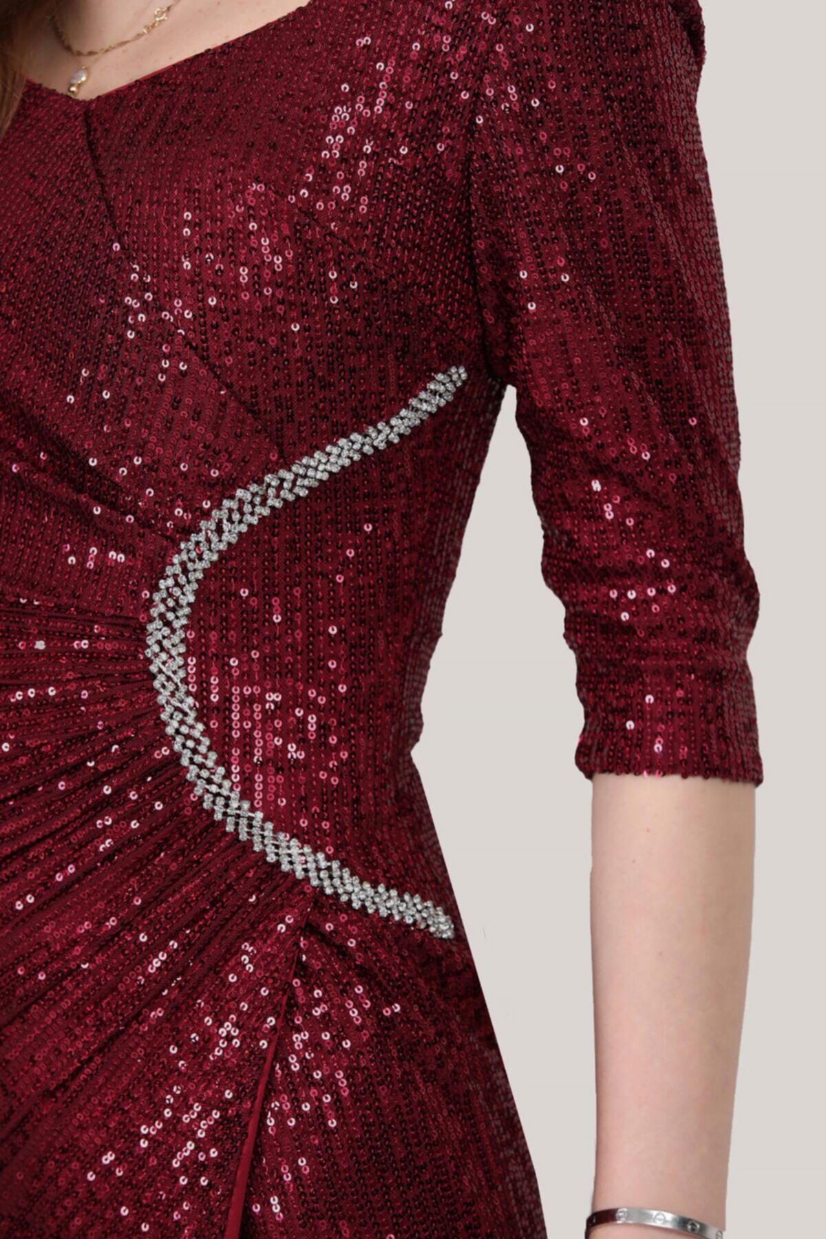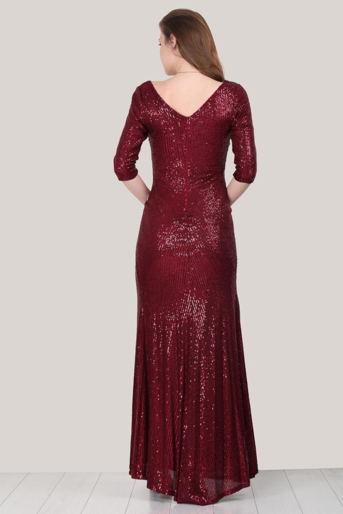 Kadın Pullu Uzun Abiye Bordo