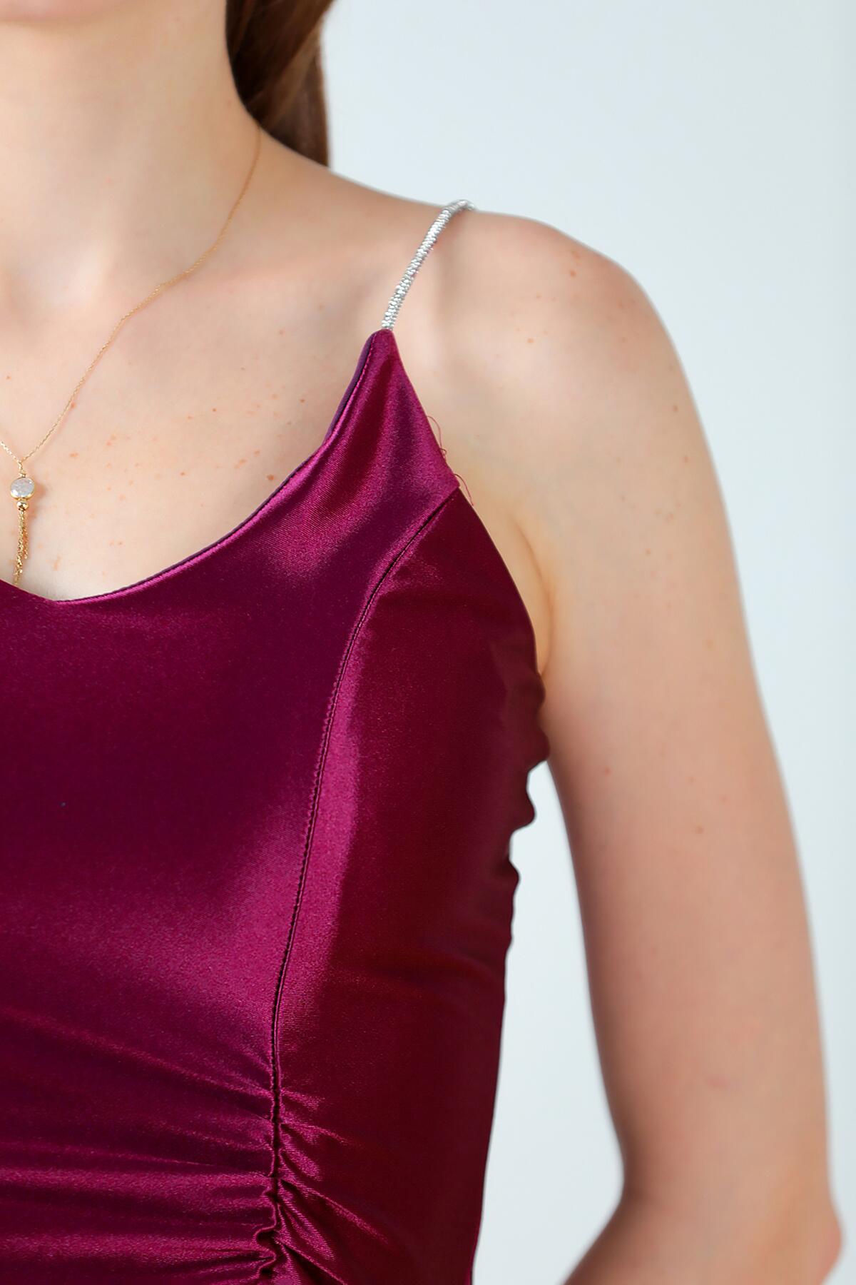 Kadın Saten Kısa Abiye elbise Mürdüm