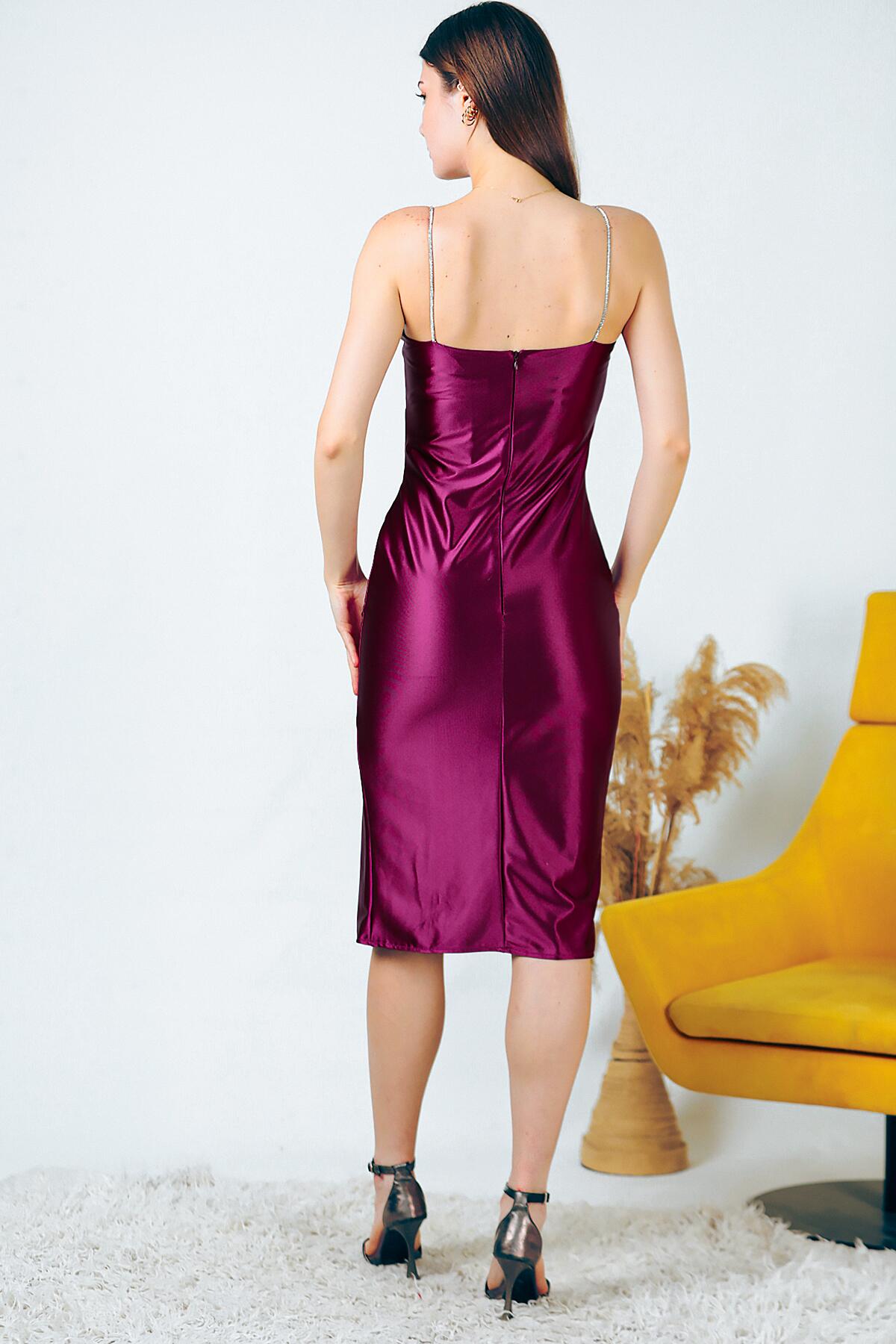 Kadın Saten Midi Boy abiye Elbise Mürdüm