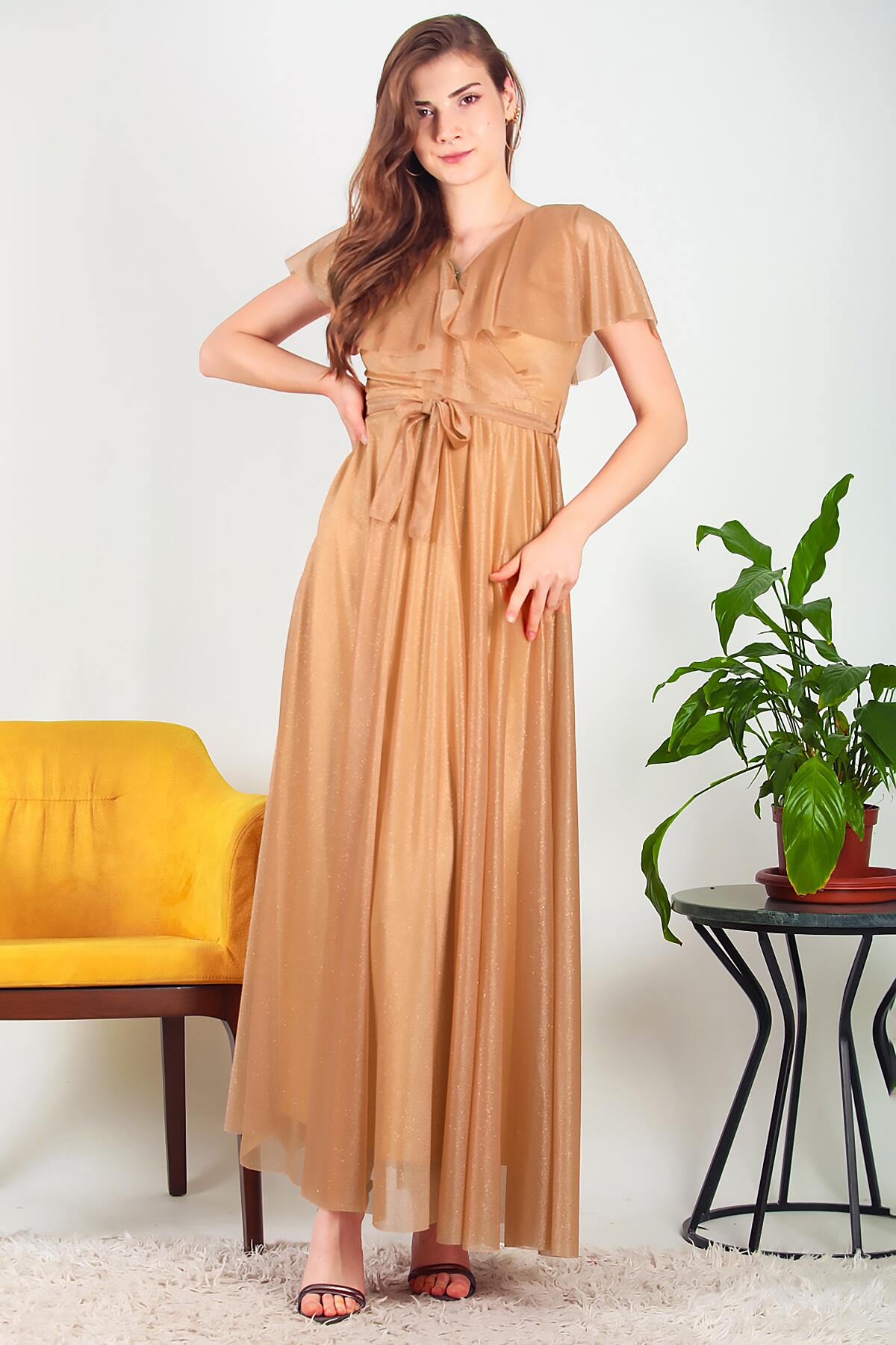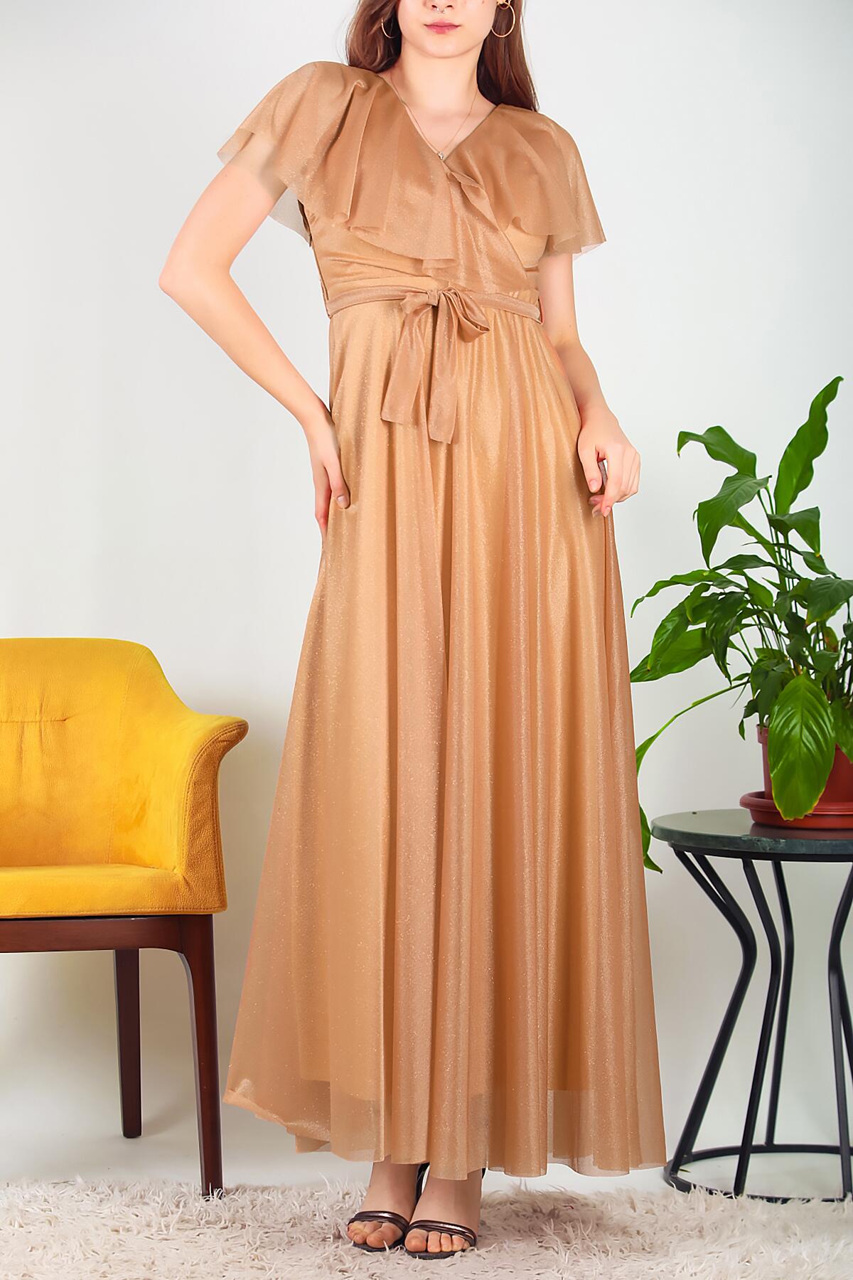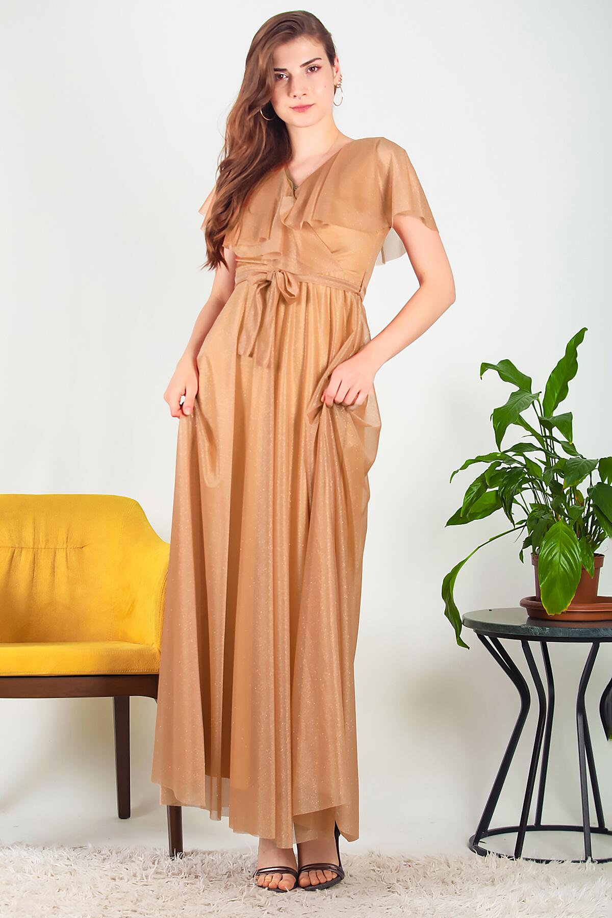 Kadın Simli Uzun Abiye Bej