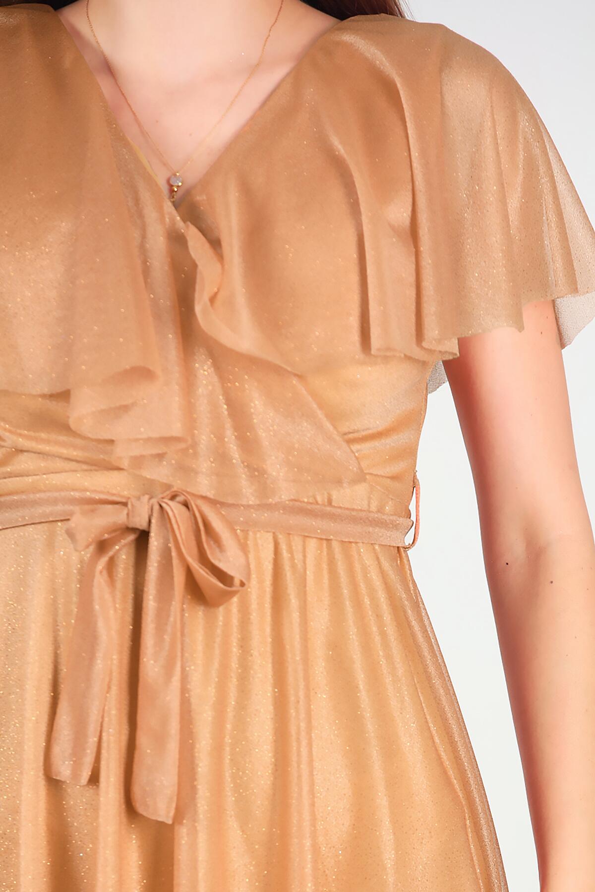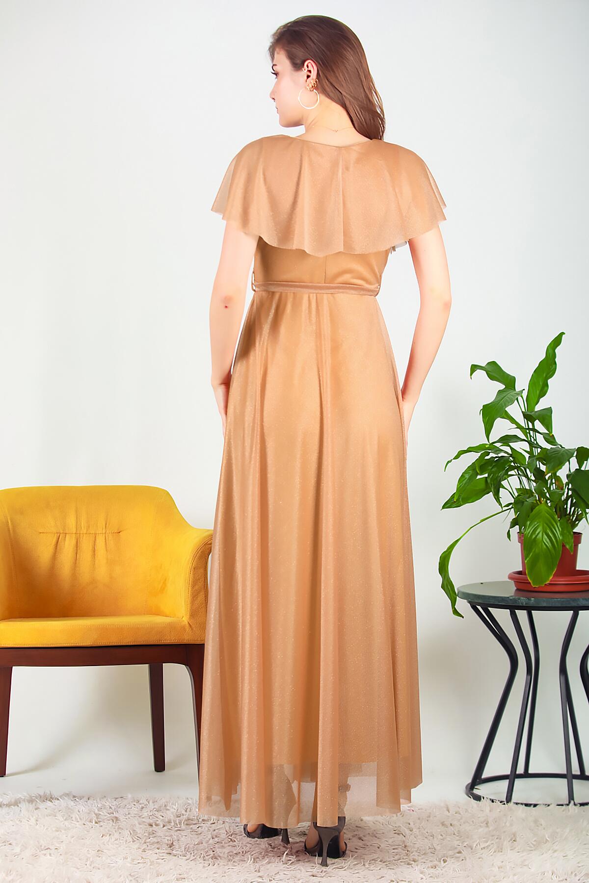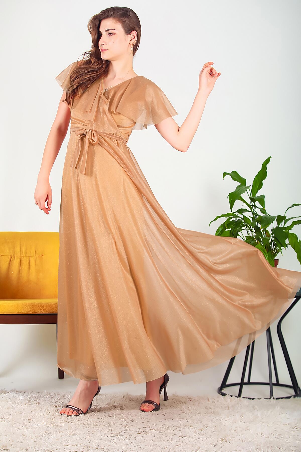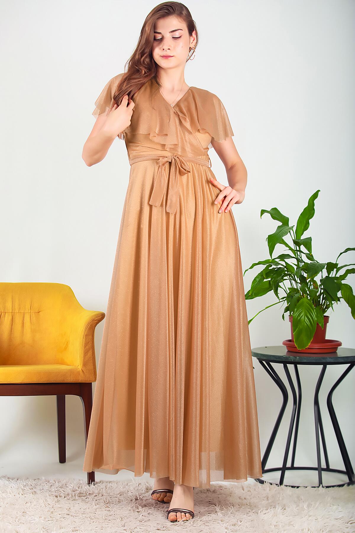 Kadın Simli Uzun Abiye Bej