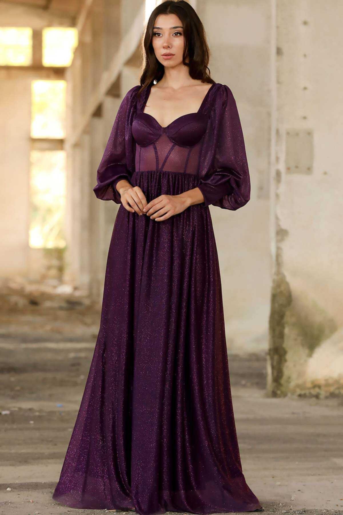 Kadın Simli Uzun Abiye Mor