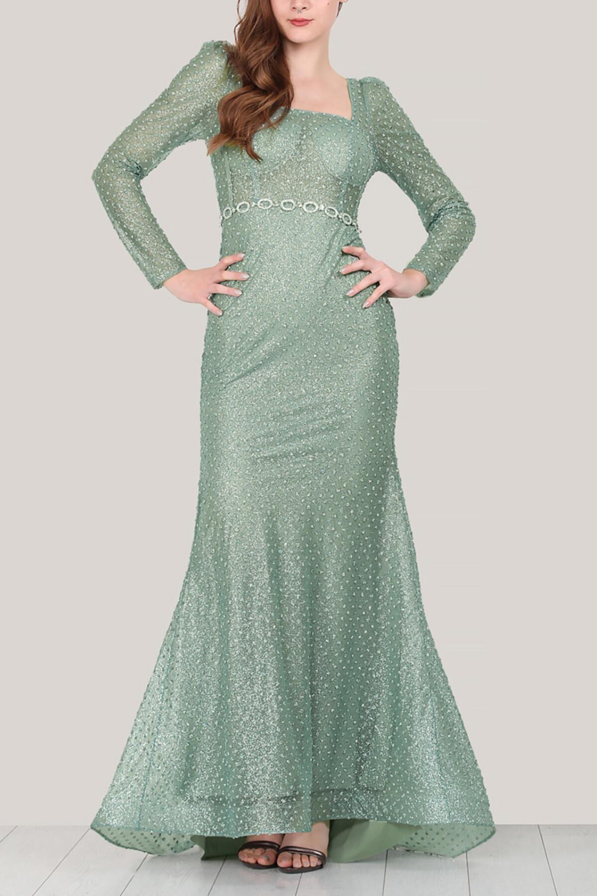 Kadın Simli Uzun Abiye Su Yeşili