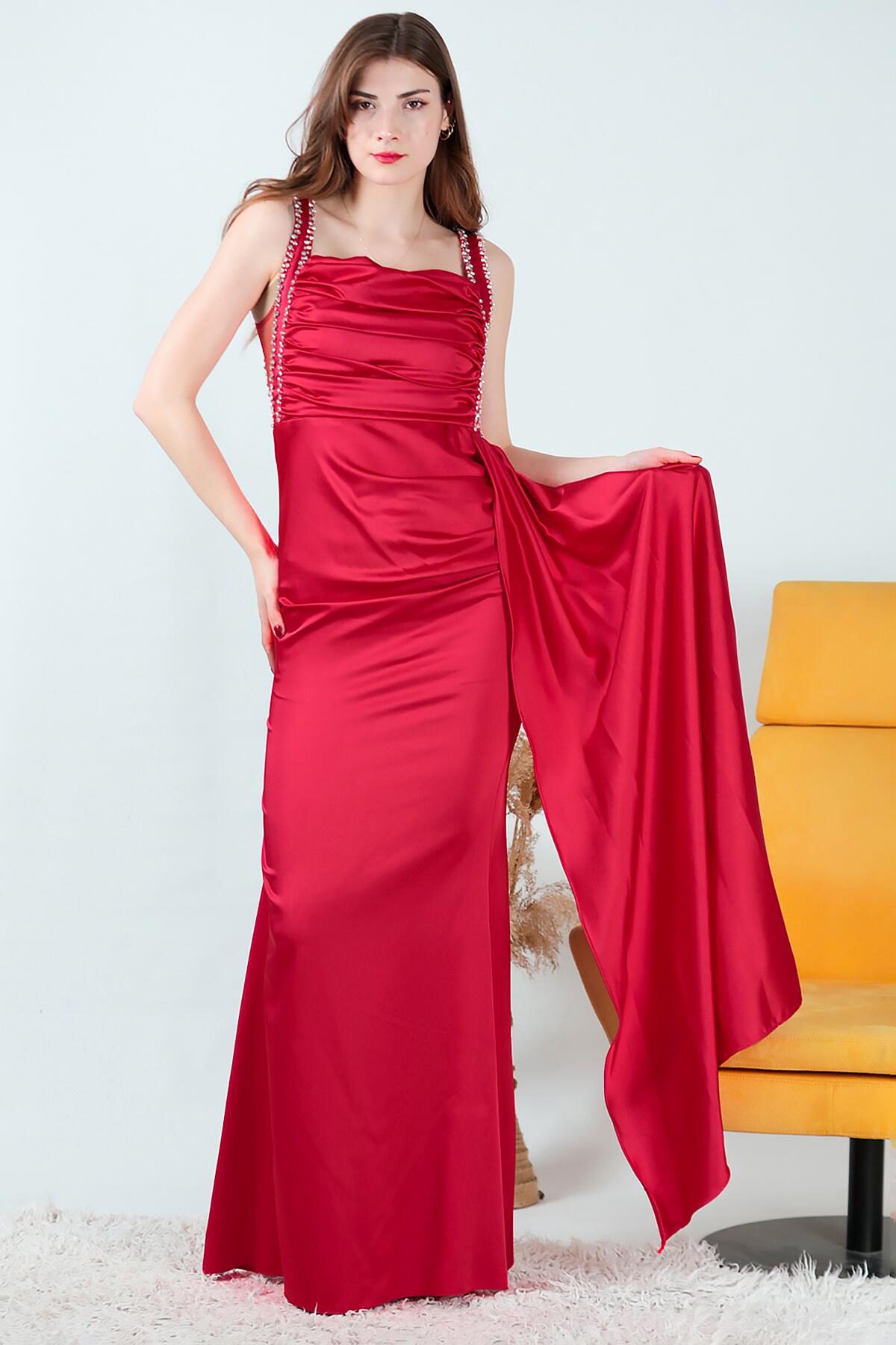Kadın Taşlı Saten Uzun Abiye Kırmızı