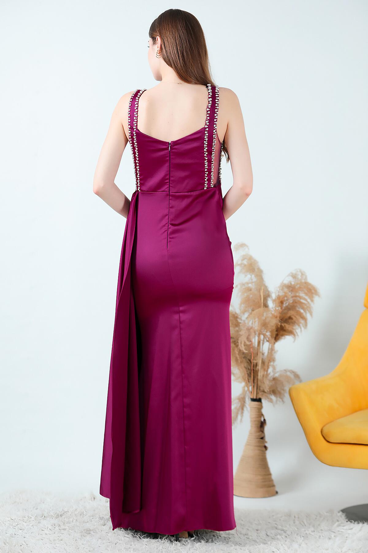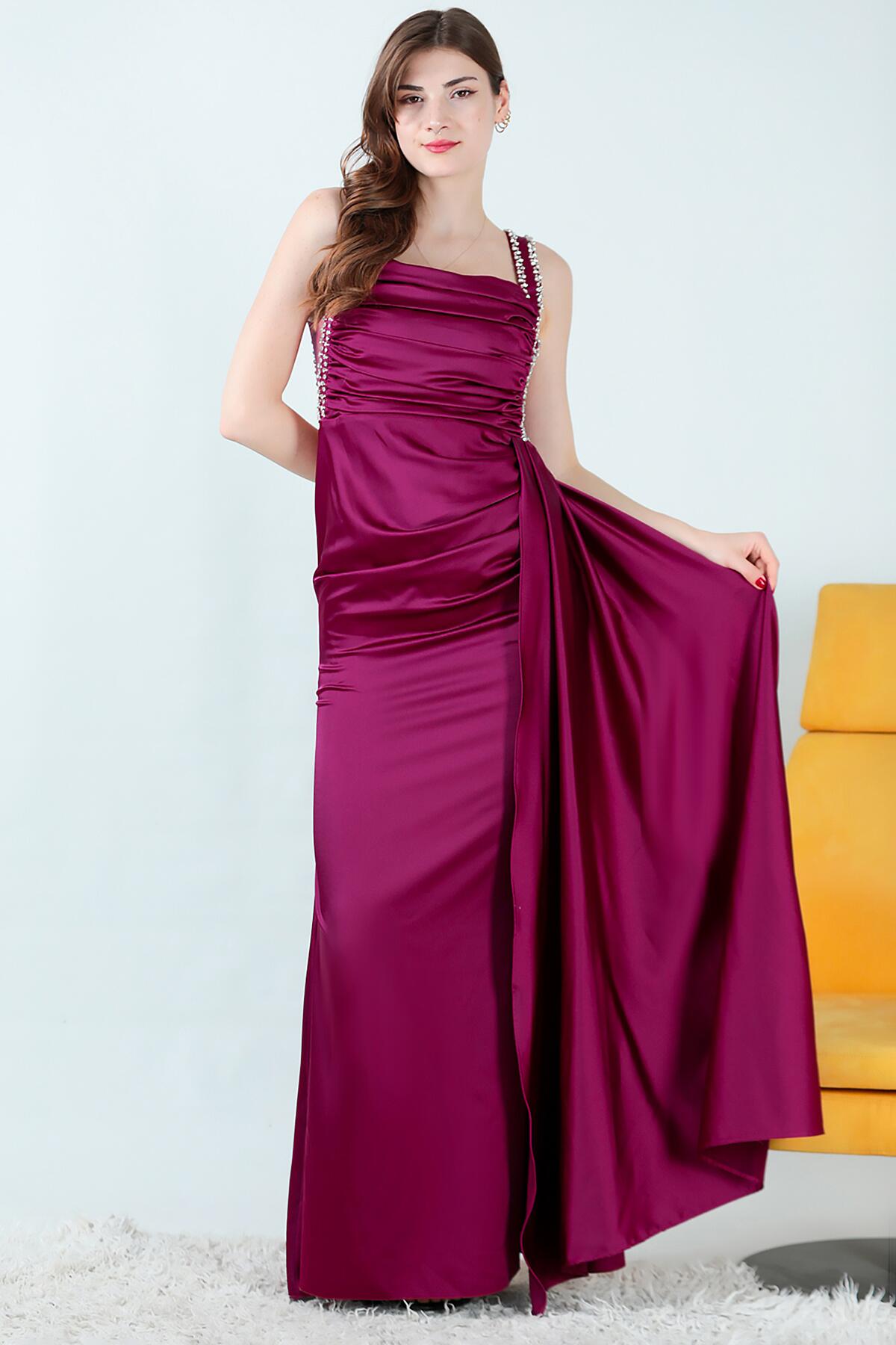 Kadın Taşlı Saten Uzun Abiye Mürdüm