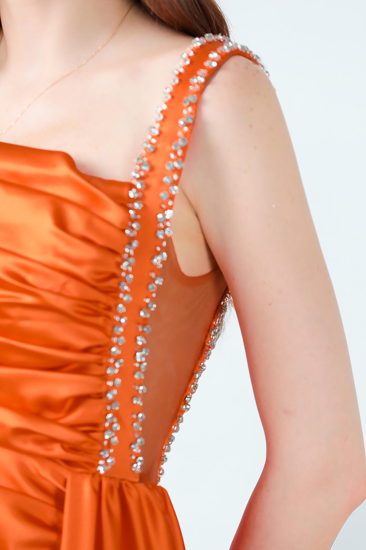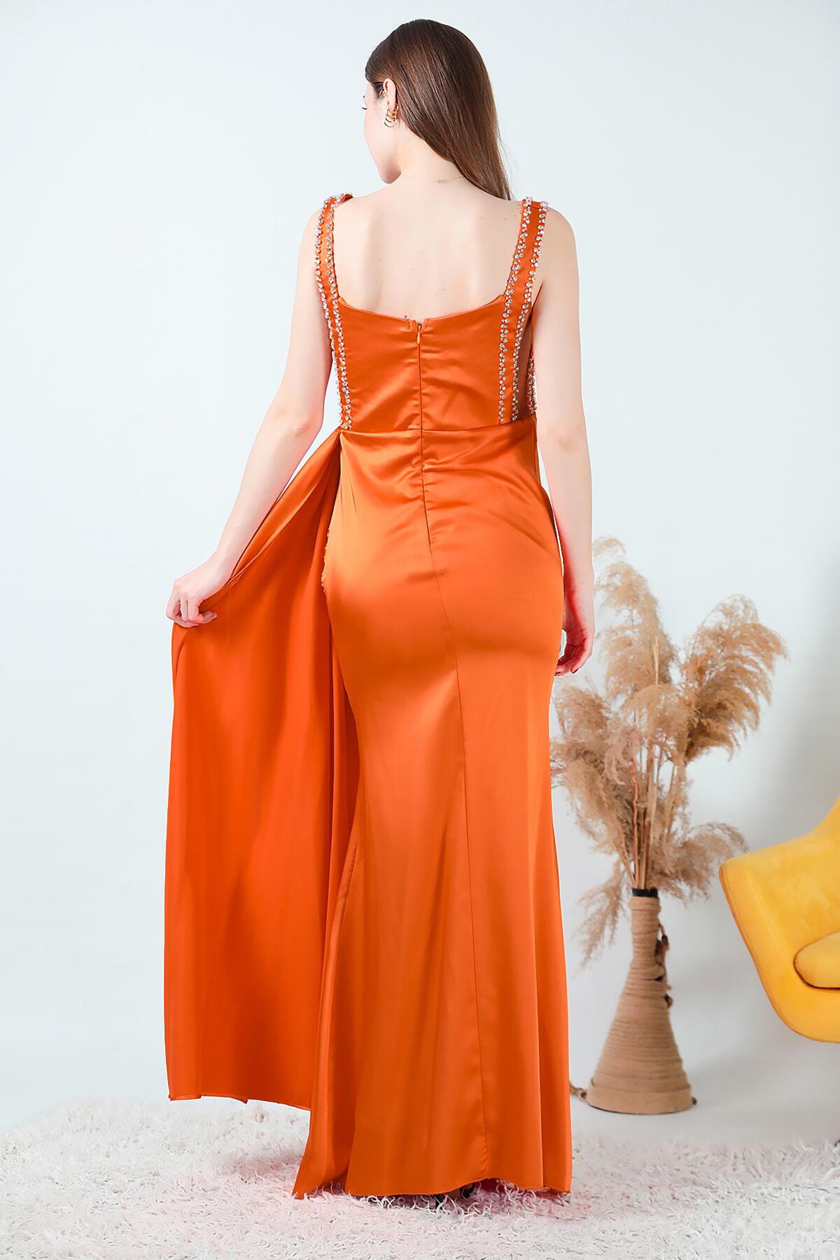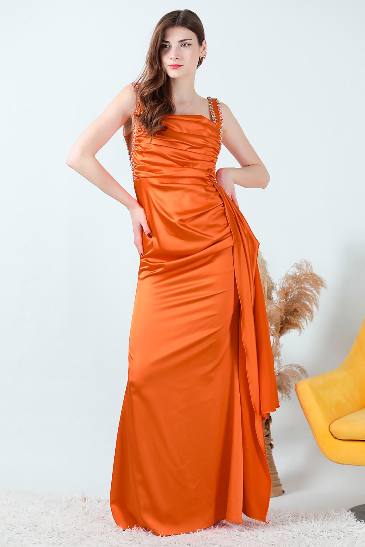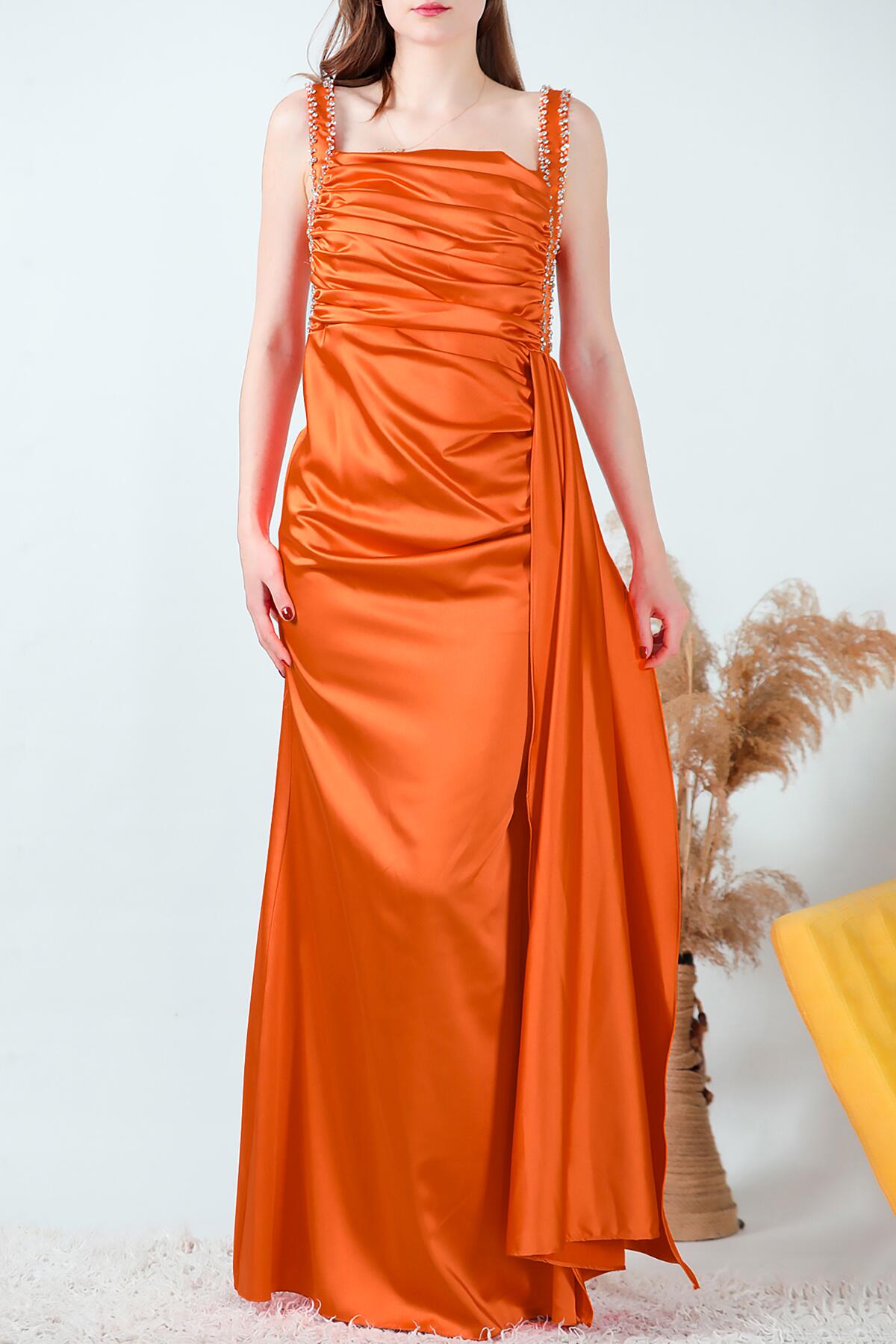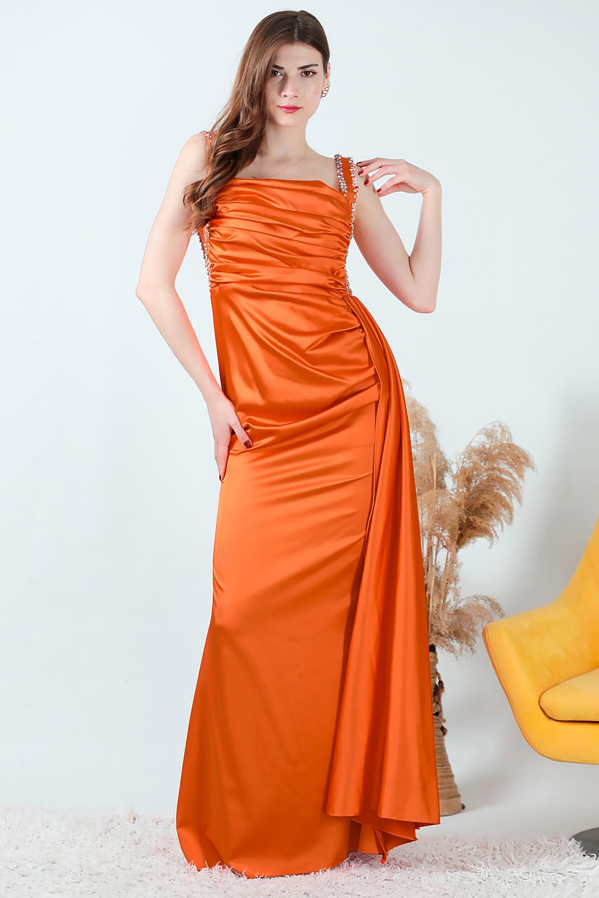 Kadın Taşlı Saten Uzun Abiye Turuncu