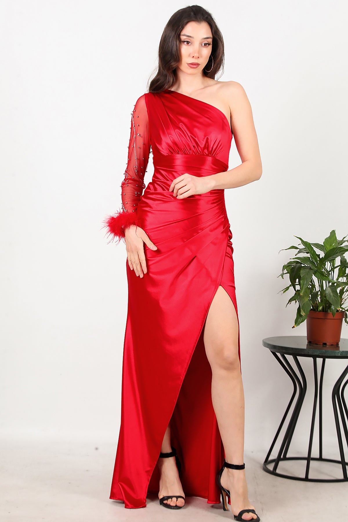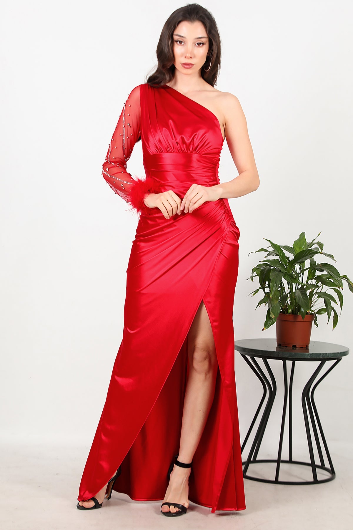 Kadın Tek Kol Taşlı Uzun Saten Abiye Kırmızı