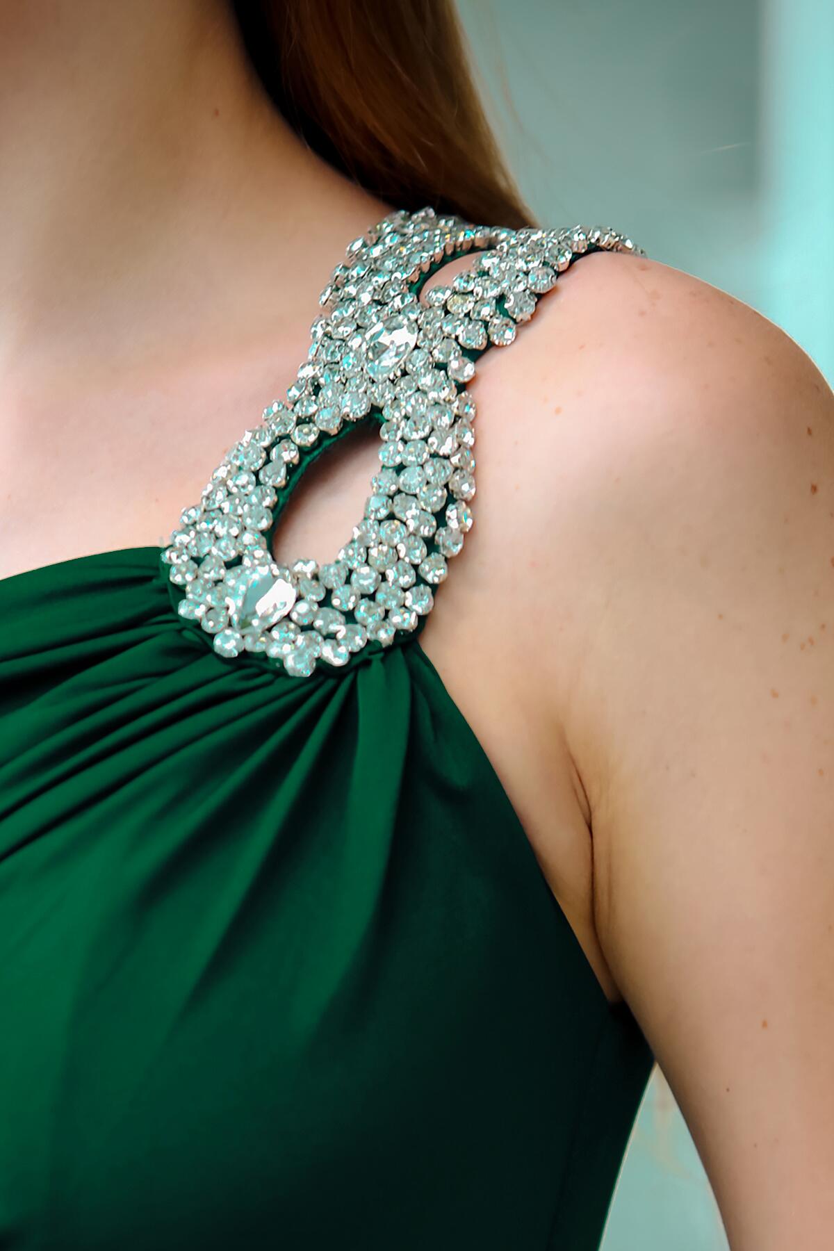 Kadın Tek Omuz Taşlı Abiye Elbise Zümrüt
