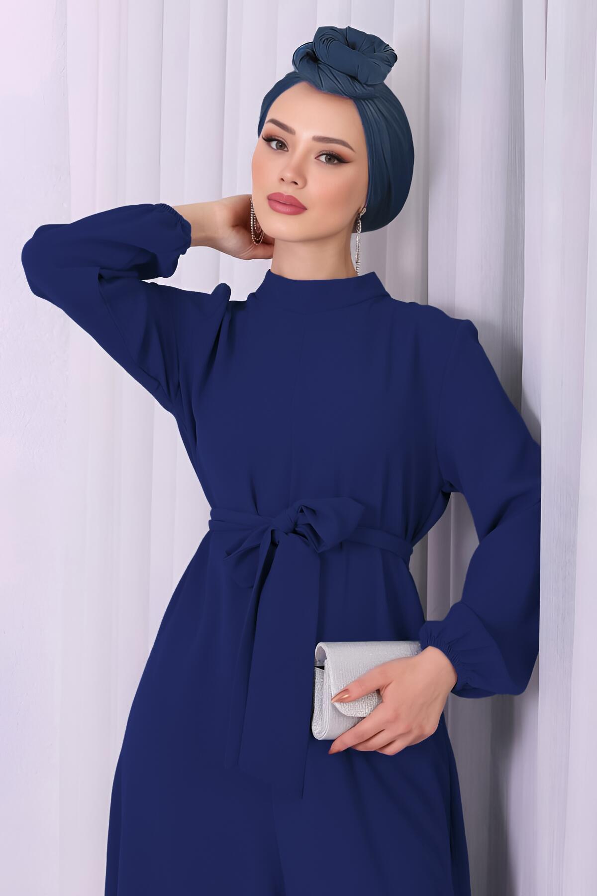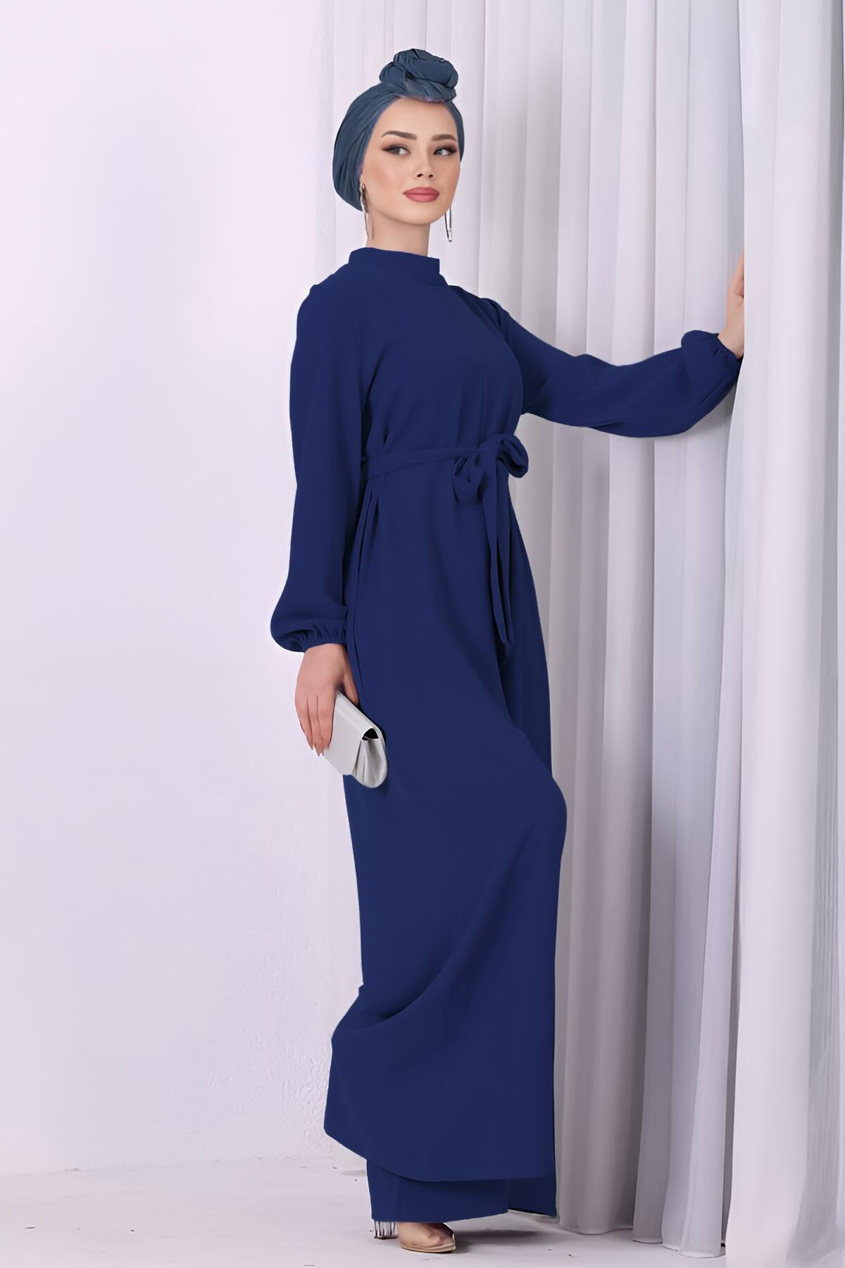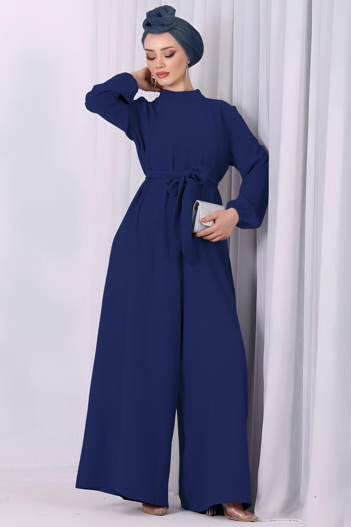 Numune Bedeni: 38 Numune Boyu: 145 cm Kumaş Tipi: % 65 Pamuk % 35 Polyester Kol: Balon KolPaça: Bol Paça Bel: Beli Kuşaktan Kemerli