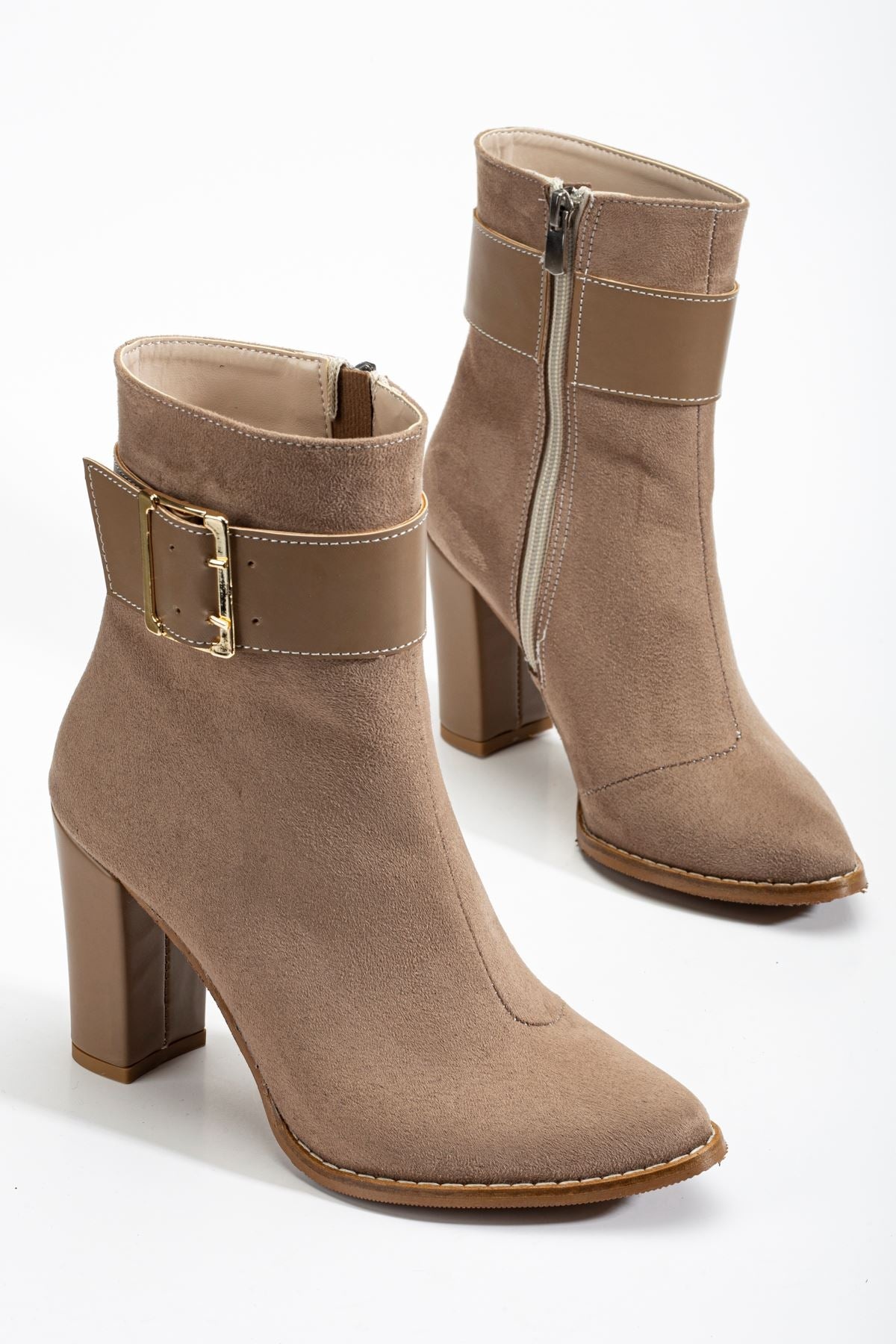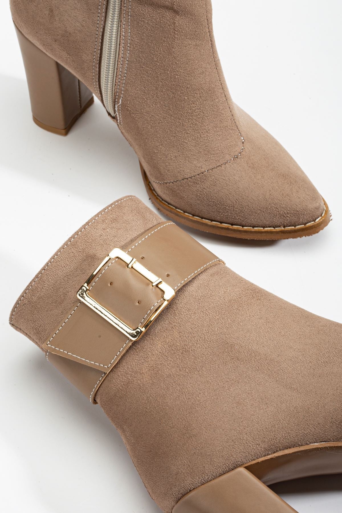 Destina Bej Süet Sivri Burunlu Fermuarlı Kalın Topuklu Bot