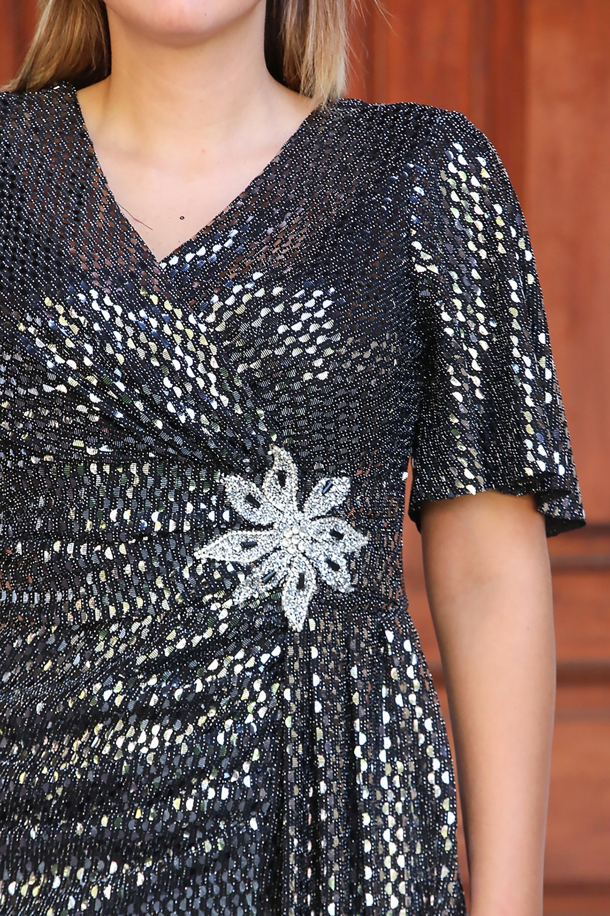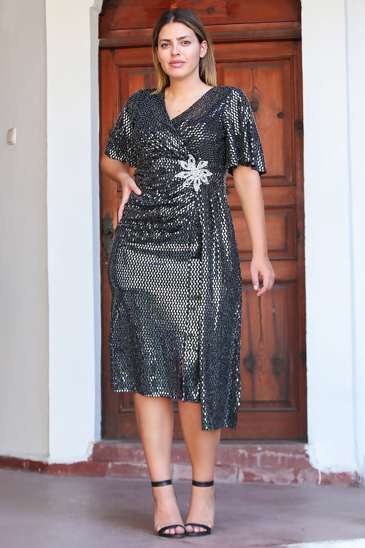 Büyük Beden Bel Çiçek Motif Taşlı Kısa Abiye Gümüş