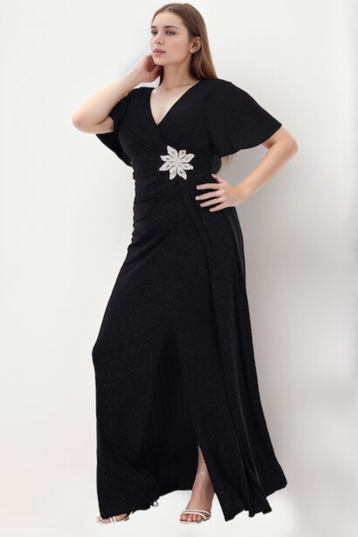 Büyük Beden Bel Çiçek Taşlı Uzun Simli Abiye Siyah