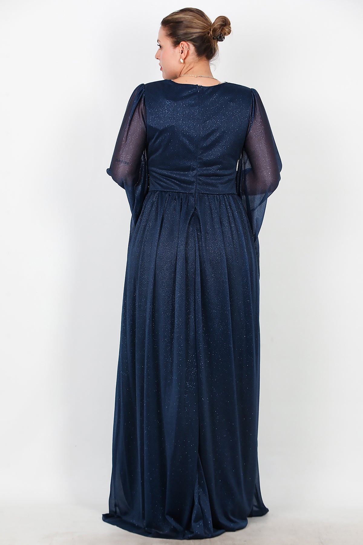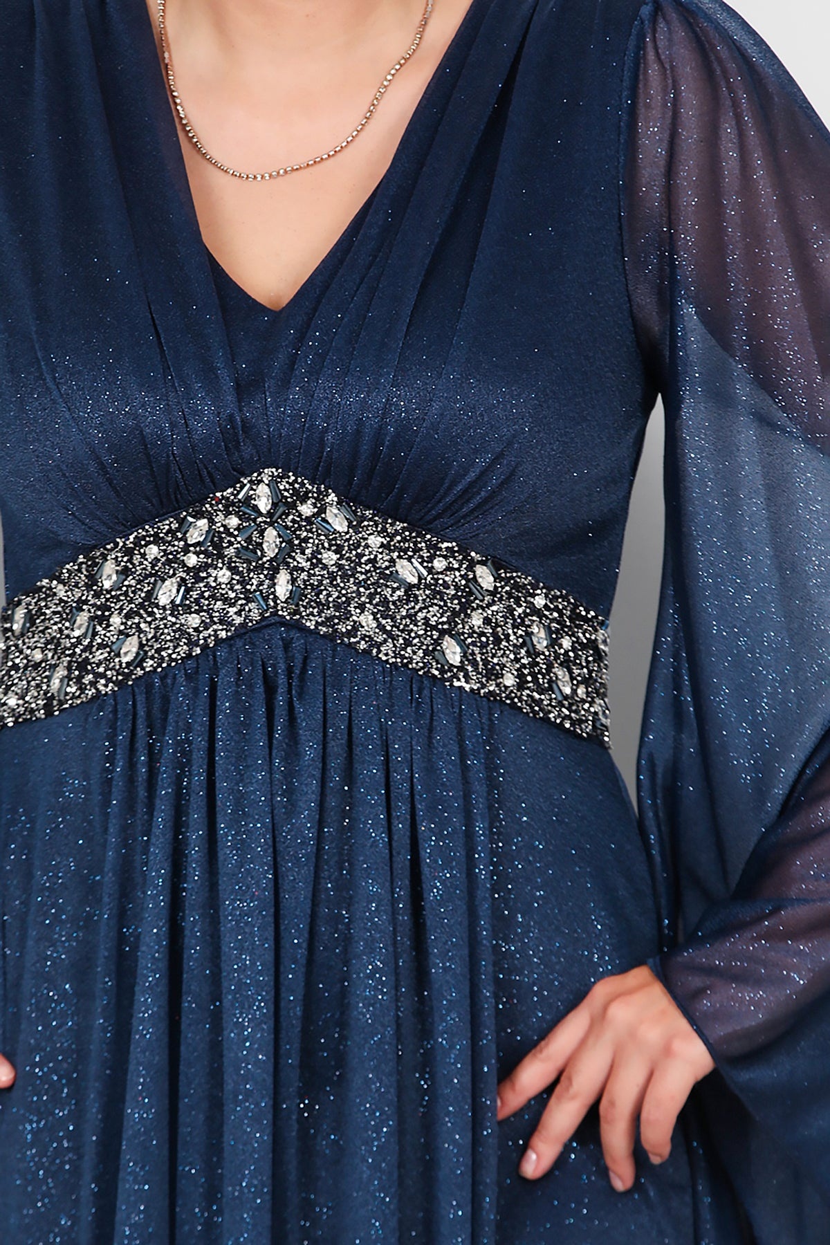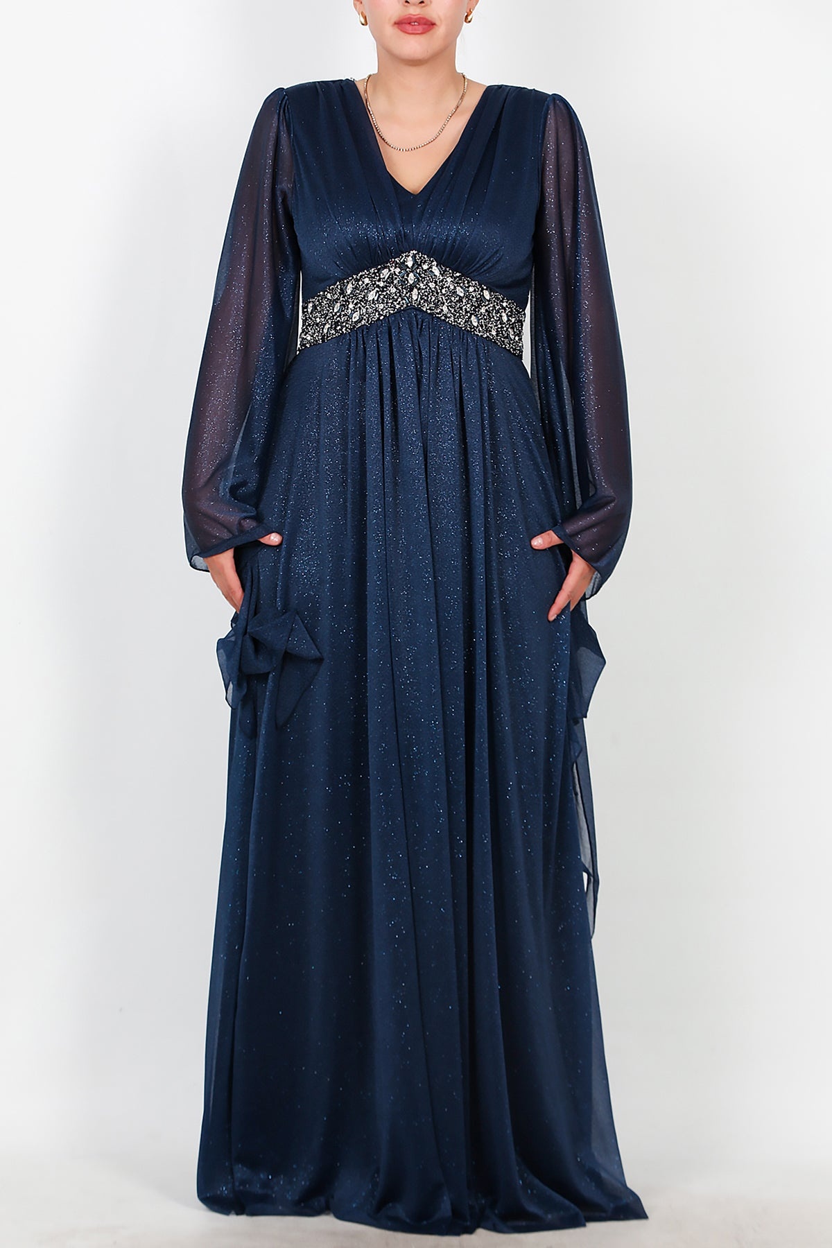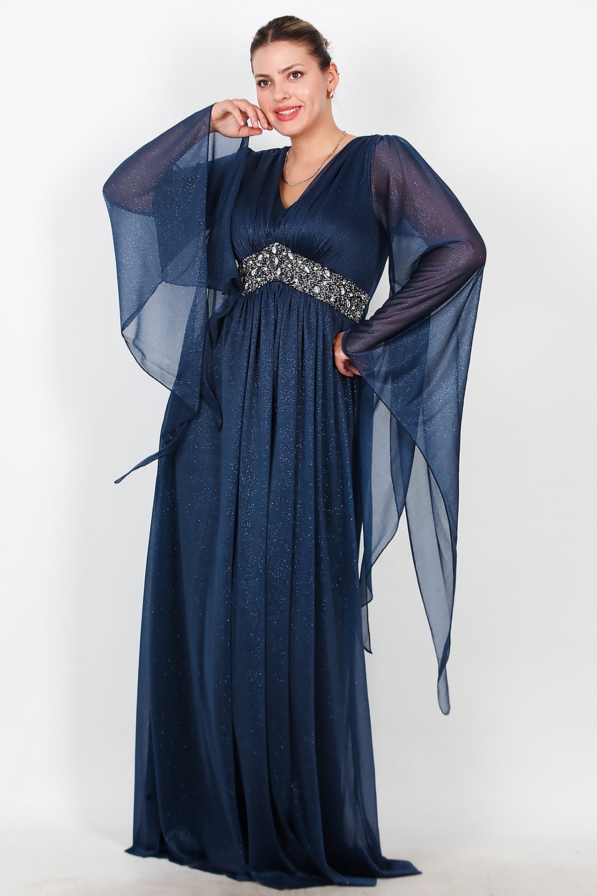 Büyük Beden Bel Taşlı Uzun Simli Abiye Lacivert