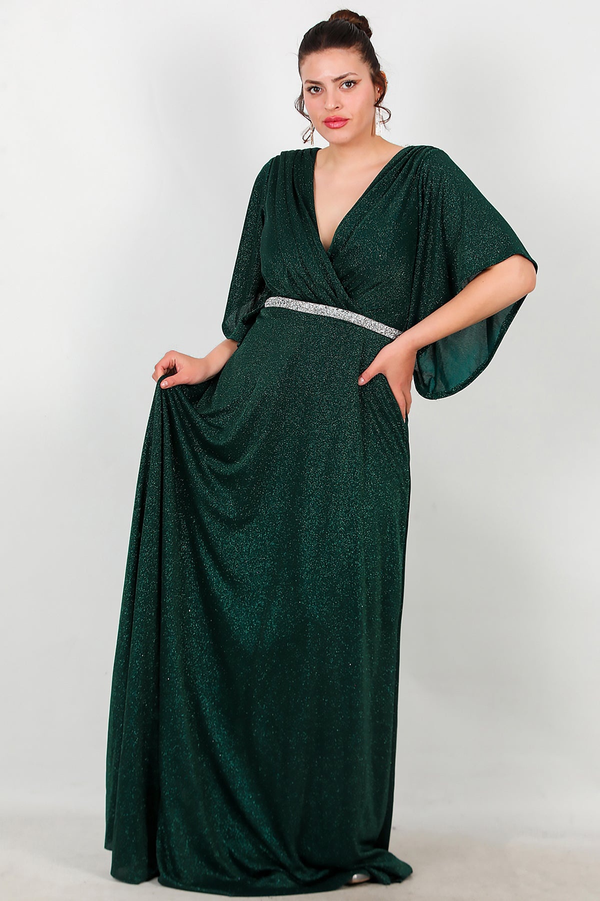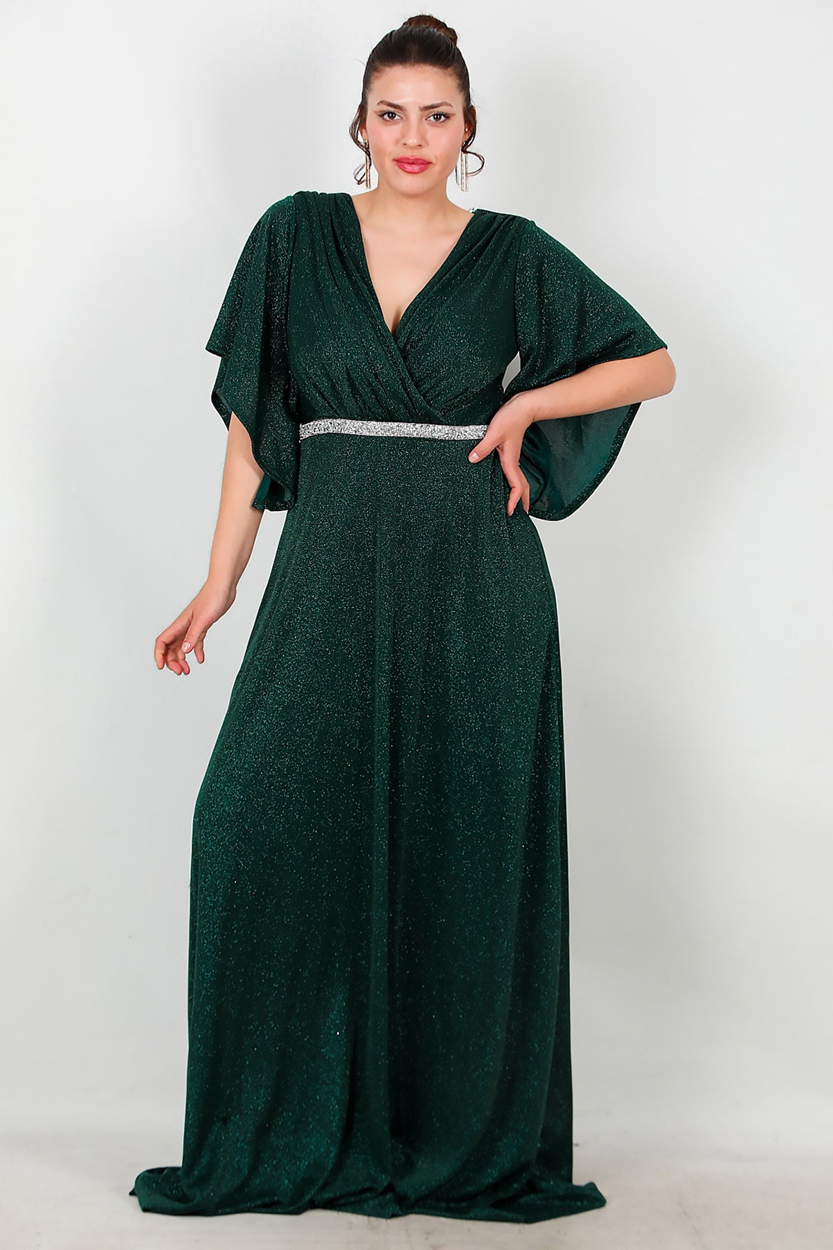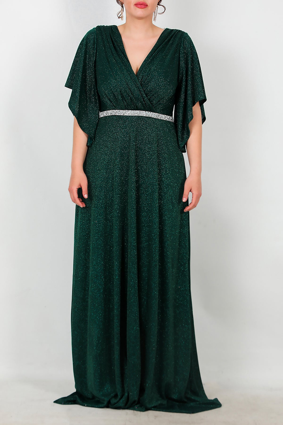 Büyük Beden Beli Taş Şeritli Uzun Abiye Zümrüt