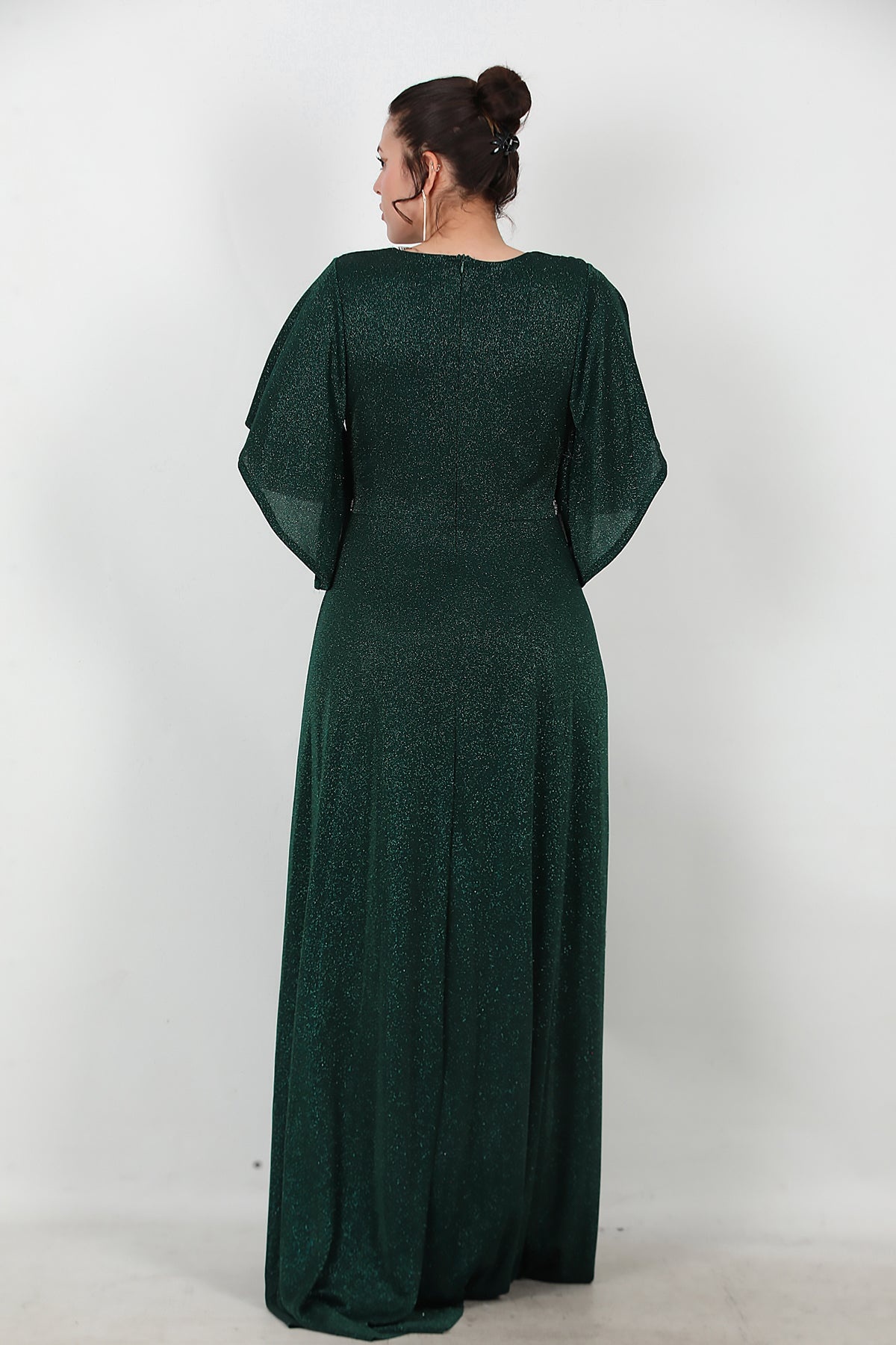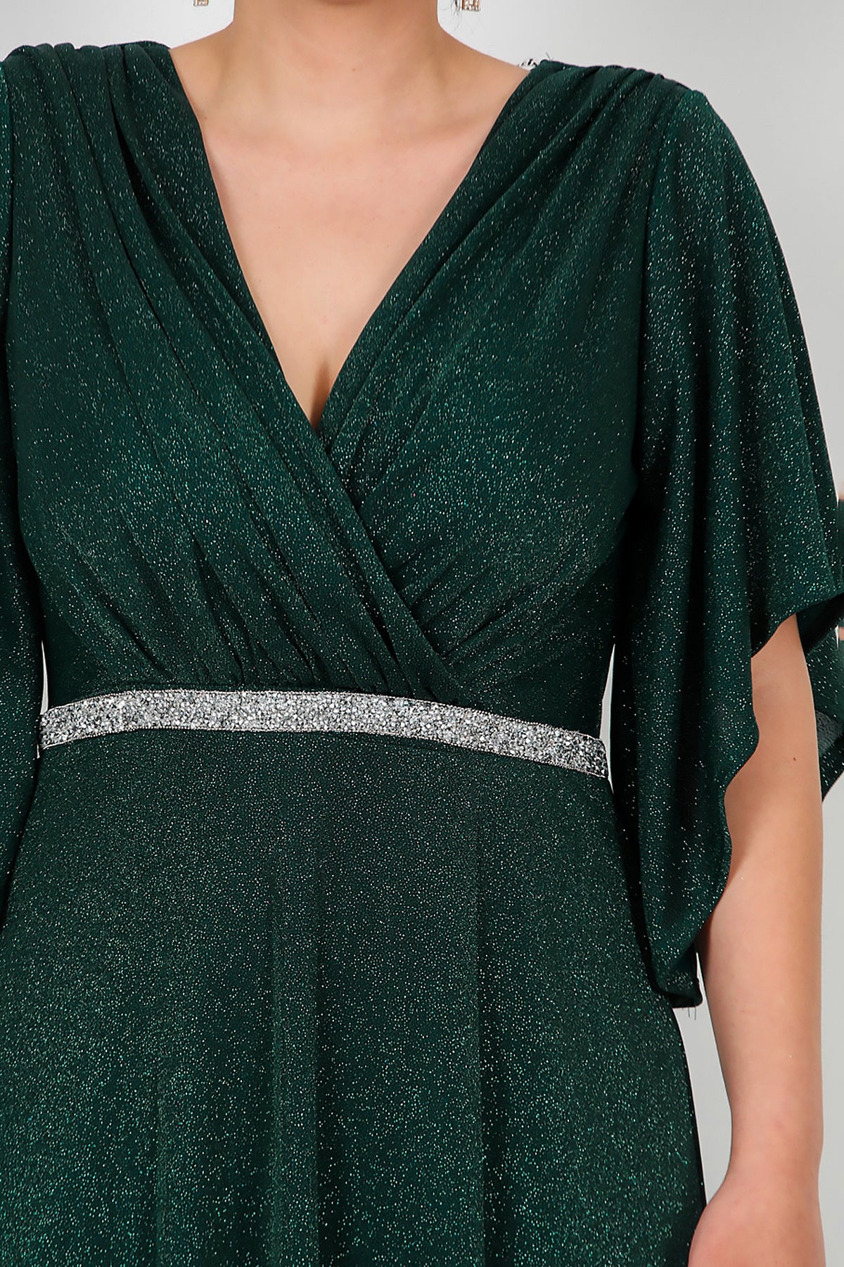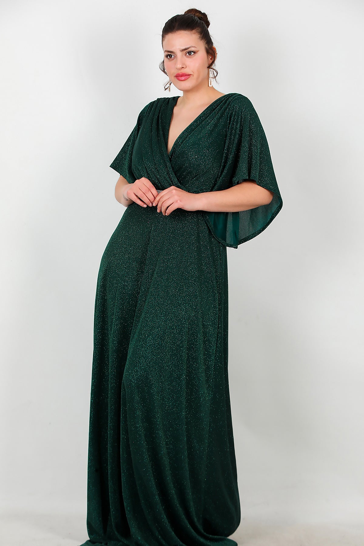 Büyük Beden Beli Taş Şeritli Uzun Abiye Zümrüt