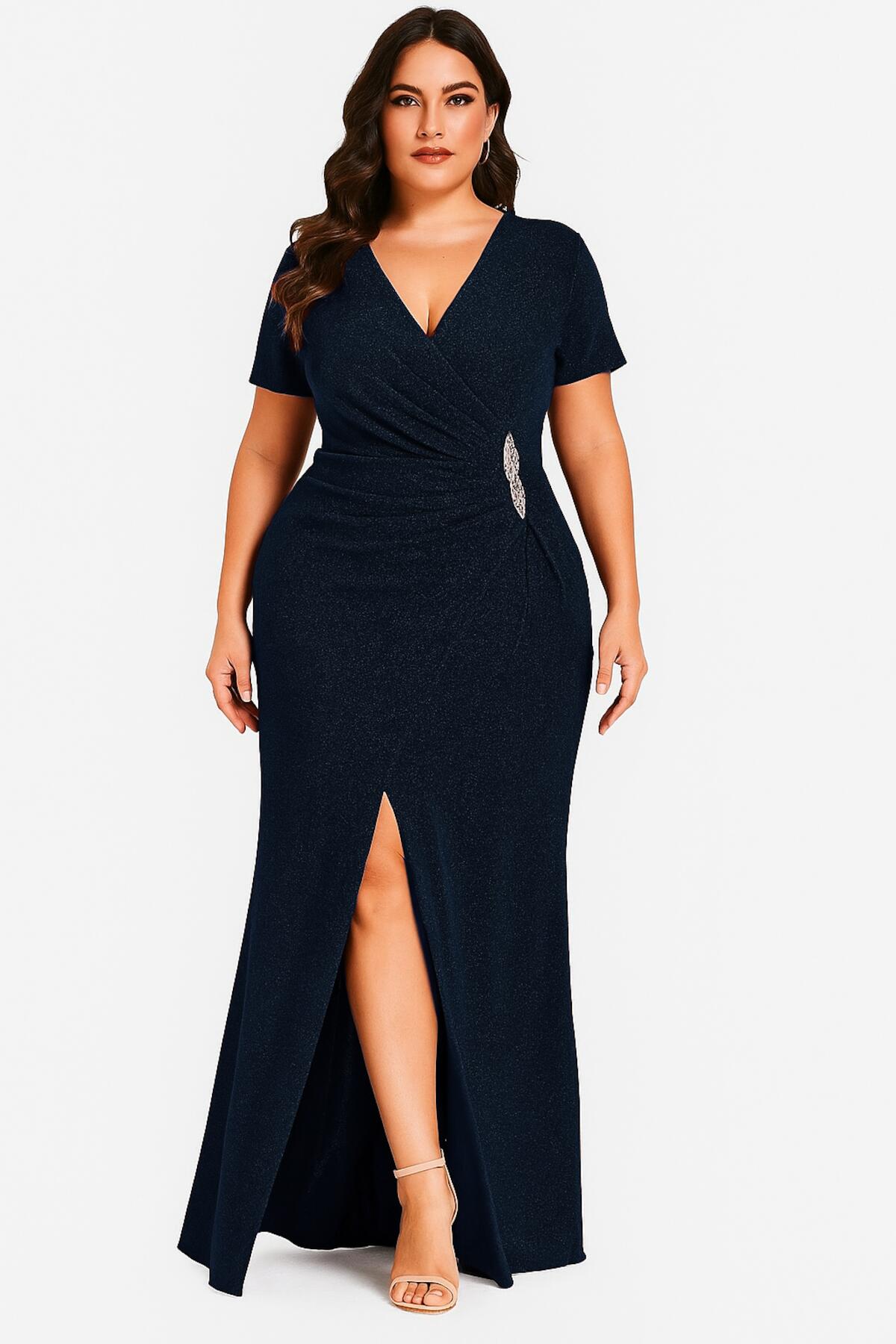Büyük Beden Beli Taşlı Kısa Kol Uzun Simli Abiye Lacivert