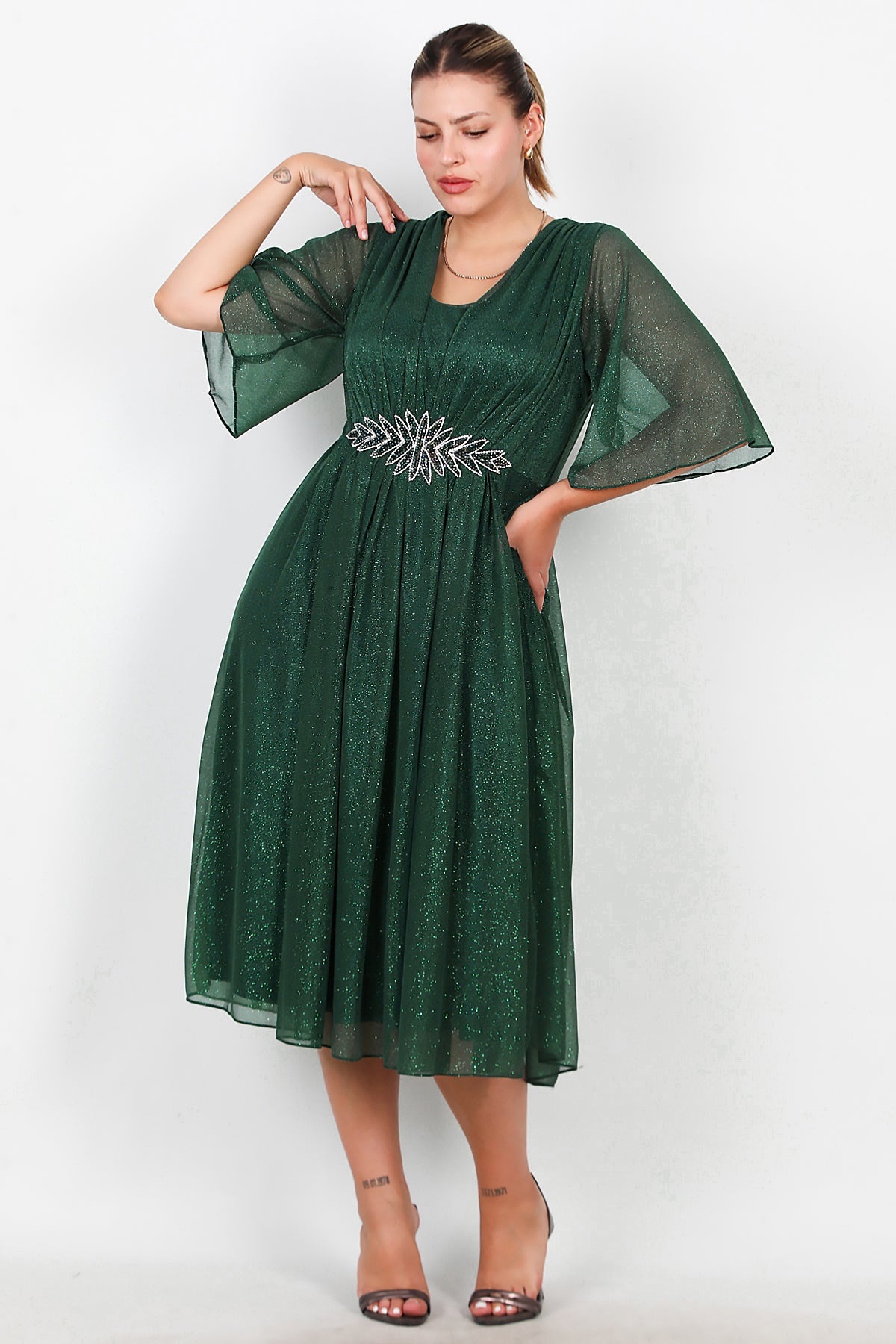Büyük Beden Beli Taşlı Midi Boy Simli Tül Elbise Zümrüt