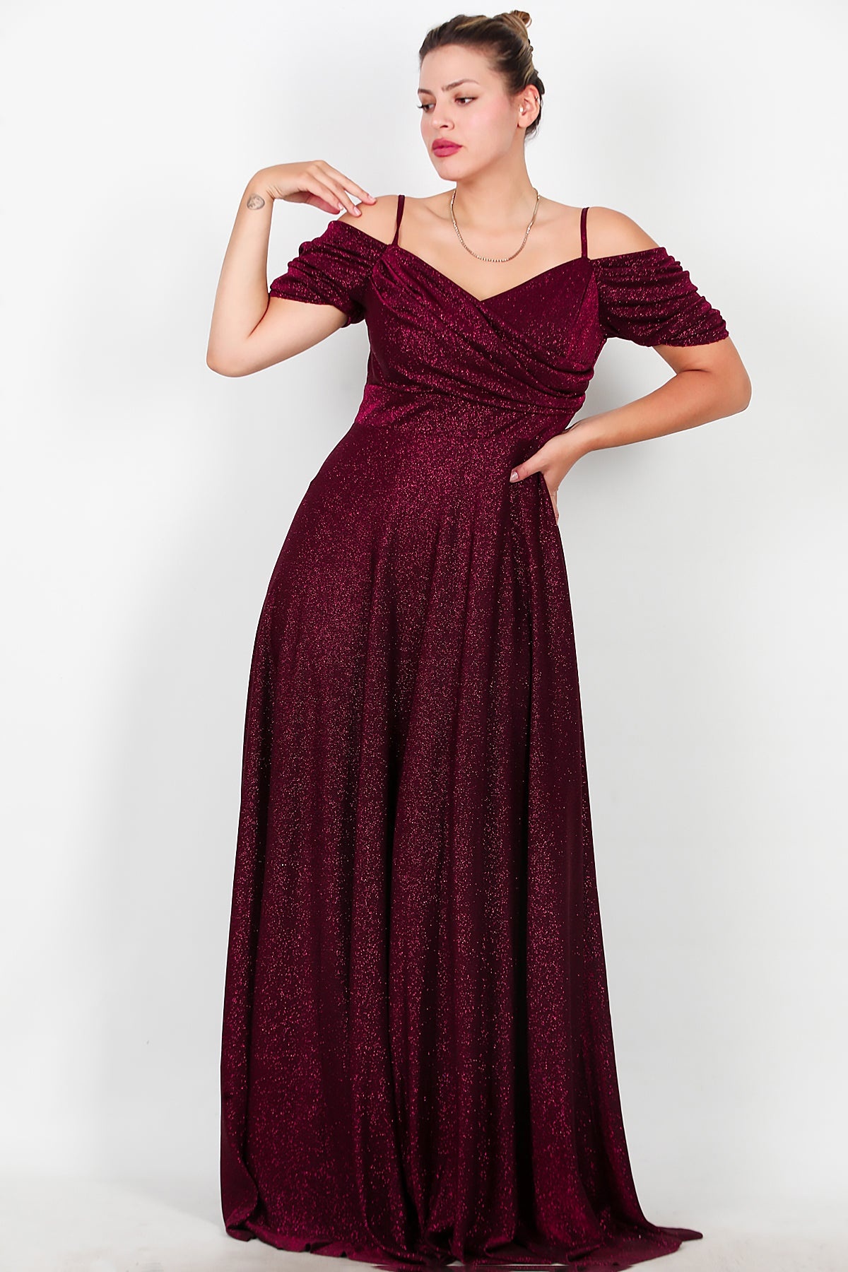 Büyük Beden Düşük Omuz Simli Uzun Abiye Bordo