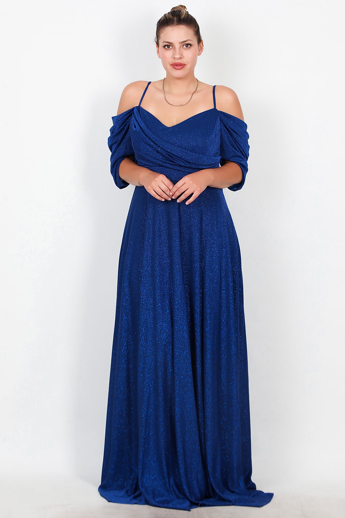 Büyük Beden Düşük Omuz Simli Uzun Abiye Saks