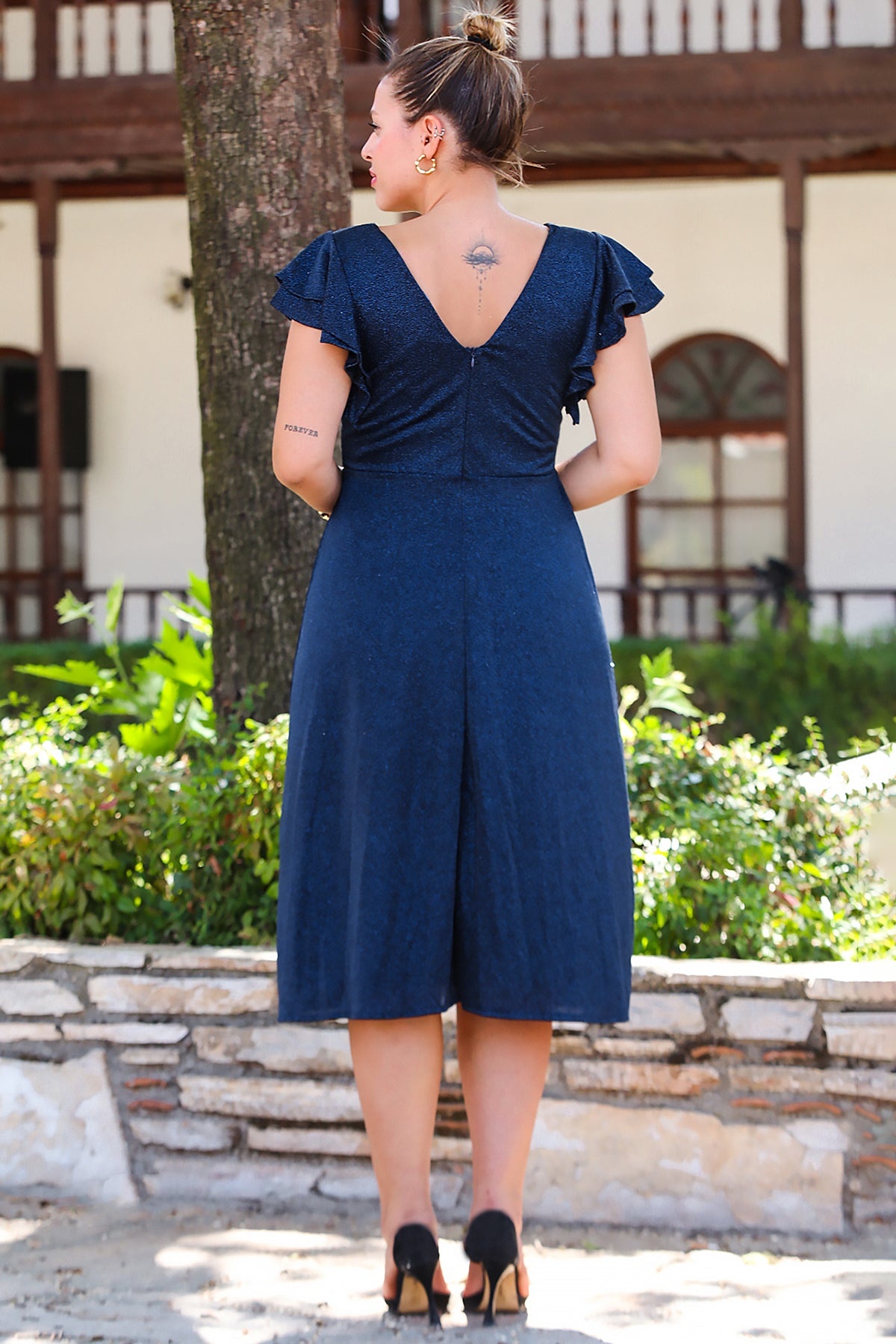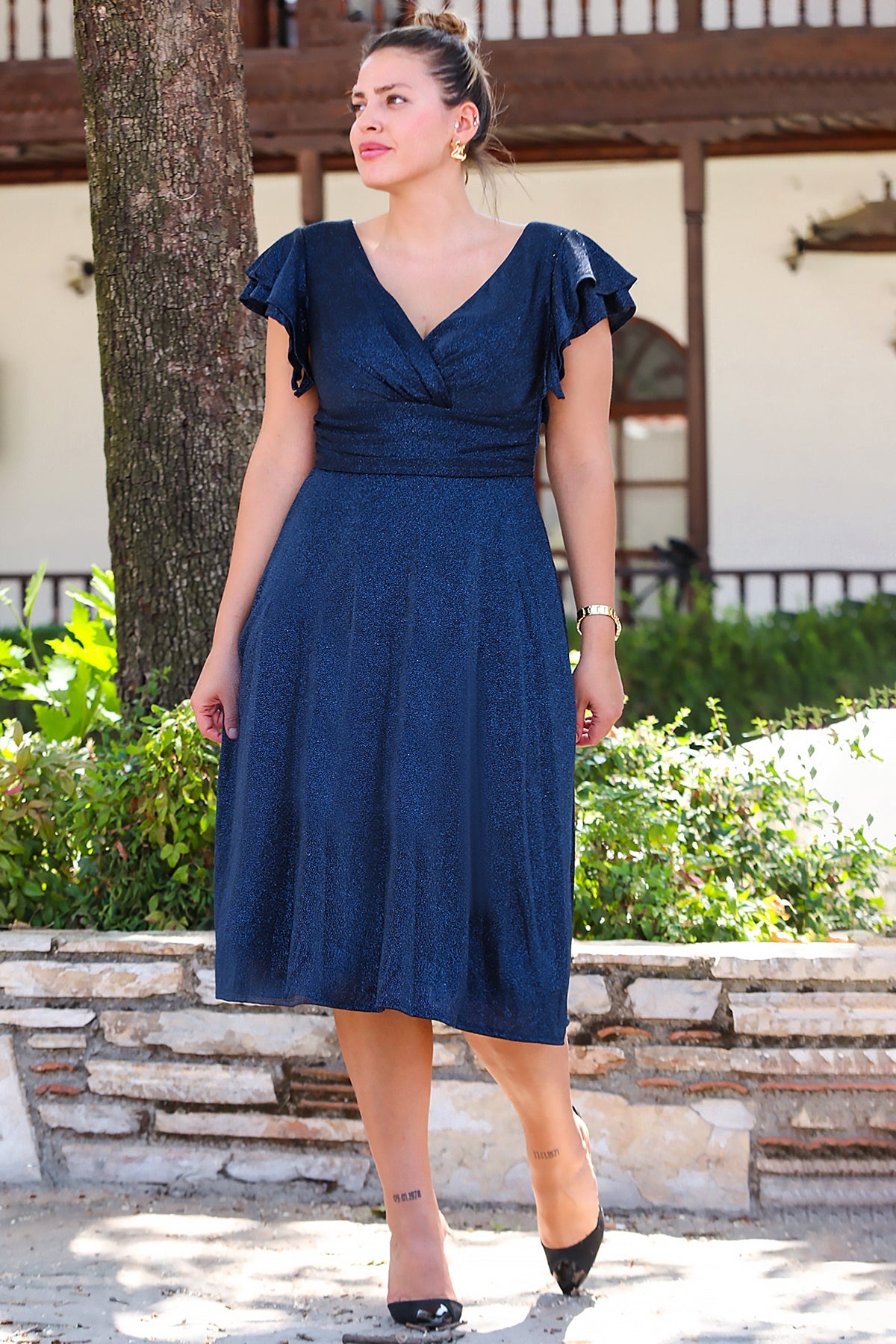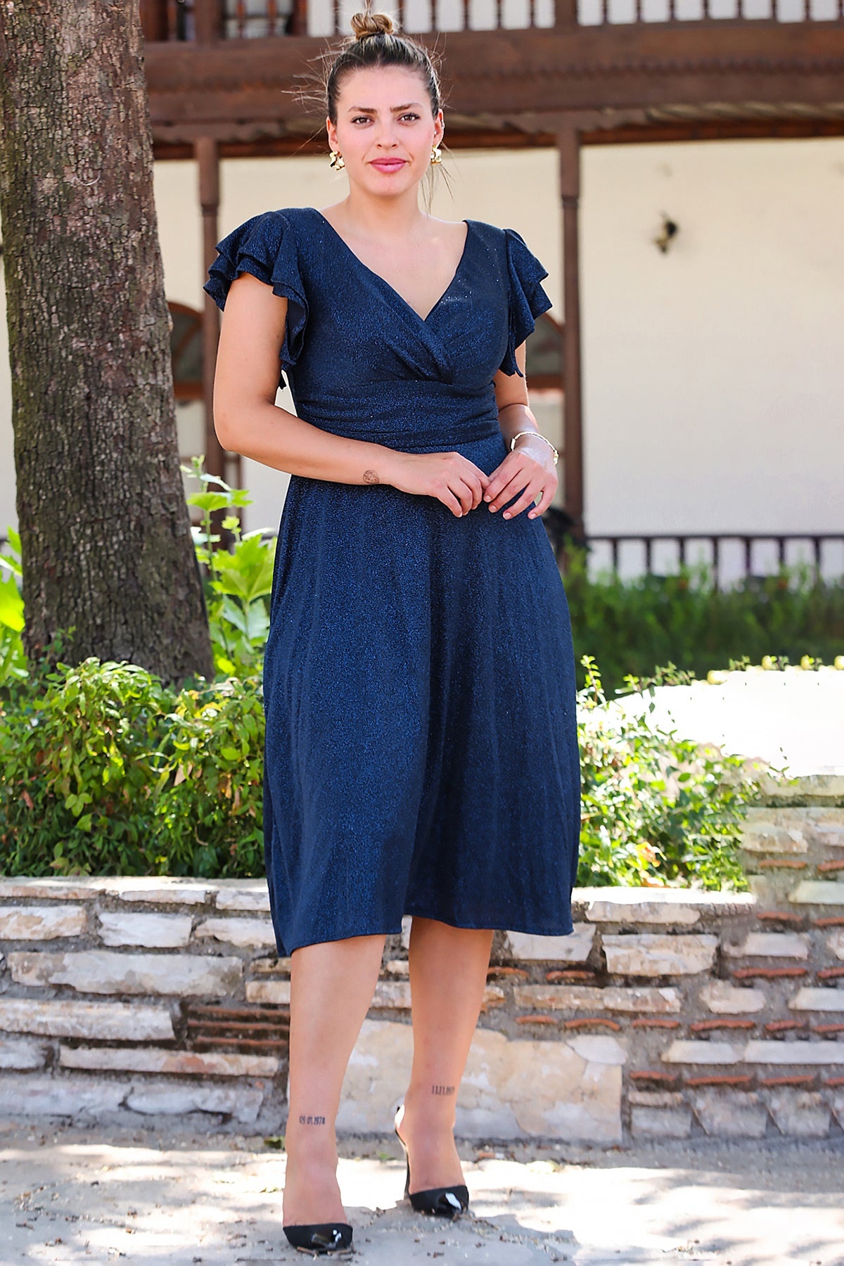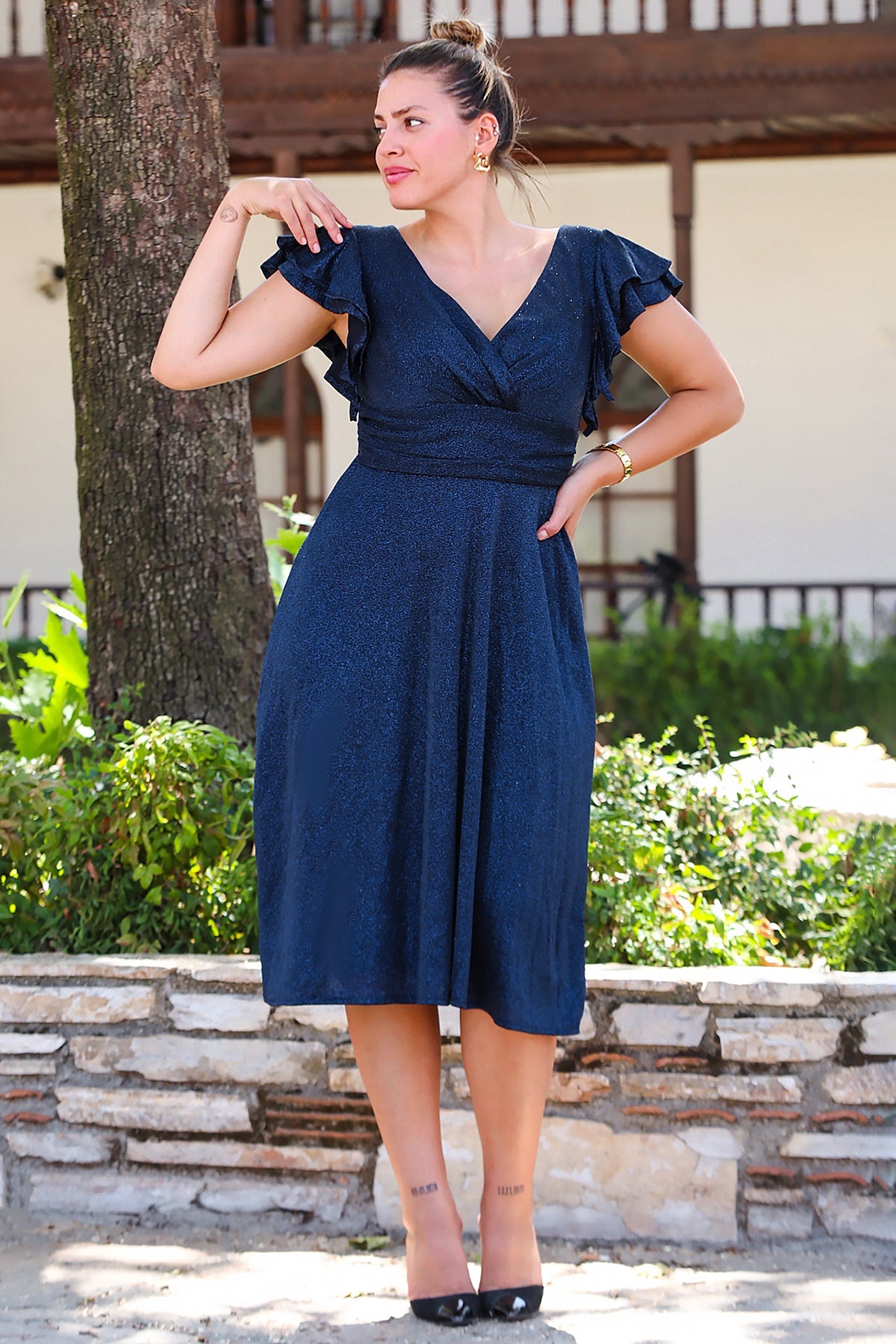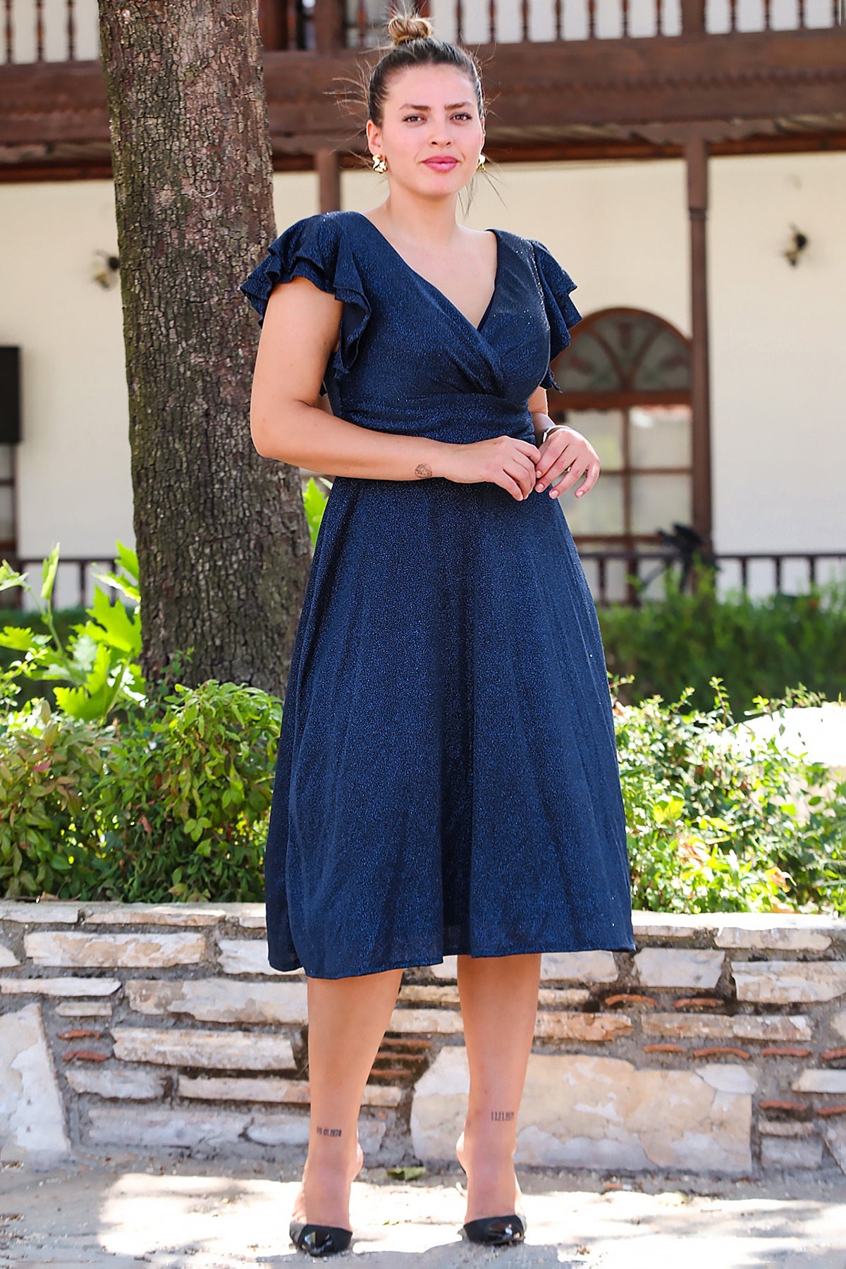 Büyük Beden Kol Katlı Simli Kısa Abiye Lacivert