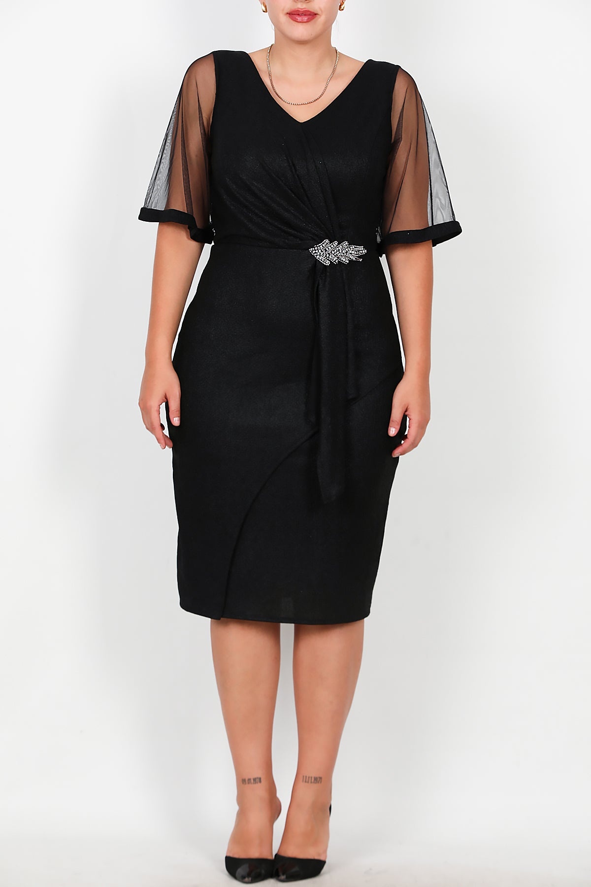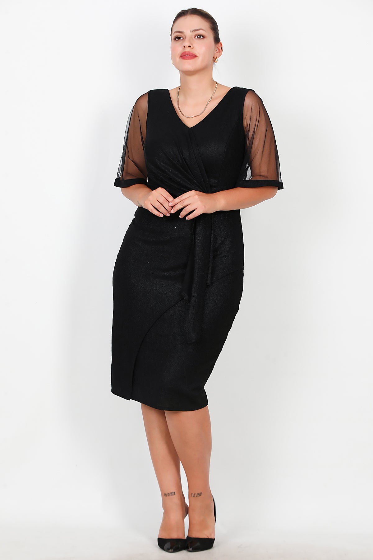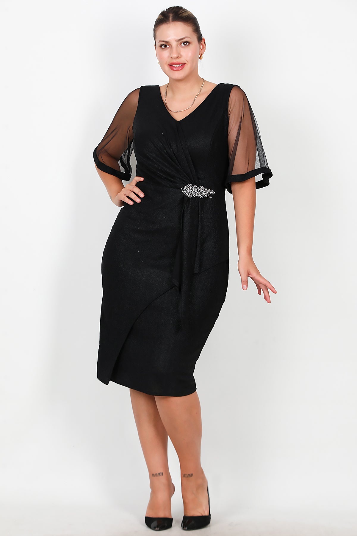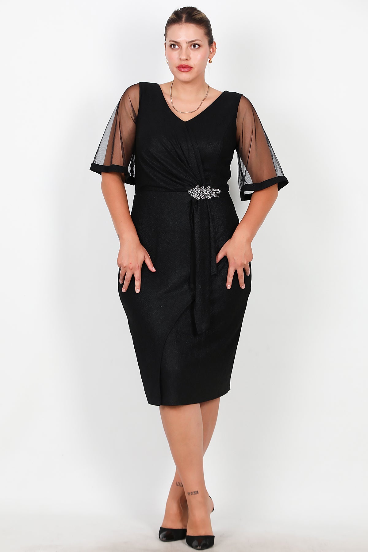 Büyük Beden Tül Kol Bel Aksesuarlı Midi Boy Abiye Siyah