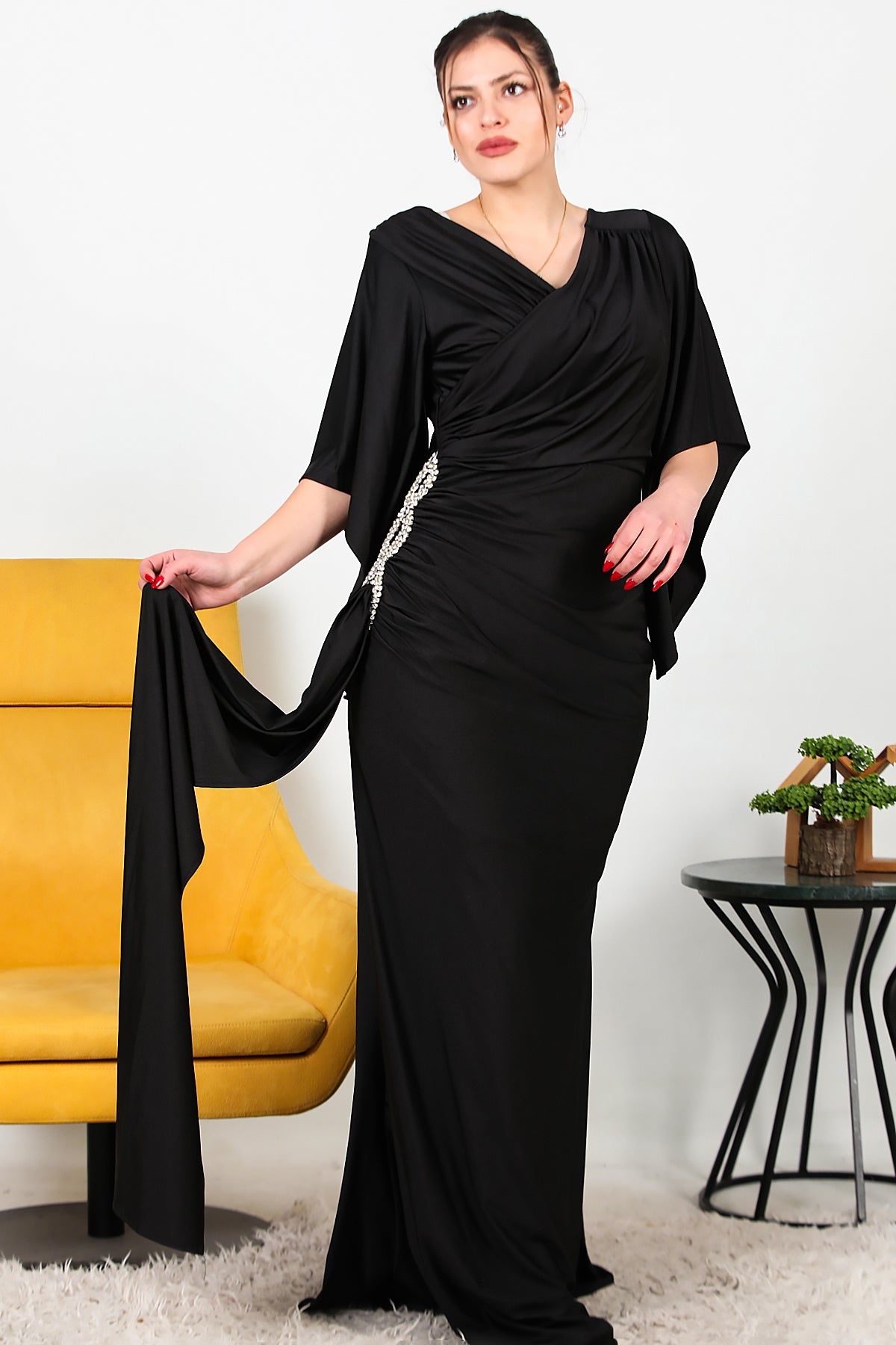Büyük Beden Yanı Taş Detay Uzun Abiye Siyah