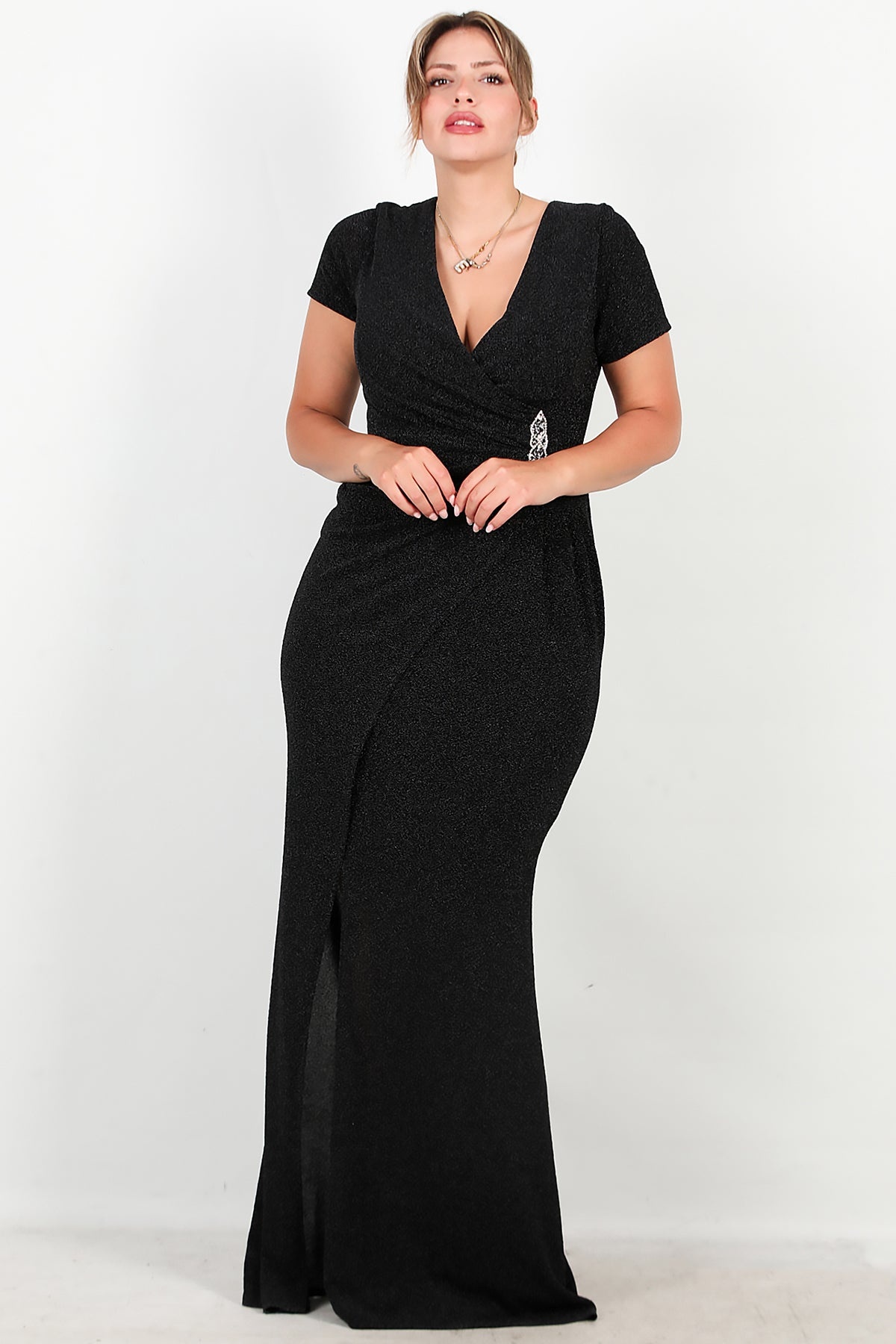 Büyük Beden Beli Taşlı Kısa Kol Uzun Simli Abiye Siyah