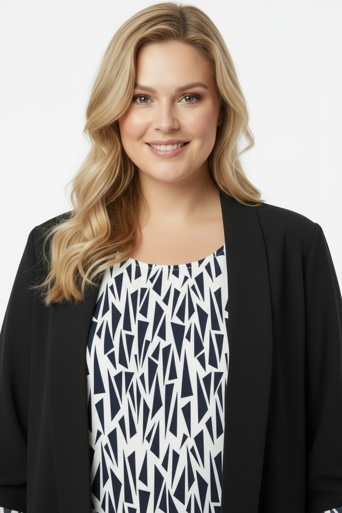 Büyük Beden Siyah Bluzlu Ceket - Geometrik Desenli İkili Takım