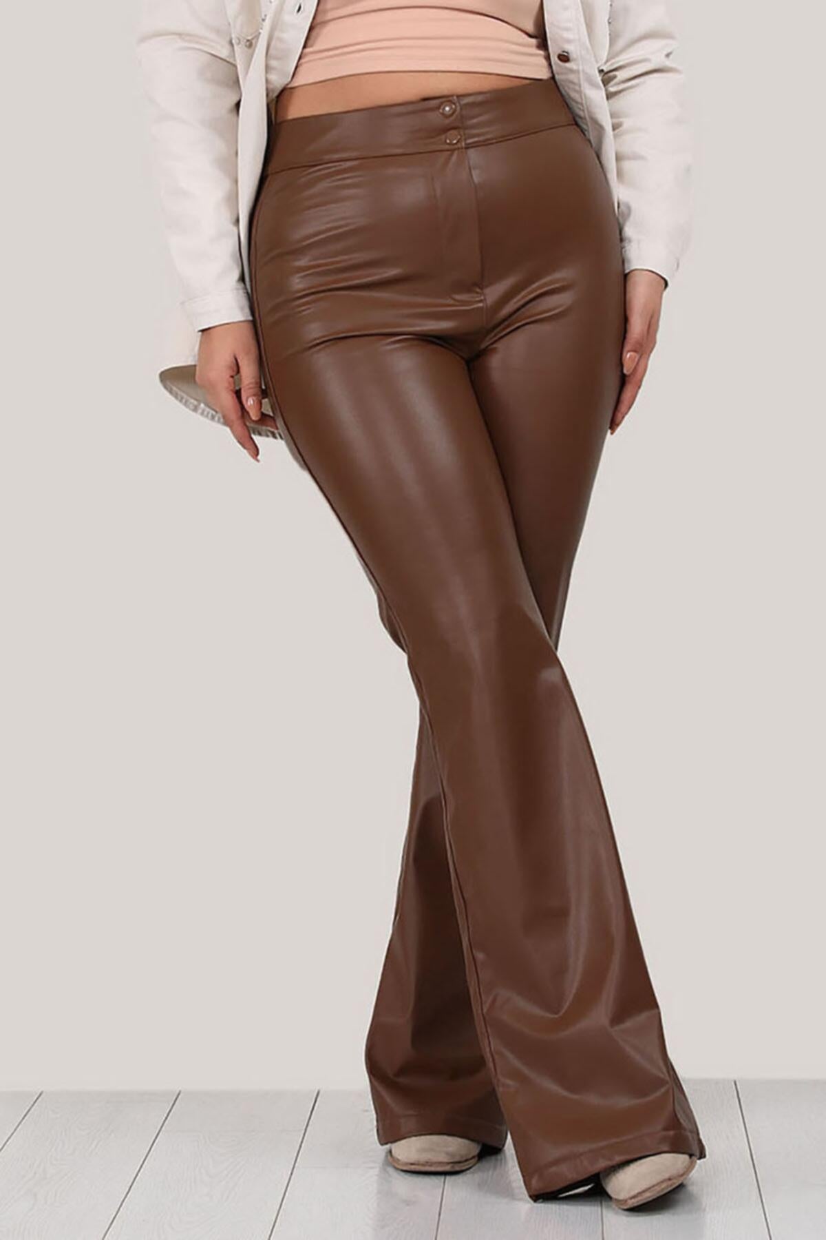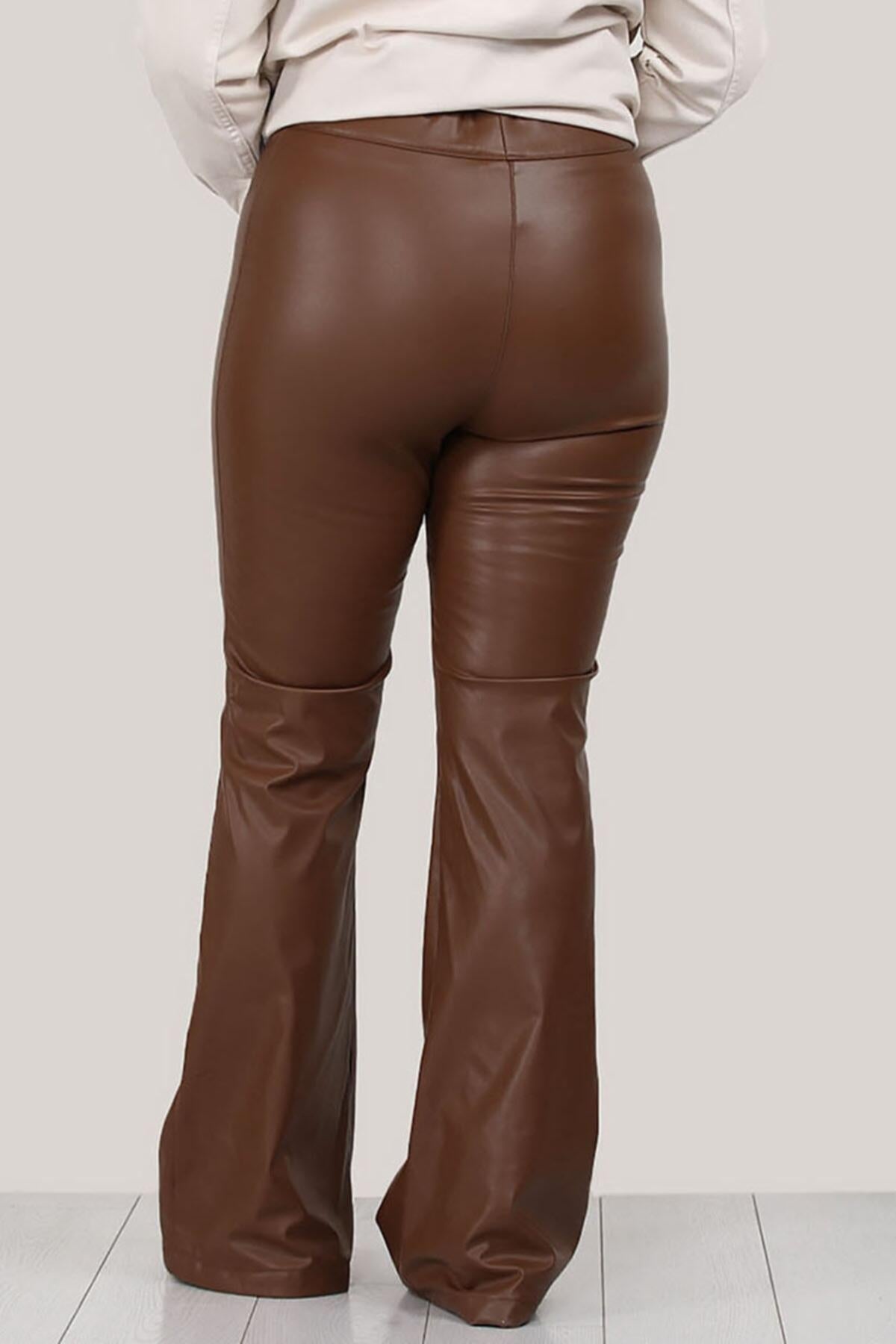 Büyük Beden Bol Paça Deri Pantolon Taba